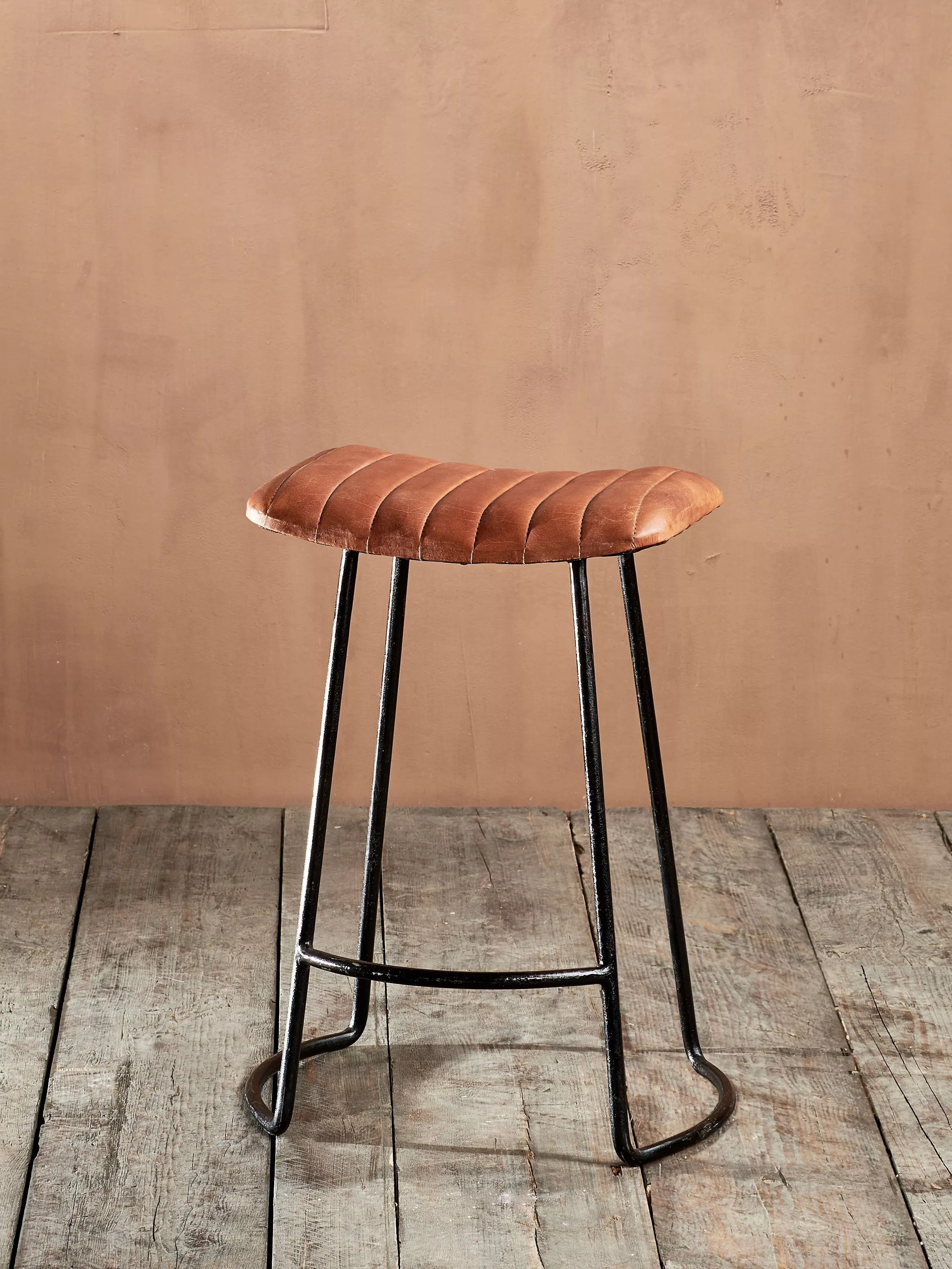 Elevate your kitchen space with the nkuku Narwana stool. Featuring a sturdy iron frame with a padded ribbed leather seat, the stool has a stylish iron footrest. Each stool is handmade in India by artisans using traditional techniques. Crafted from leather, a by-product, it's durable and the leather will enrich over time.