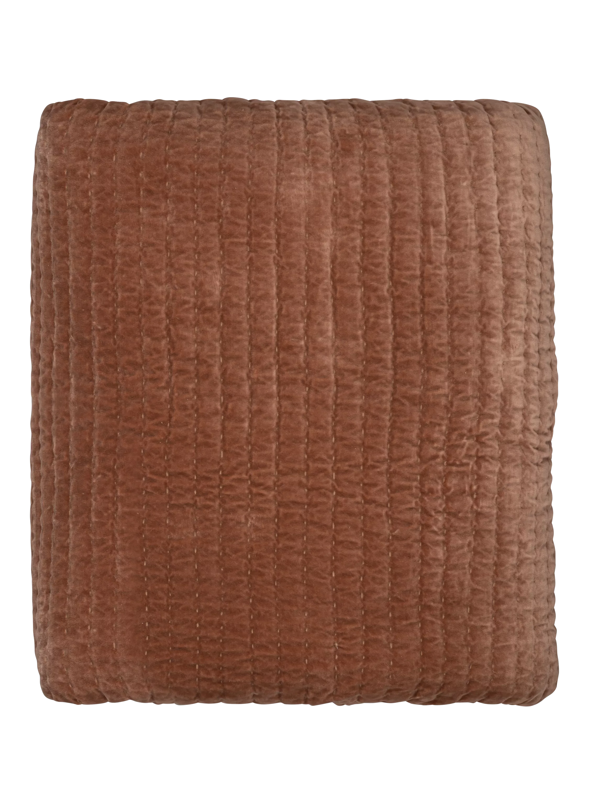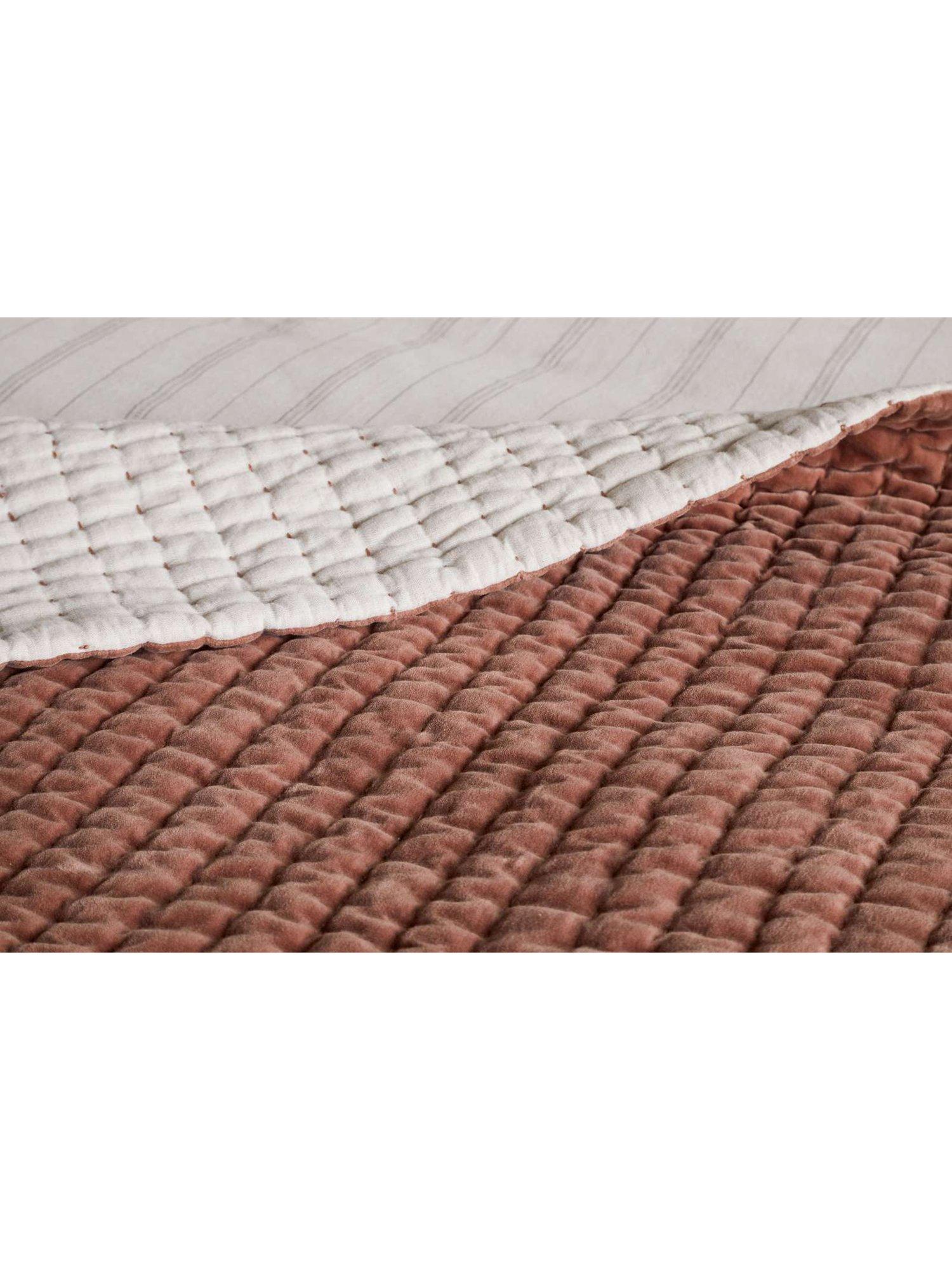 This luxurious quilted bedspread combines a warm rust cotton velvet top with a natural linen base, offering a beautiful contrast in texture and tone.