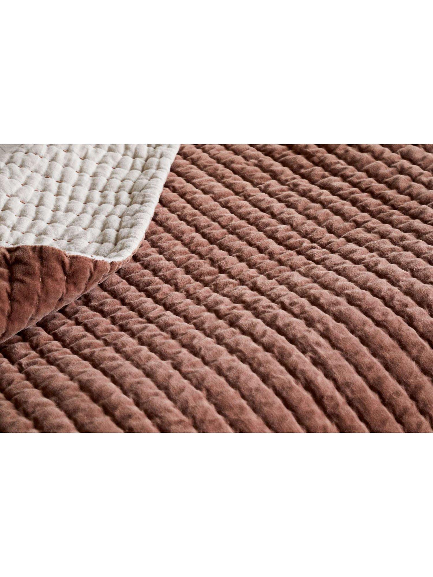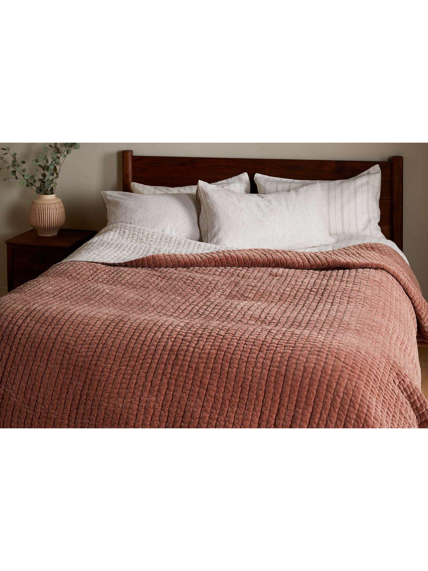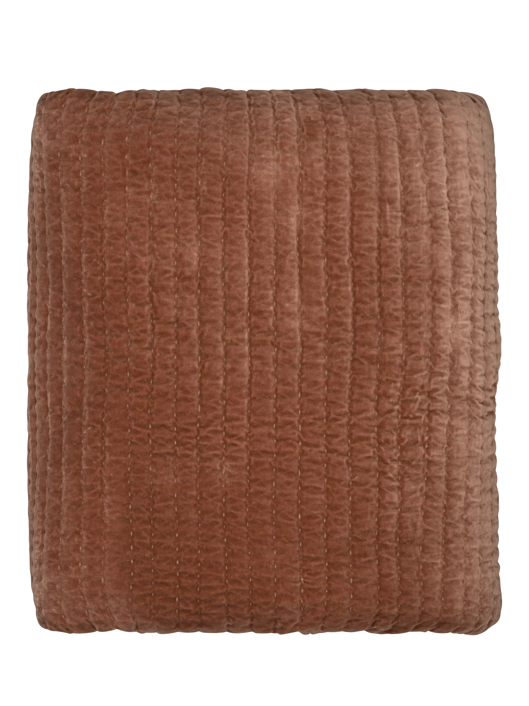 This luxurious quilted bedspread combines a warm rust cotton velvet top with a natural linen base, offering a beautiful contrast in texture and tone. The hand-stitched Kantha quilting adds subtle detail, while contrast stitching on the reverse provides a refined finish.