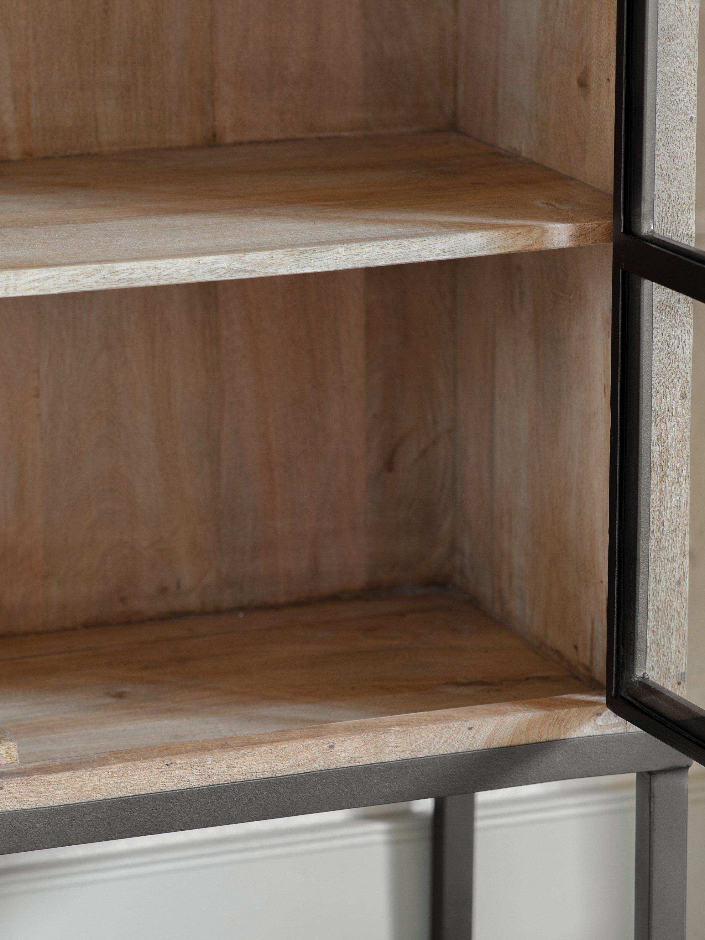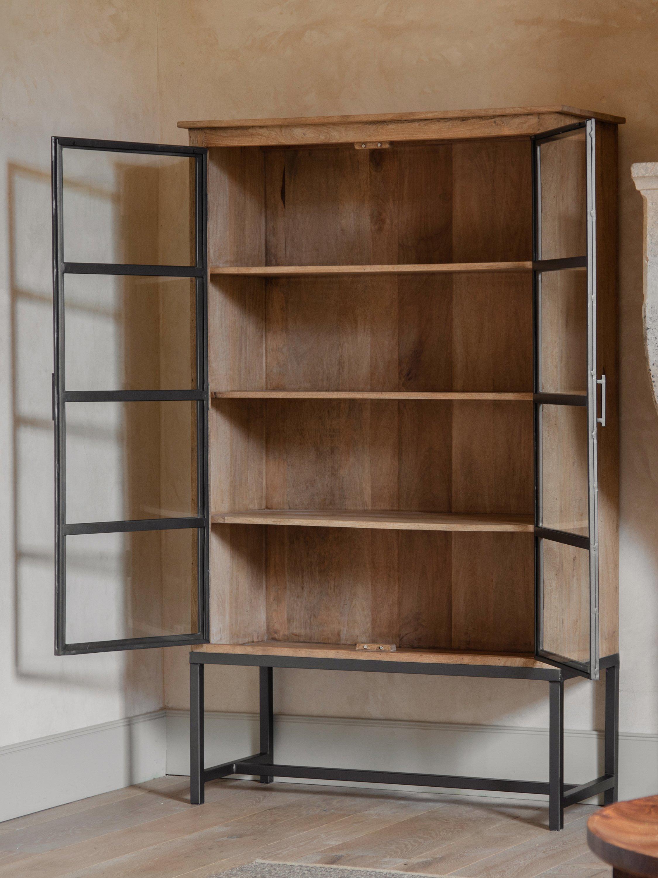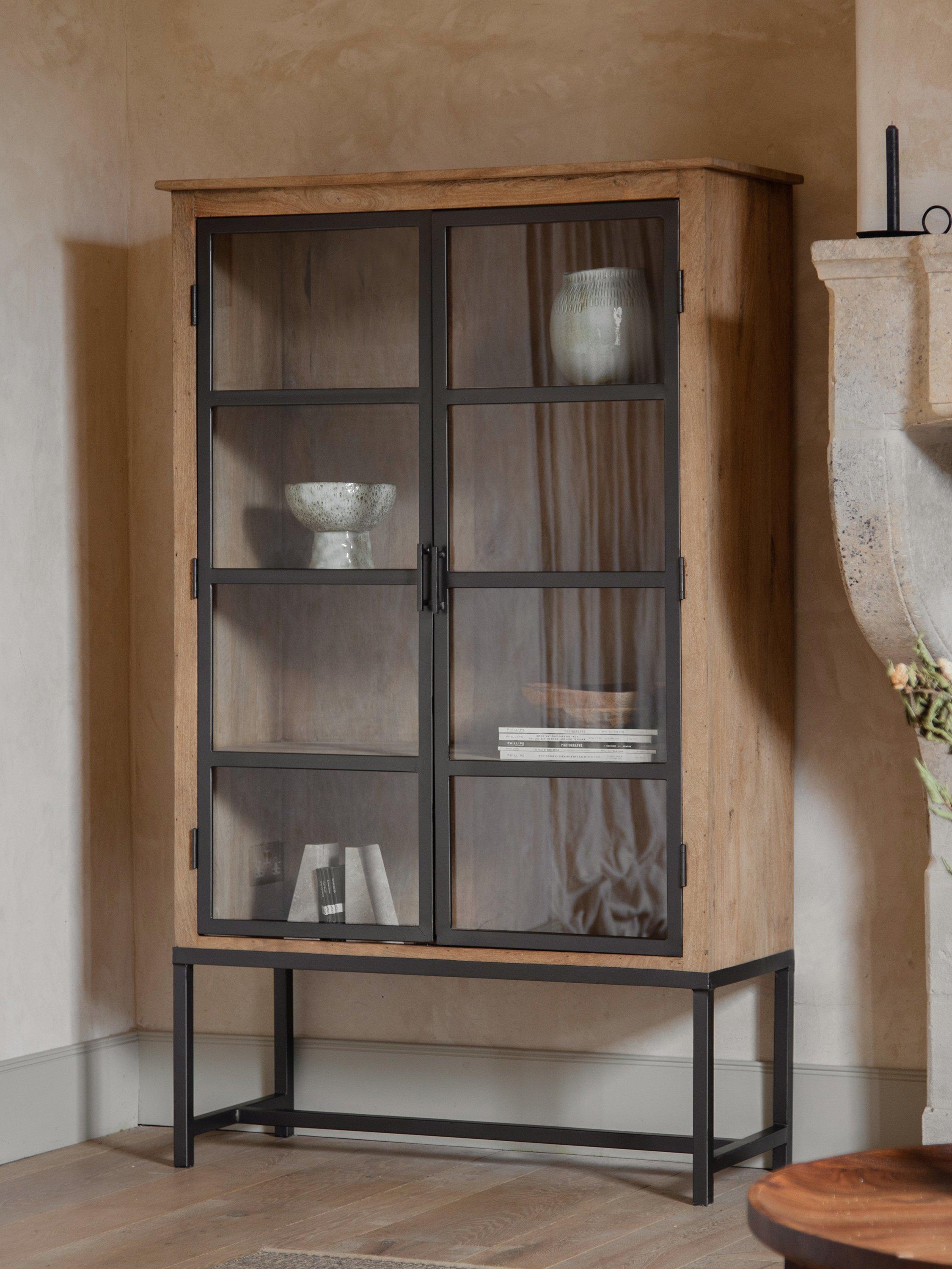 The elegant Nirvi cabinet has an antique black iron structure for an industrial aesthetic which is complemented by the warm natural tones of the mango wood cabinetry. Perfect for a hallway or living space to curate your choicest books and objet d’art, or in a kitchen as a handsome stand-alone crockery cupboard.