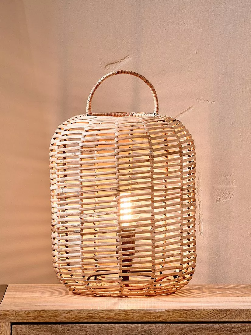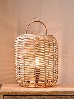 Natural wicker and unique design combine in this beautifully crafted table lamp. The small Noko light from nkuku is crafted from strands of wicker that diffuse and filter the light to produce a soft glow, casting shadows and adding interest to a room. Versatile and stylish, use in your space to create an ambient mood.