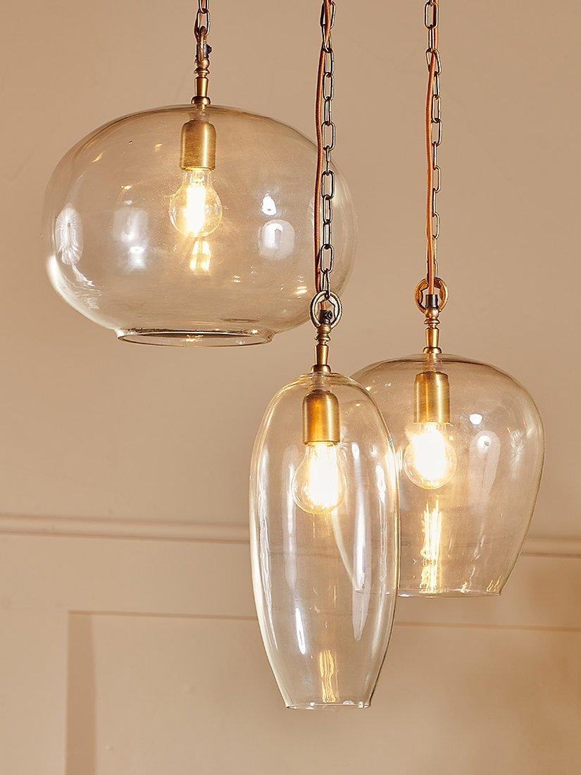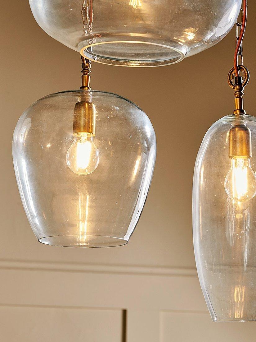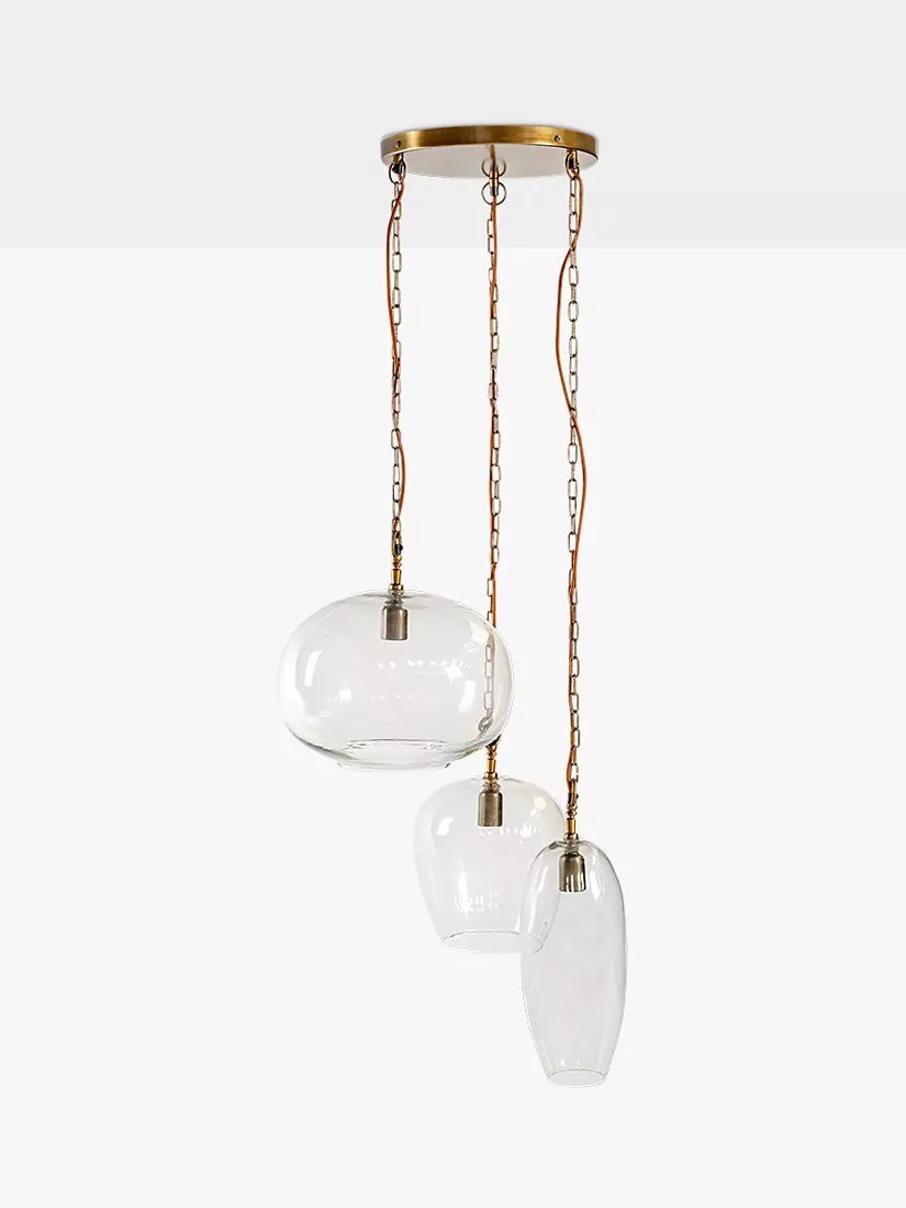 The Otoro pendant light is truly a standout piece. The individual organic shape of the recycled glass shades work beautifully together and their generous proportions combine to create an statement piece that will elevate your space, particularly a room with a high ceiling or stairwell. The simple fabric cable sits neatly in a brass ceiling rose and a brass chain supports each light.