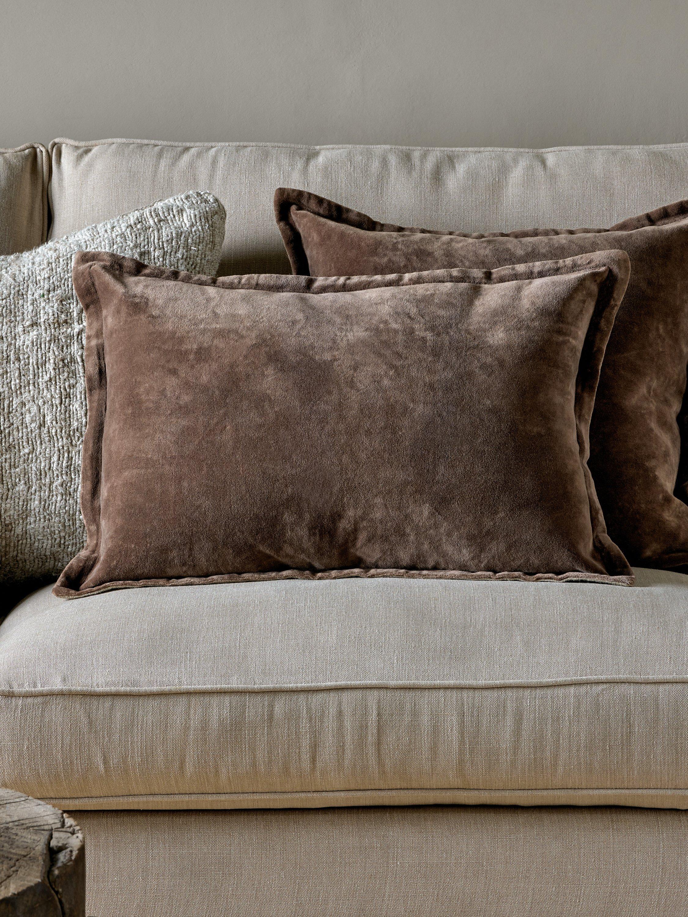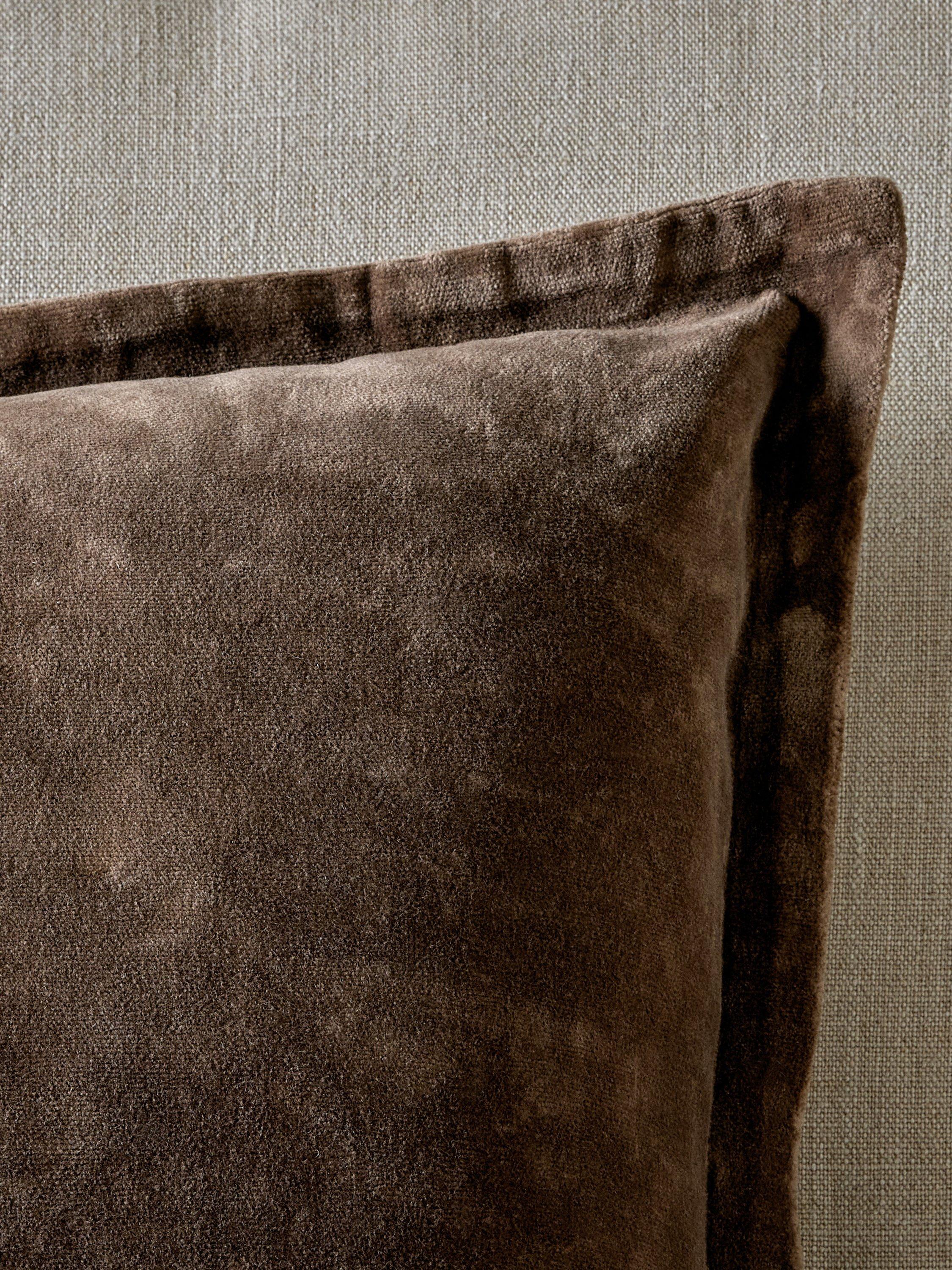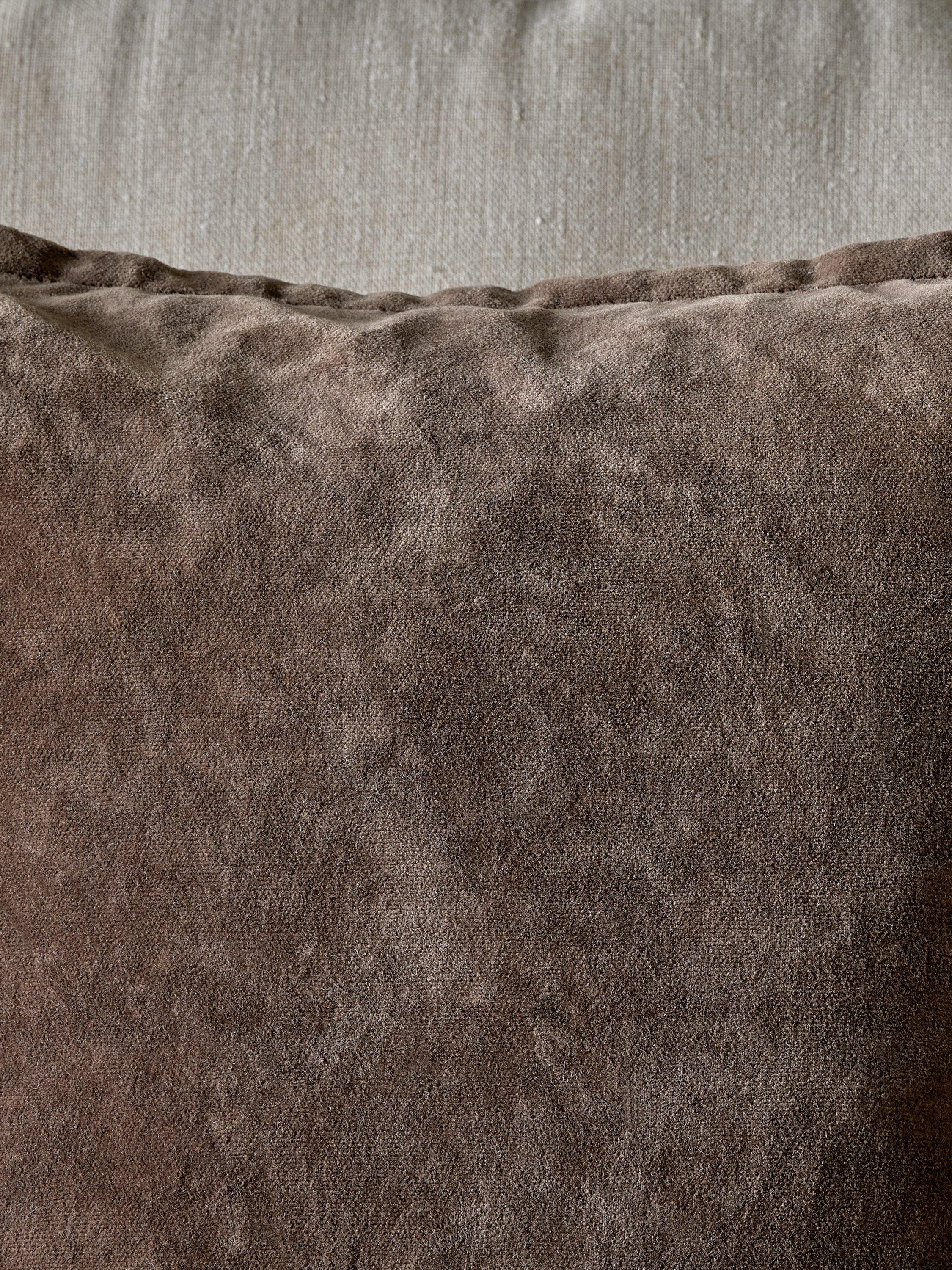 Luxurious and elegant, this cushion cover features a rich, thick velvet front in a beautiful rich brown colour. Backed with natural linen and finished with a flange edge, it combines luxurious texture with durable craftsmanship.The fabric is then woven on a loom, ensuring a soft, plush finish that brings both comfort and refined style to any seating area or bedroom.