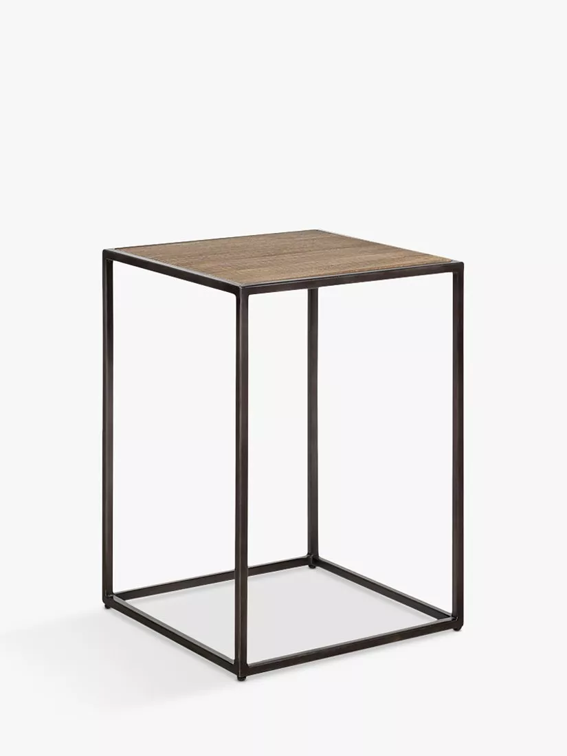 Contemporary, clean lines define the Rishin side table, with its sturdy iron frame in gun-metal grey and a mango-wood top in a dark walnut finish. The surface has been hand-grooved for an interesting reeded effect that adds texture to the piece. Practical and versatile, it's a simple design and shape that pairs easily with an armchair and a table lamp to create a cosy reading spot in any nook or corner of the home.