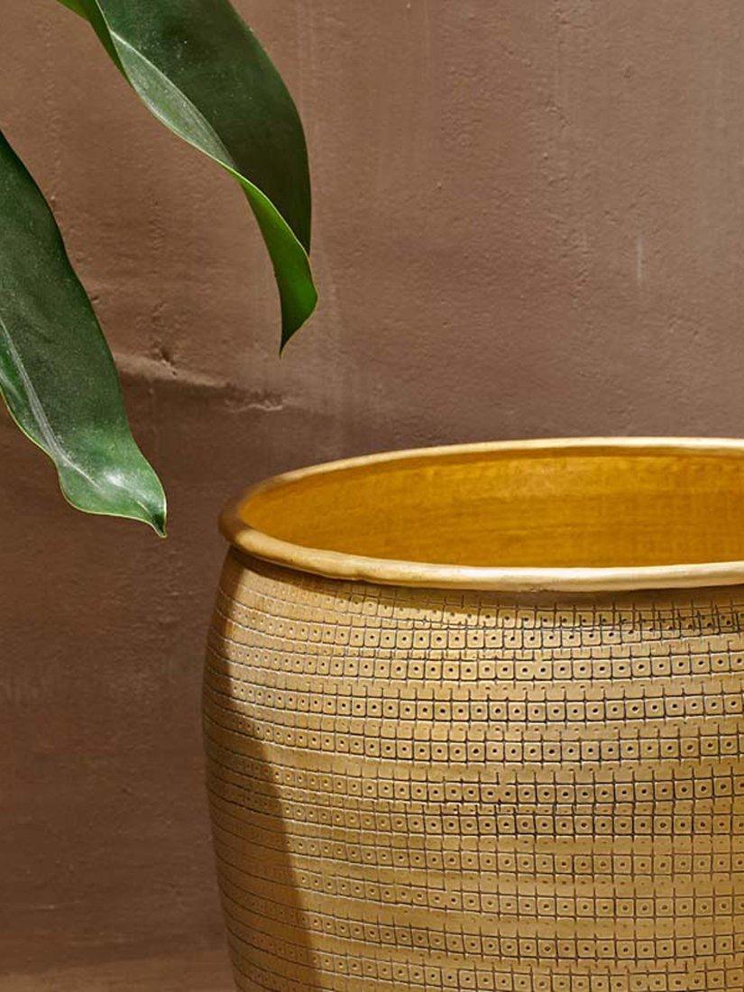 The nkuku Tembesi planter in antique brass adds a pop of colour and warmth to your home interior with its golden hues.