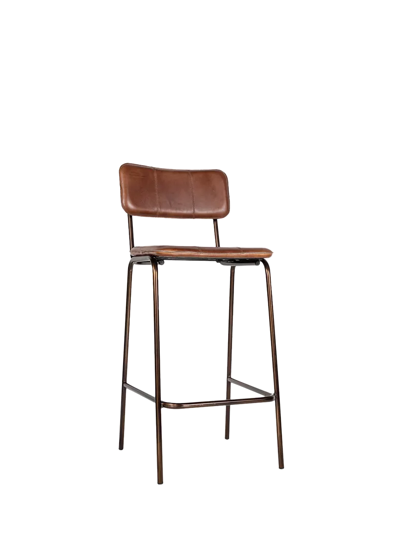 This practical, durable, and comfortable design has a simple, solid iron frame and footrest, with a padded seat and back support. Upholstered in handmade buffalo leather, it is stitched to create three panels which adds a stylish design detail to the piece.Designed to work with a kitchen island, counter or breakfast bar, the Ukari counter chair tucks neatly under a kitchen countertop.