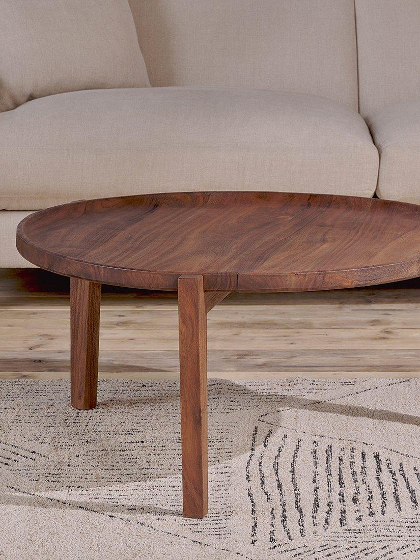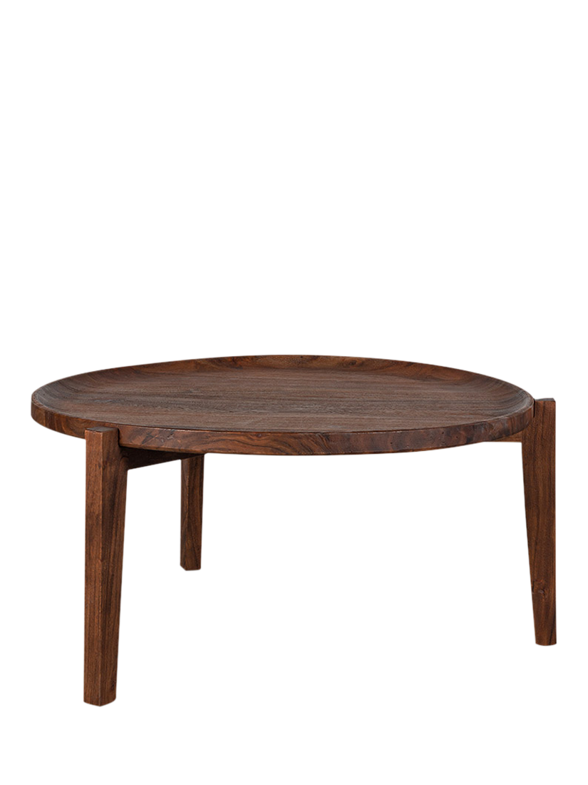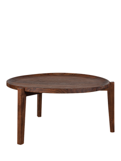 This sophisticated coffee table is made from mango wood that we love for its warm natural tones and beautiful grain. With a stained dark finish, the circular table top has a gently sloped edge that sits into a base formed by three leg supports, creating a simple yet stylish silhouette, perfect for displaying a few choice decorative objects and favourite books.