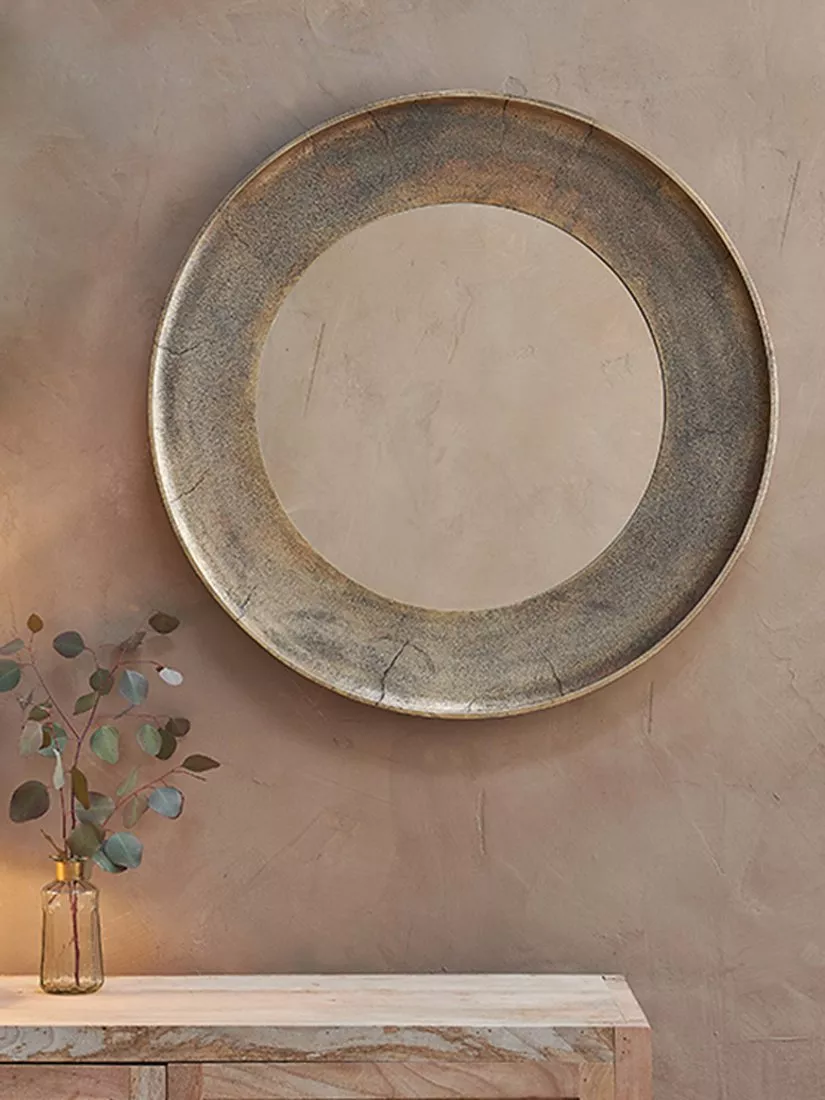 The nkuku Yakira mirror has a beautiful antique brass frame with a stunning textured border and circular design. This mirror is handcrafted by skilled artisans in India using traditional techniques.