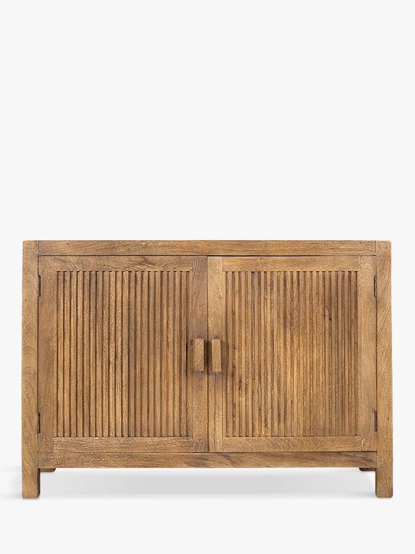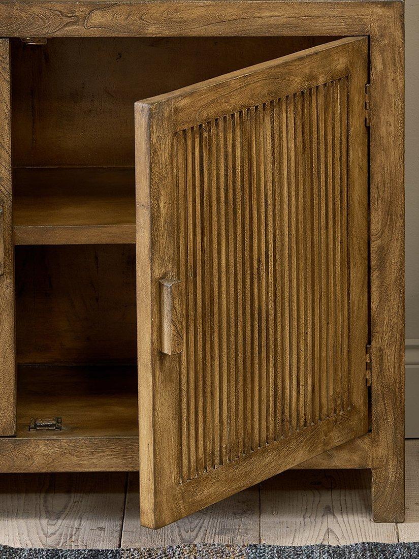 nkuku's Yasha sideboard, made from sustainable mango wood, has a beautiful patina and is finished with a walnut wash. Block handles and a simple reeded design on the front panels add interest and texture.