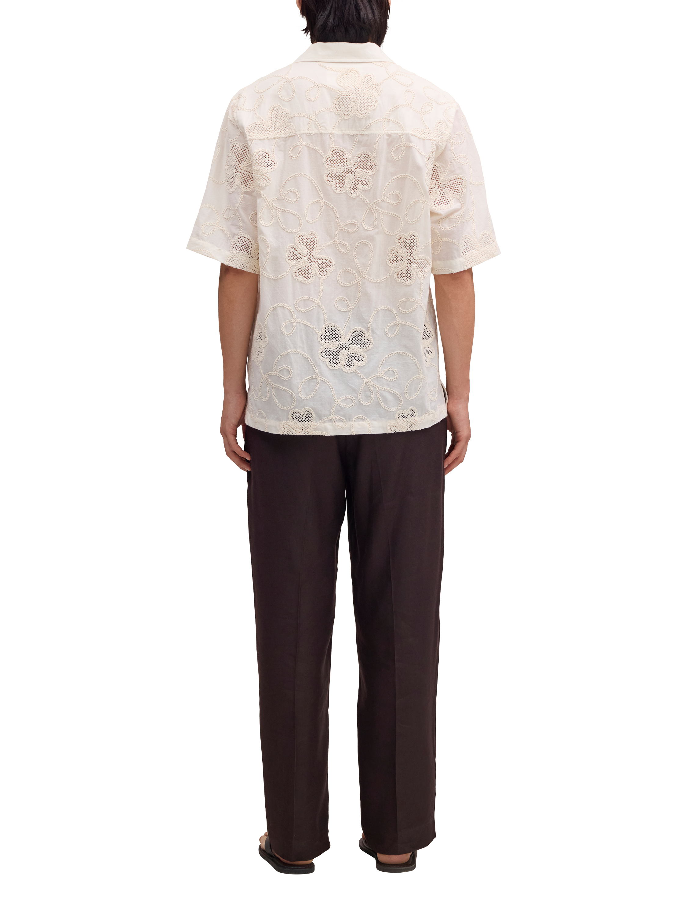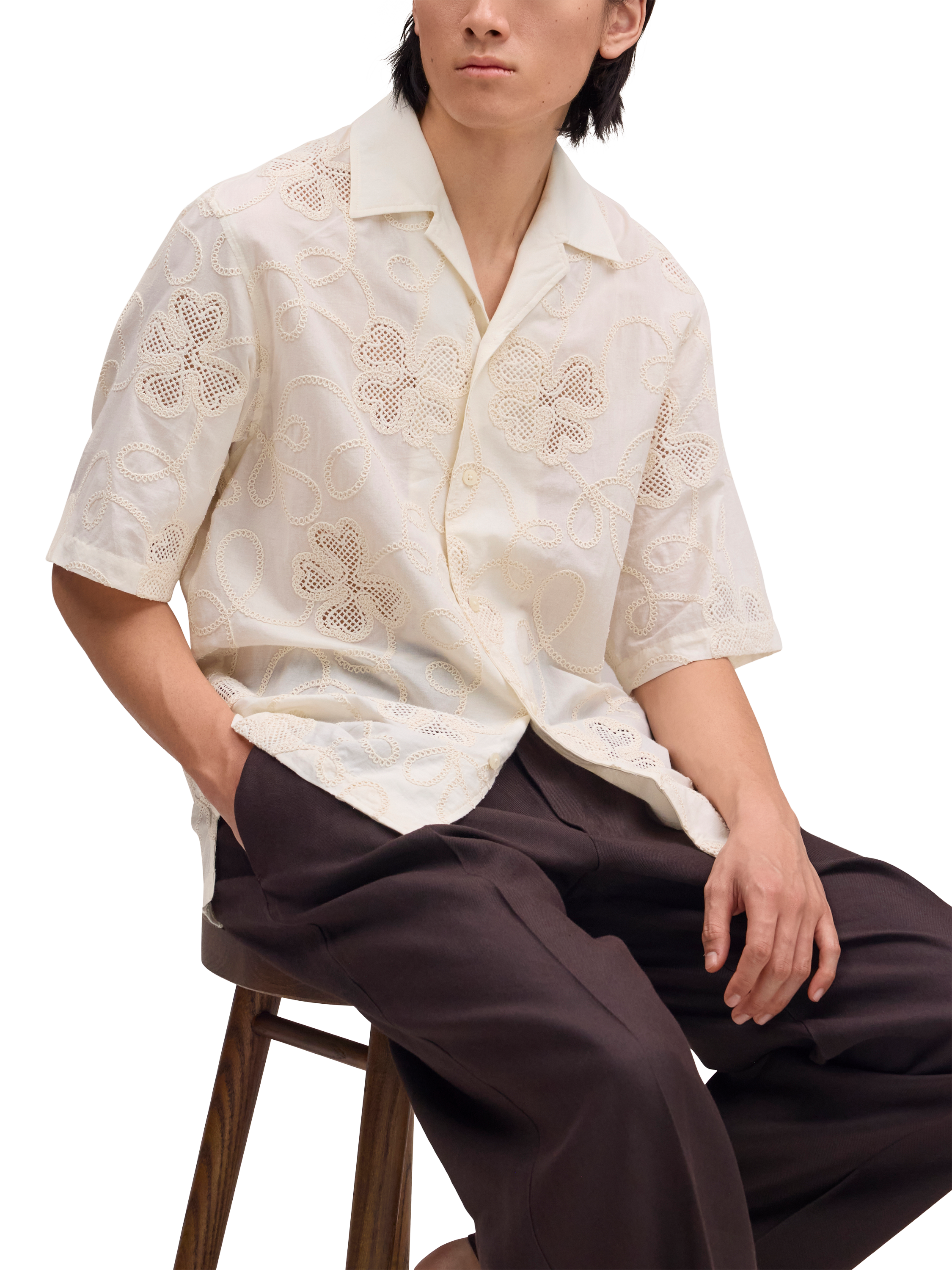 Relaxed short sleeve shirt made from organic cotton with a crisp poplin texture. The embroidered cut-out pattern results in an airy, open-texture structure.