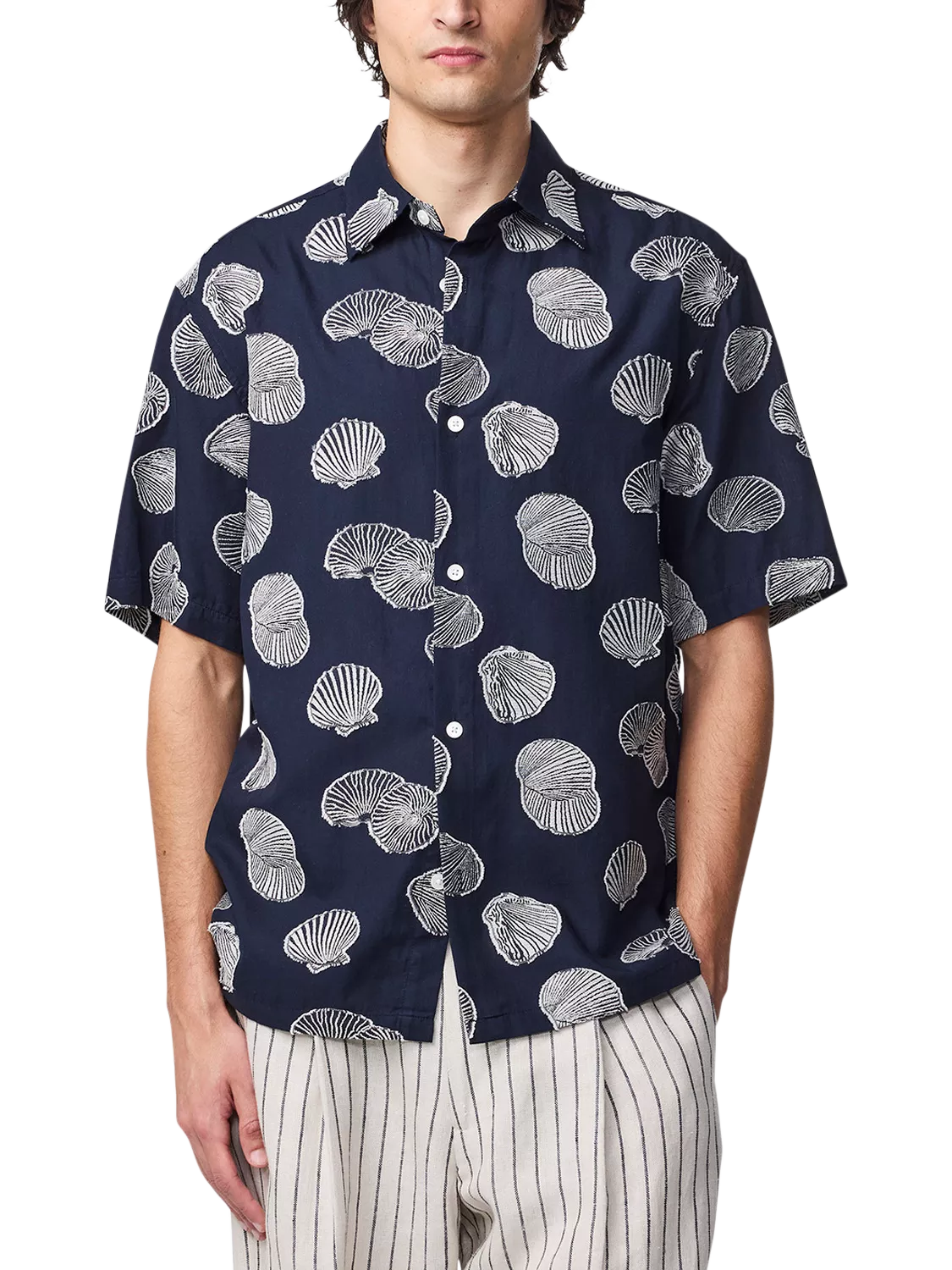 A casual shirt crafted from a cotton Fil Coupé jacquard complete with Mother-of-Pearl buttons.