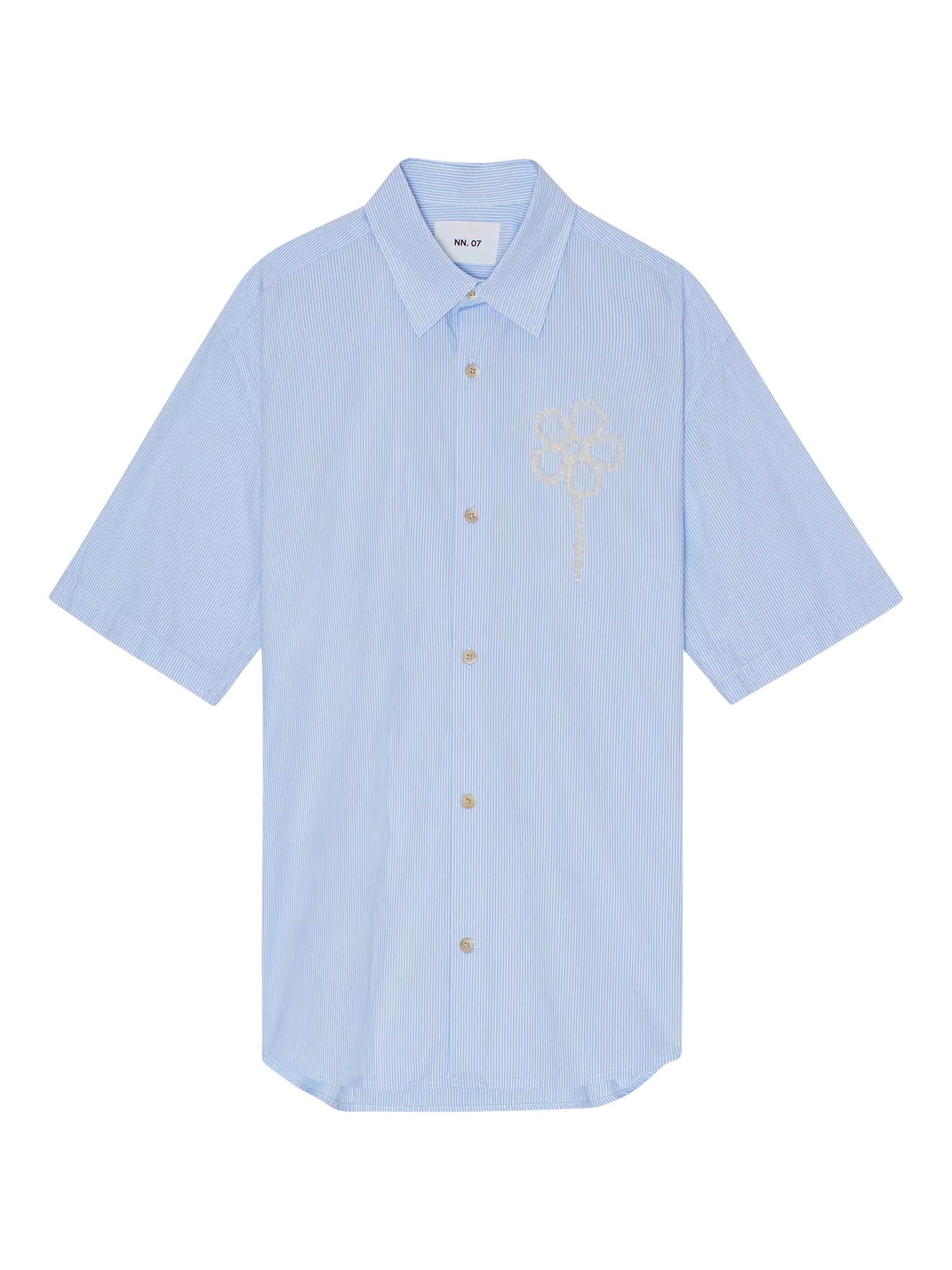 Short-sleeve button-up shirt crafted in crisp cotton fabric, topped with custom NN.07 logo and fastened with engraved Mother-of-Pearl buttons with a bouclé flower embroidery at the chest.