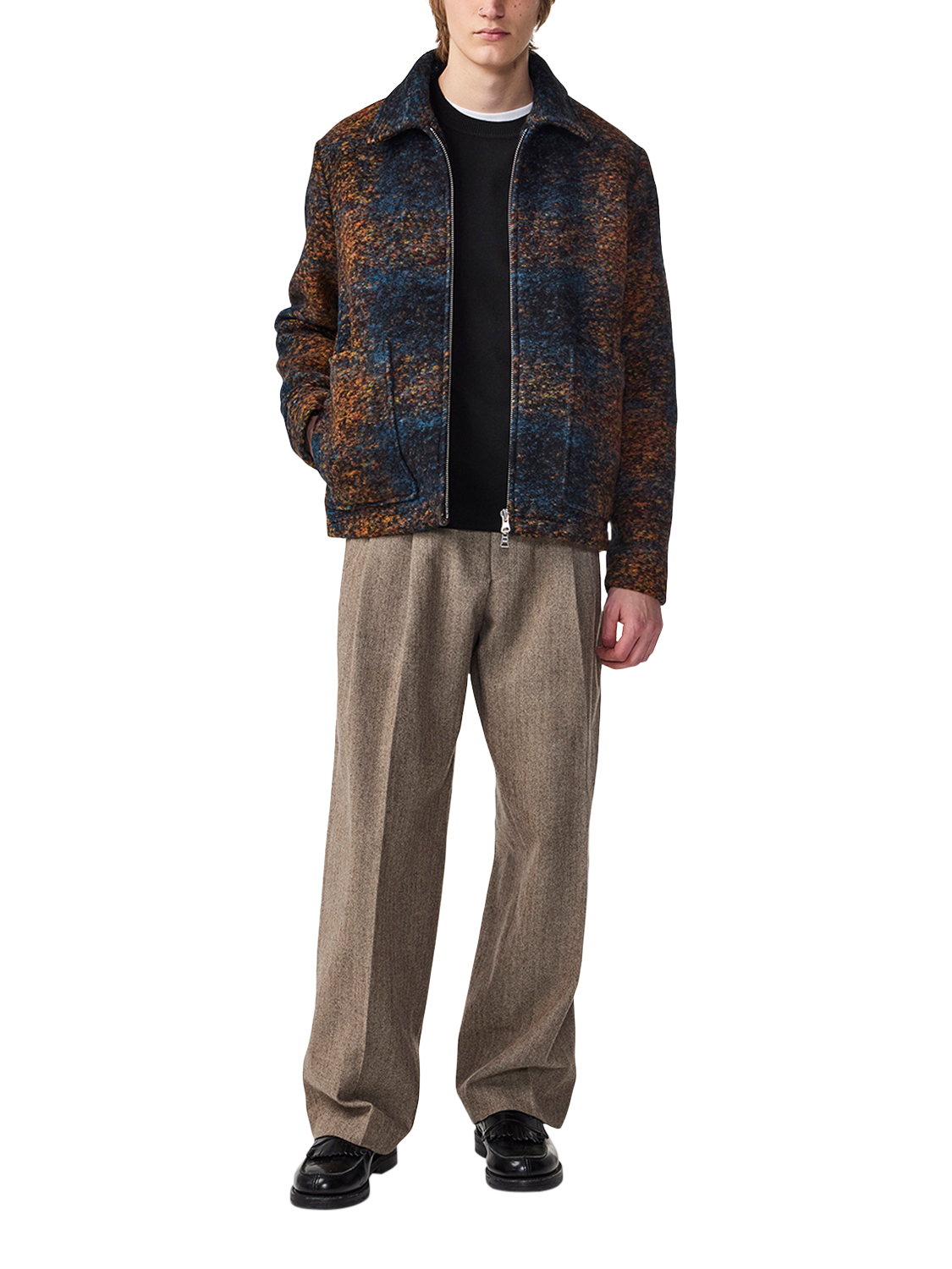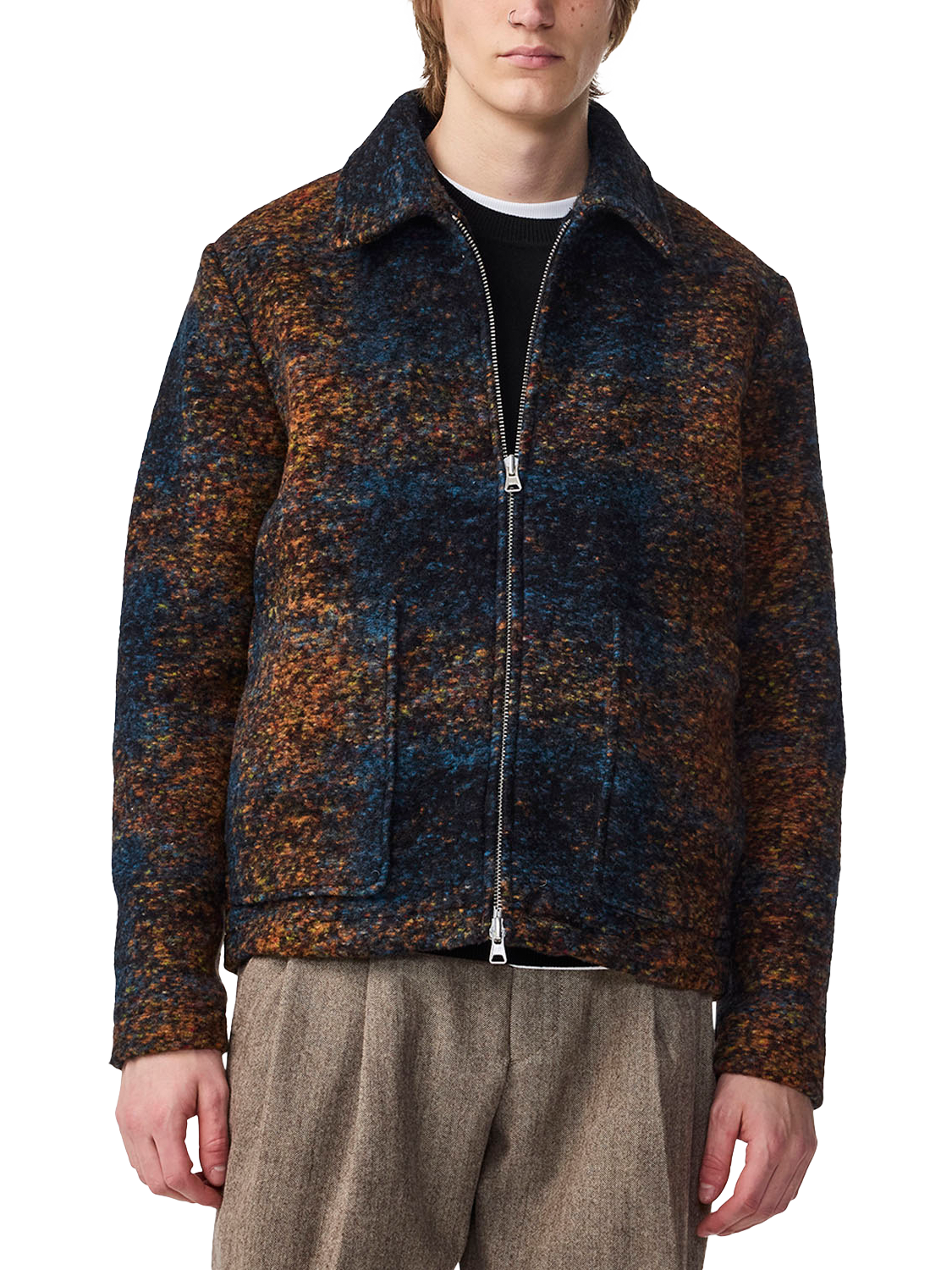 Crafted from a heavyweight wool-blend in jacquard weaving, the Gael jacket is a long-lasting statement piece. It is finished with a chunky two-way zipper and hidden inner pockets.