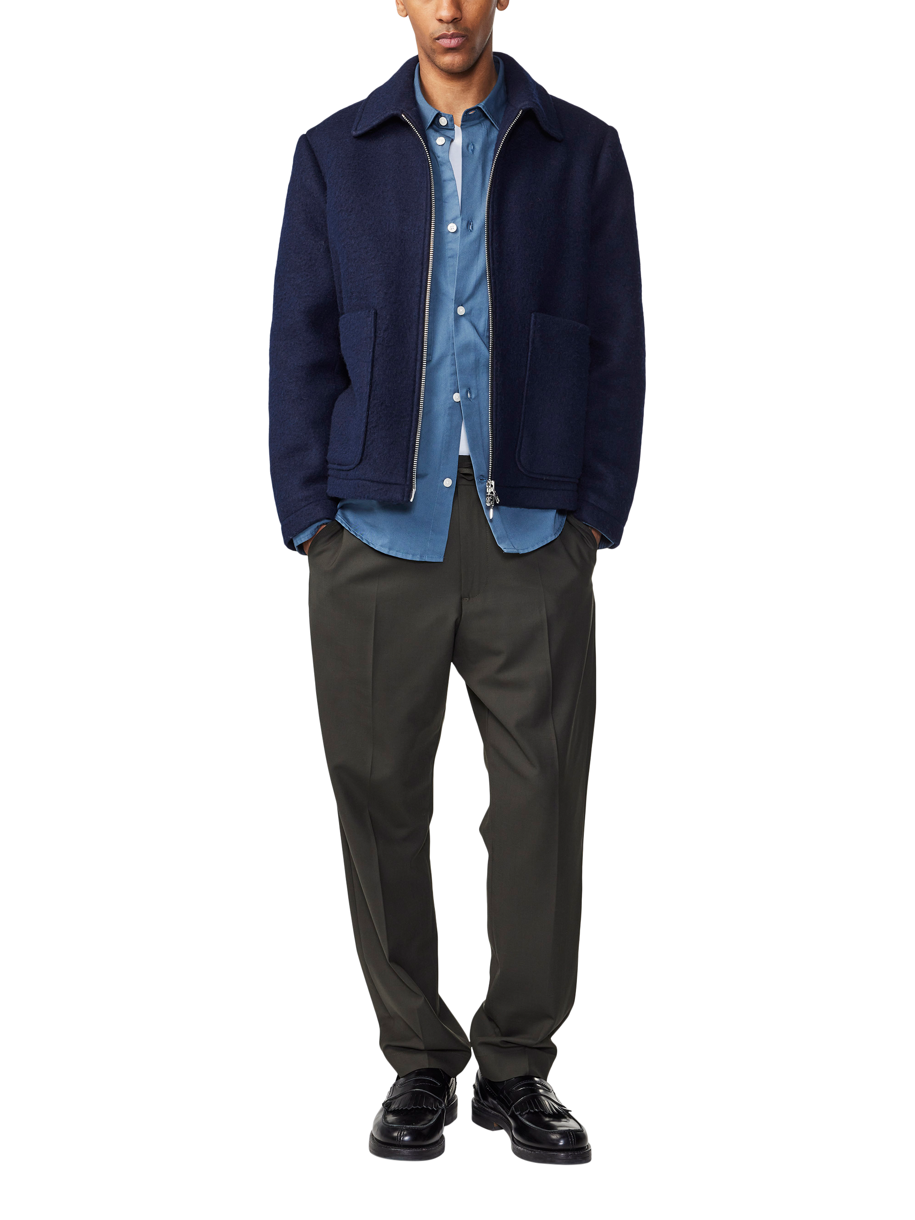 Inspired by the fit and fabrication of an old school stadium jacket. Features a yarn-dyed checkered pattern crafted in a heavily brushed wool-blend.