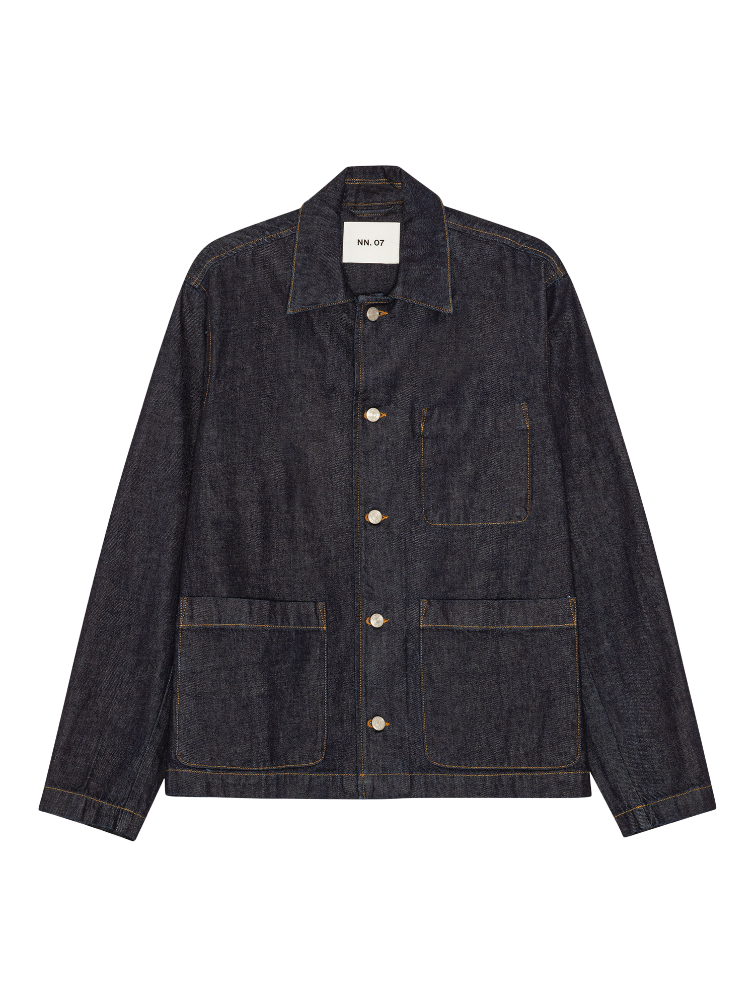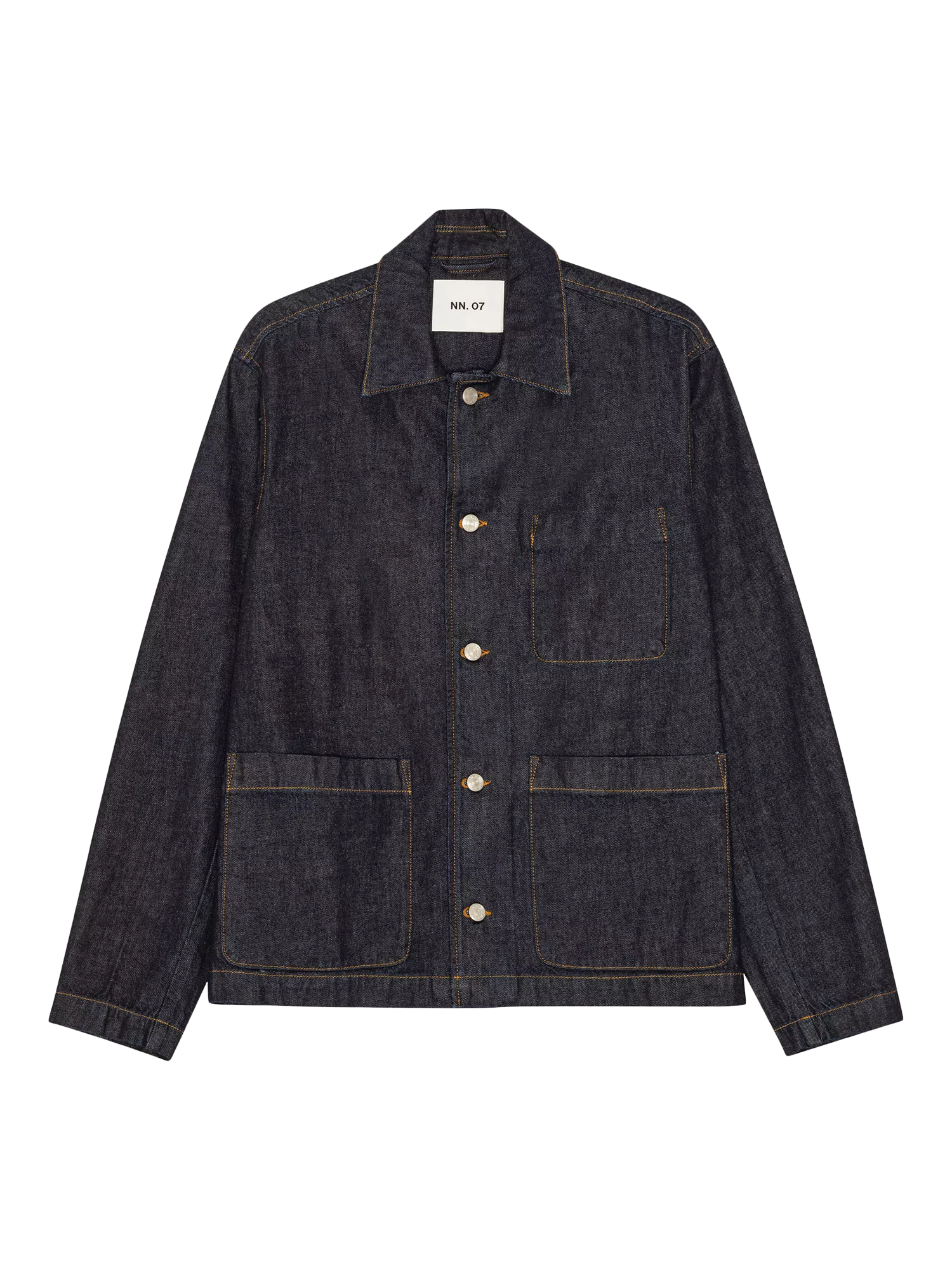 Hybrid jacket crafted from raw organic cotton rigid denim with a rinse wash. Offers a relaxed, boxy fit with large patch pockets, NN.07 logo jeans buttons, and an interior pocket for practicality.
