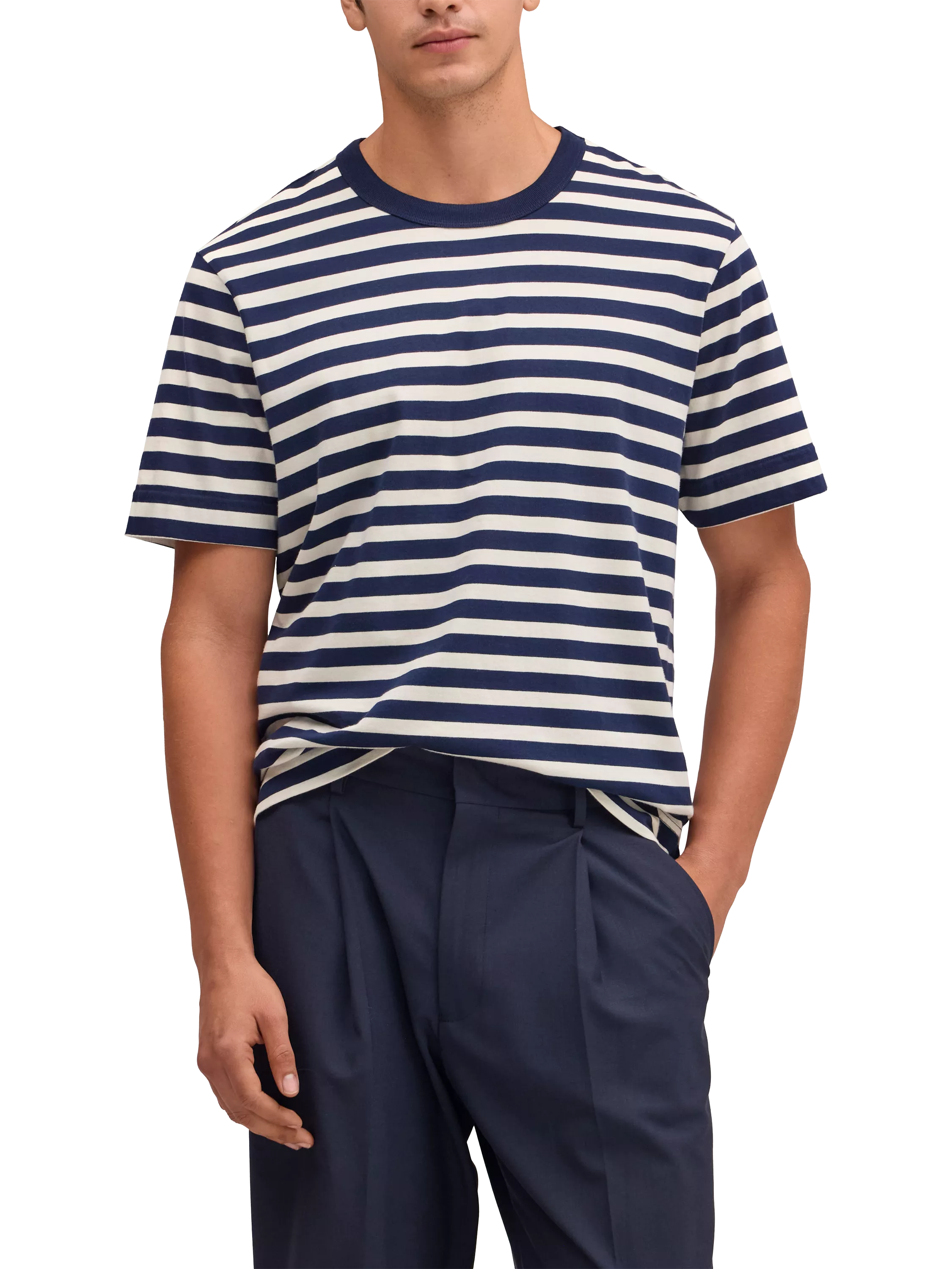 Short sleeve t-shirt made from long staple cotton, offering a soft and silky handfeel. With its clean aesthetic, rib binding, and wide hems, it delivers comfort and rich colours.