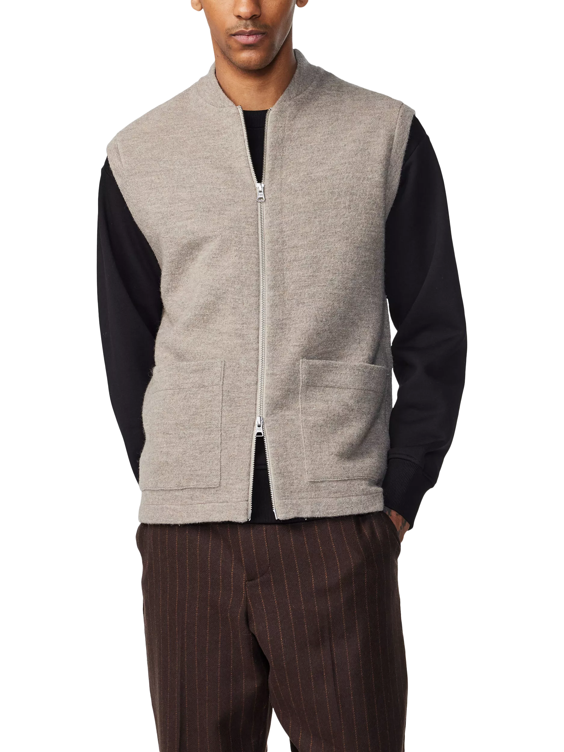 A zip-fastened vest crafted from soft merino wool. Finished with a minimalist bomber-style collar and square twin pockets.