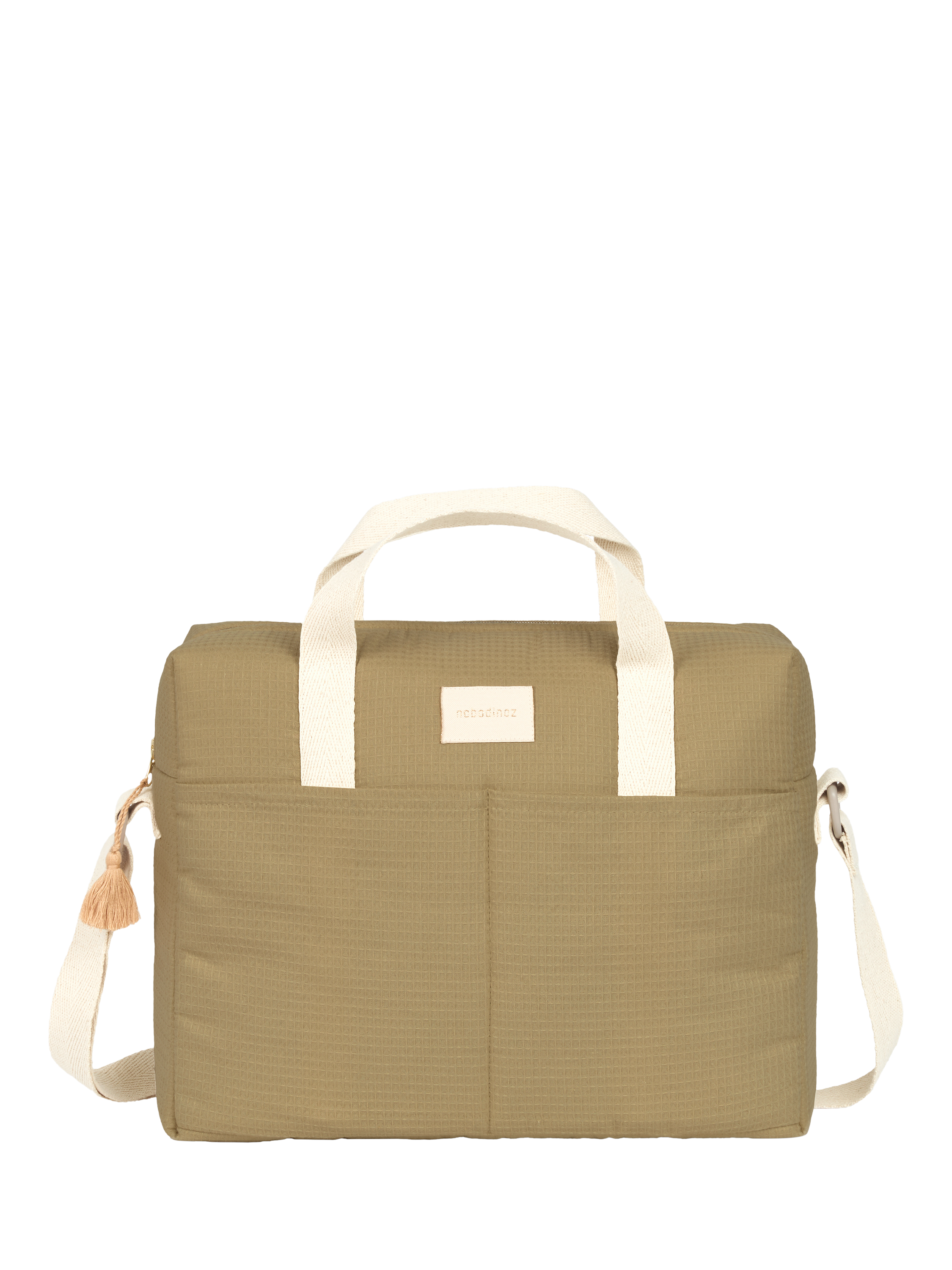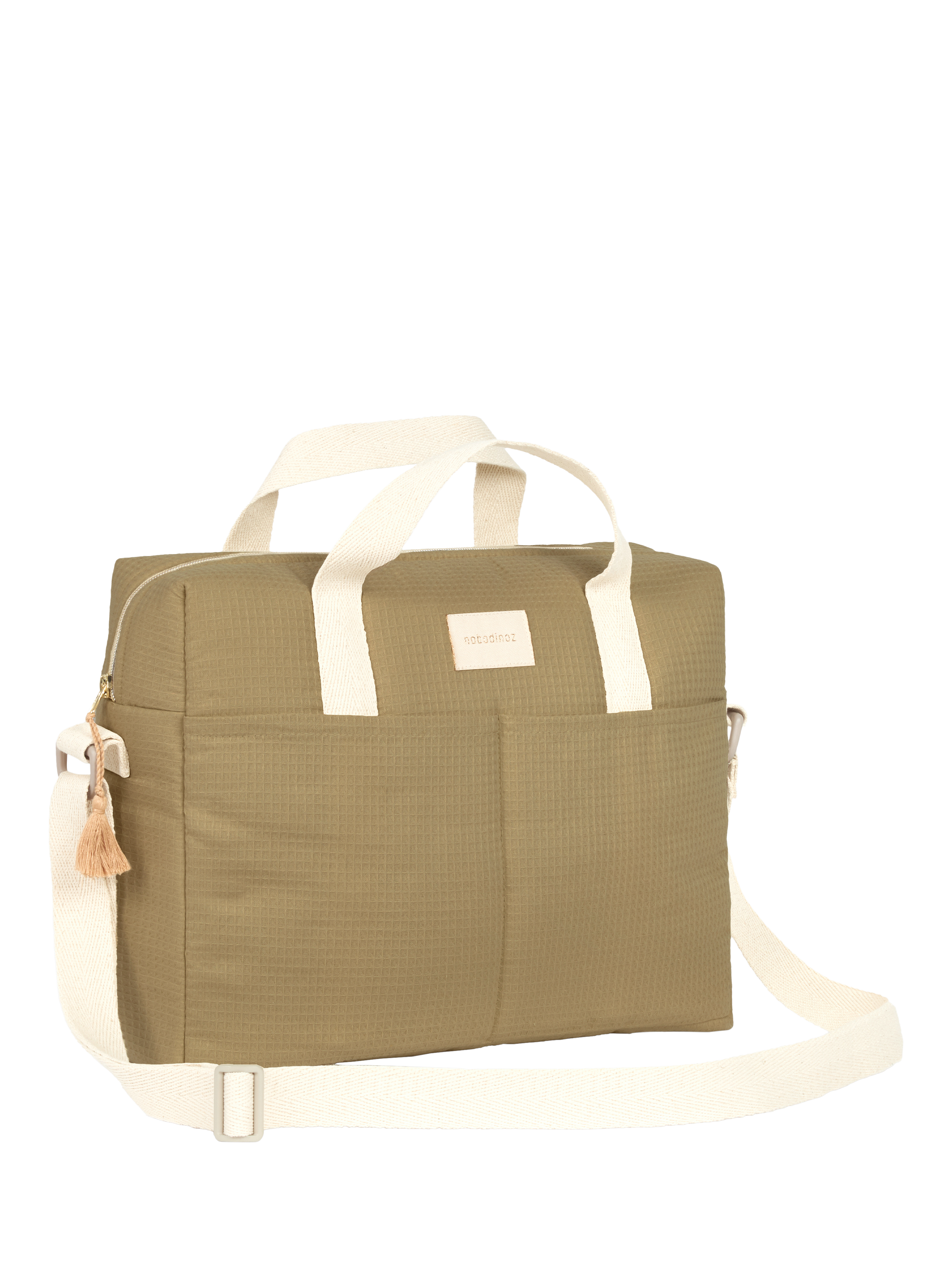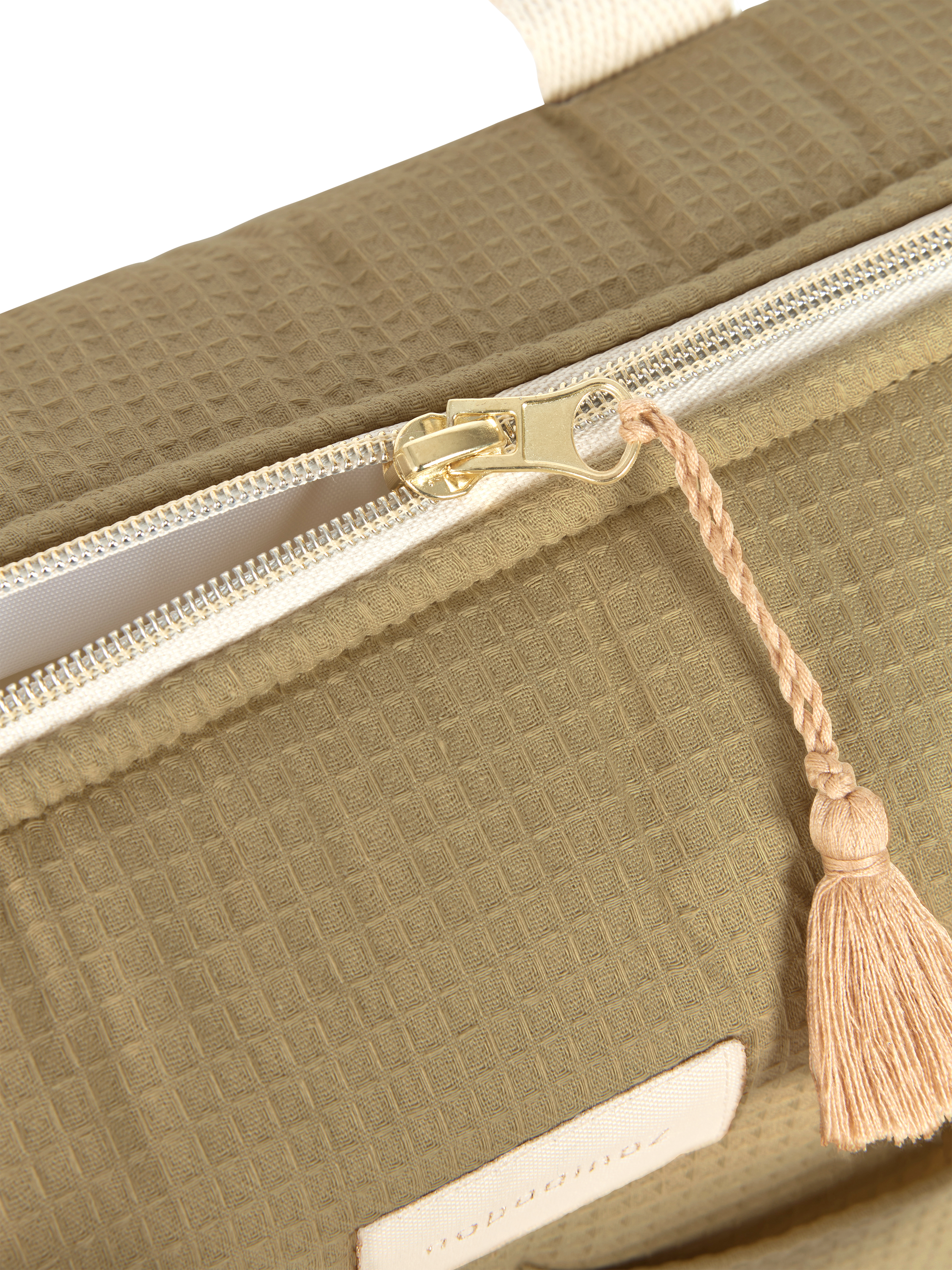 The Gala changing bag in cotton honeycomb has a waterproof interior and two inner pockets for baby's bits and pieces. There's also two outside pockets for what you need right at your fingertips. Thanks to its braided handles you can hang it on your pram or carry it on your shoulder. The honeycomb drawing is exclusive, designed in collaboration with Nobodinoz's Barcelona weavers.