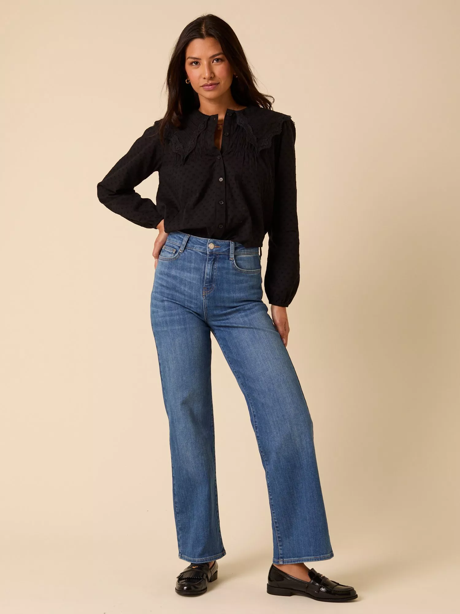Quiet romance. With lace, embroidery and an oversized collar, this blouse is the perfect subtle statement. It's a light, airy fit that's perfect for tucking in or flowing free.
