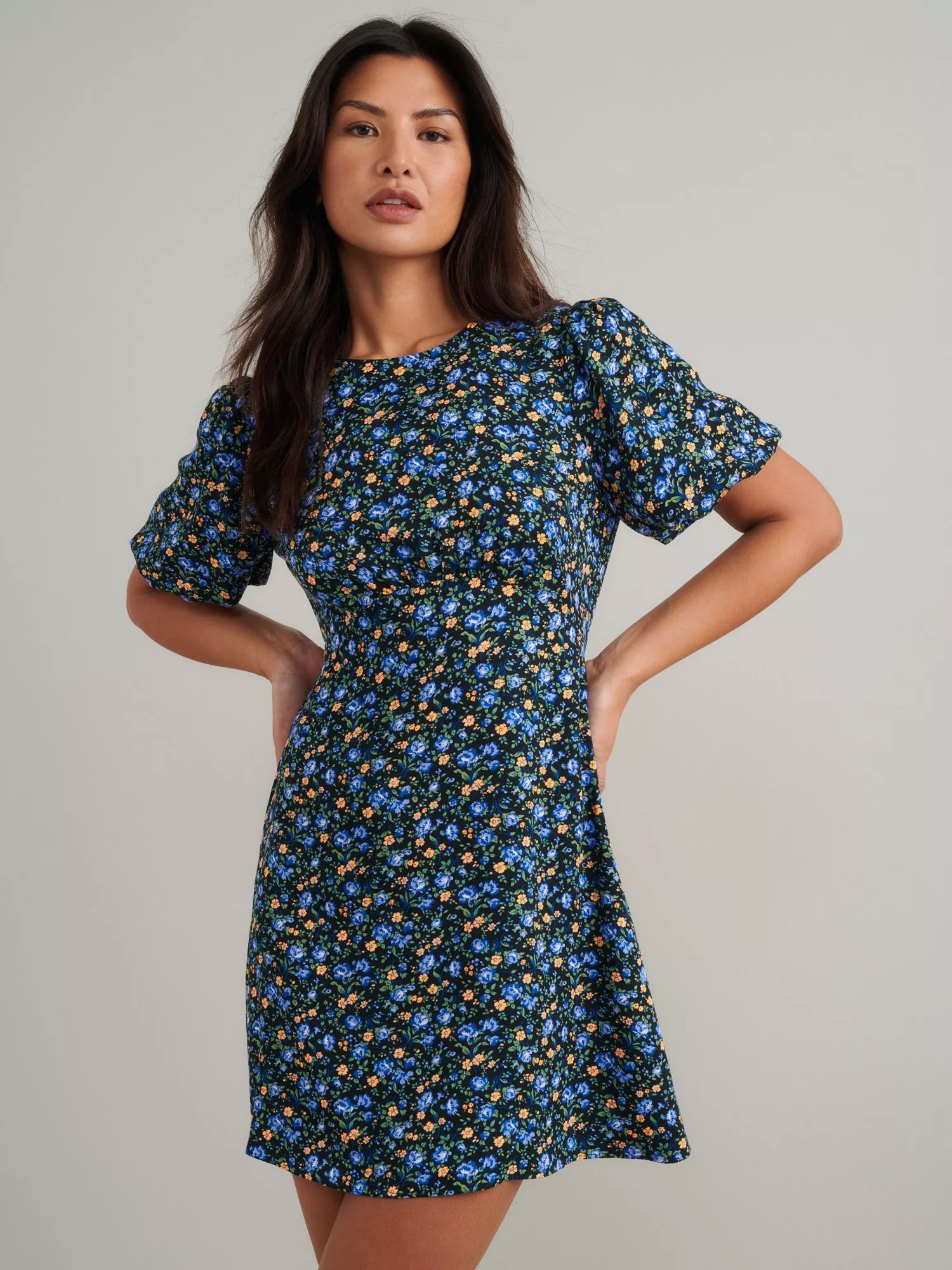 Dress her up or dial her down. This floral print dress will take you from day to evening in an instant. We love her puff sleeves and swishy skirt. Style yours with black knee high boots and throw over a black cardigan.