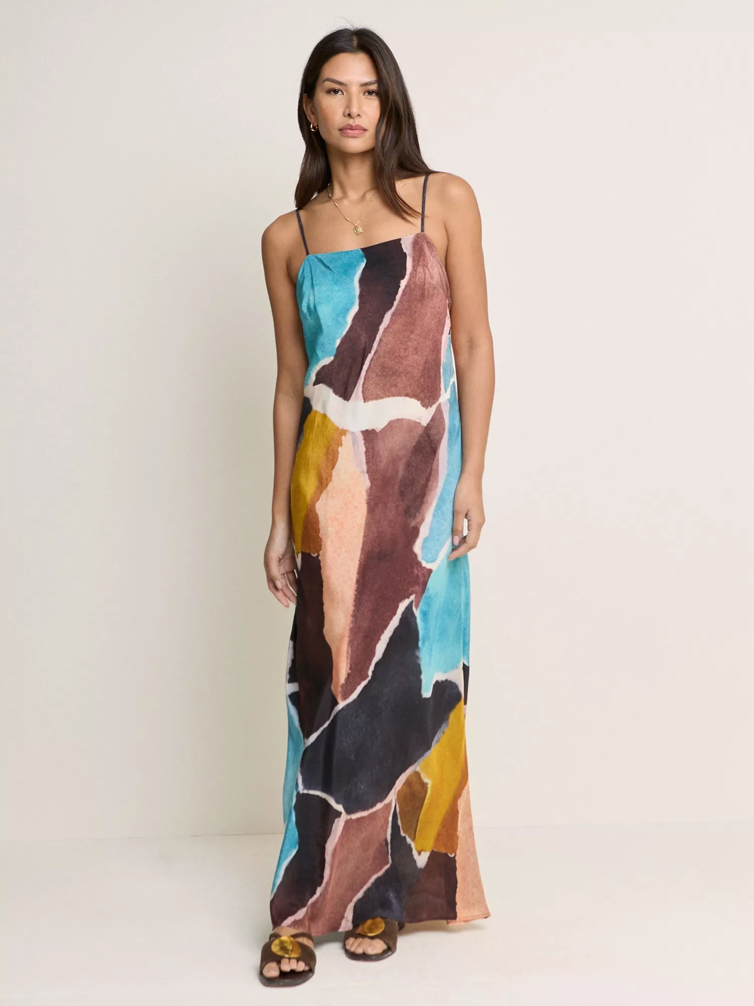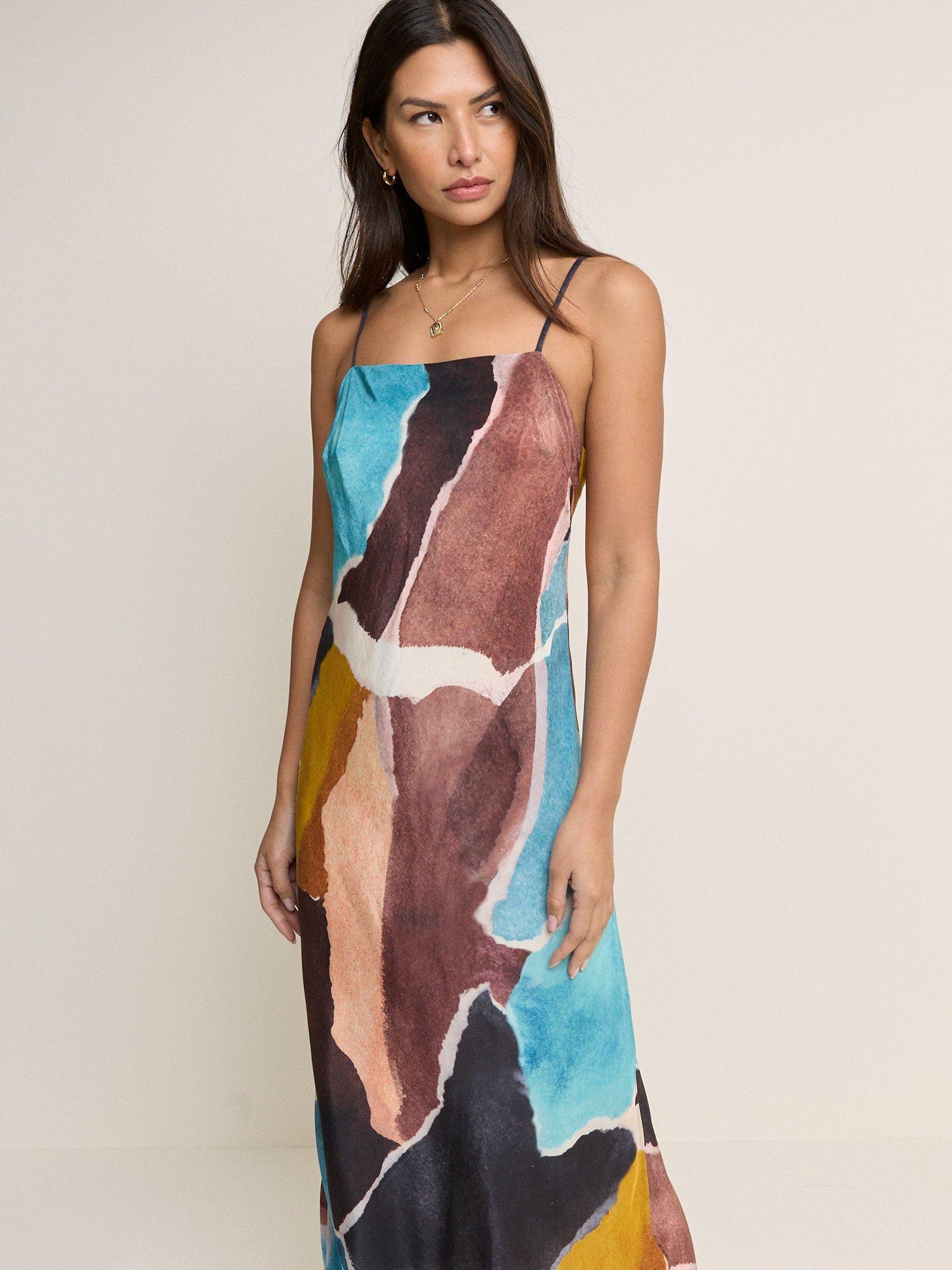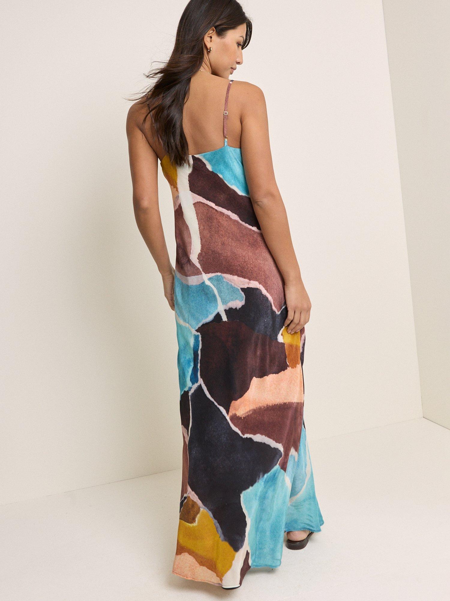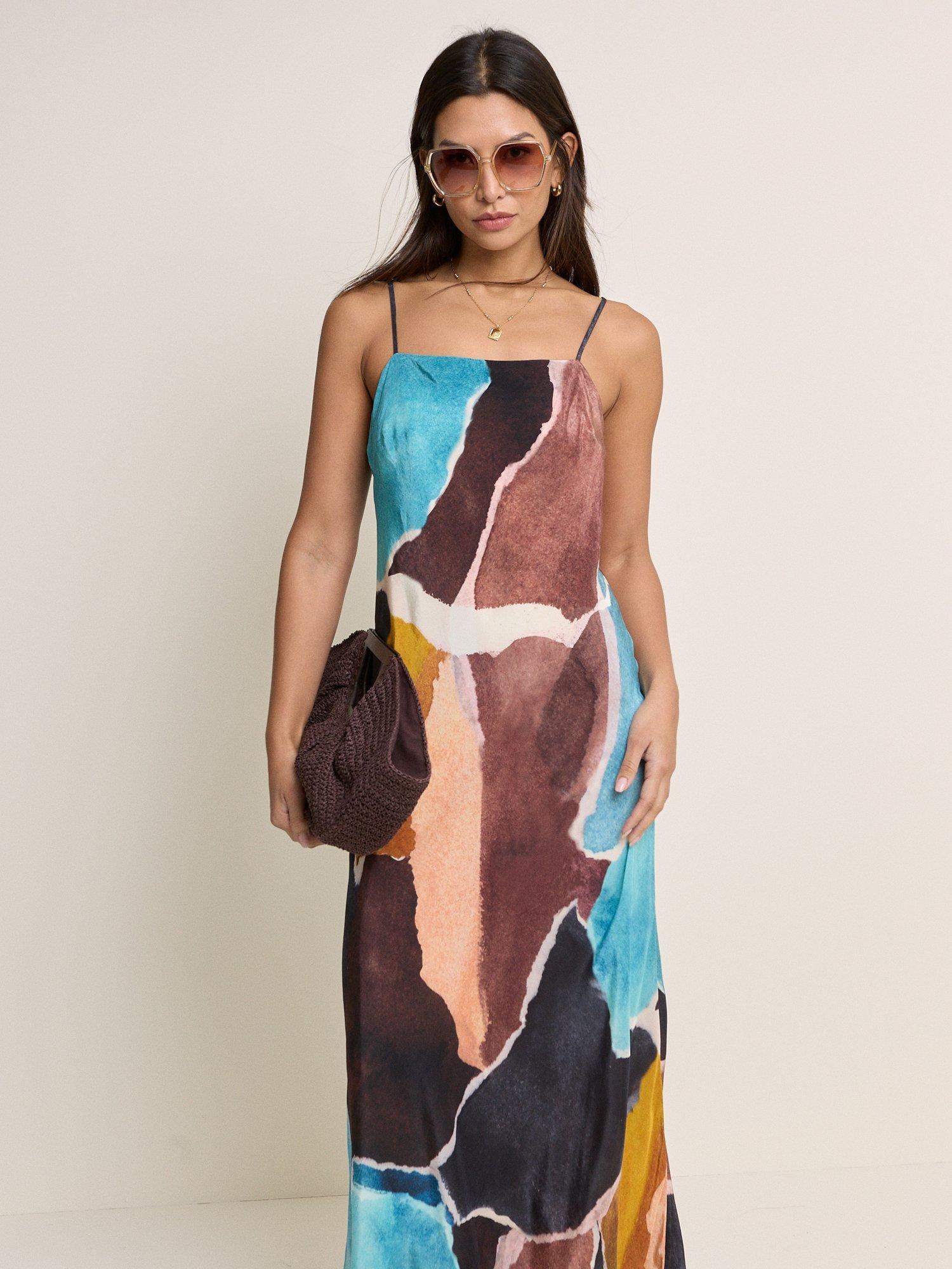 Designed in a rich abstract print with jewel tones, this maxi dress features a square neckline and slim spaghetti straps. It falls effortlessly over the body in a straight silhouette.