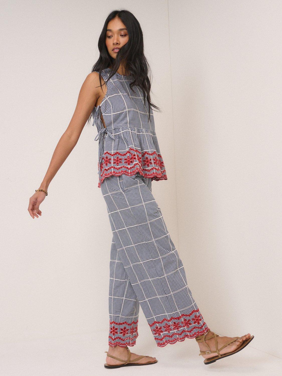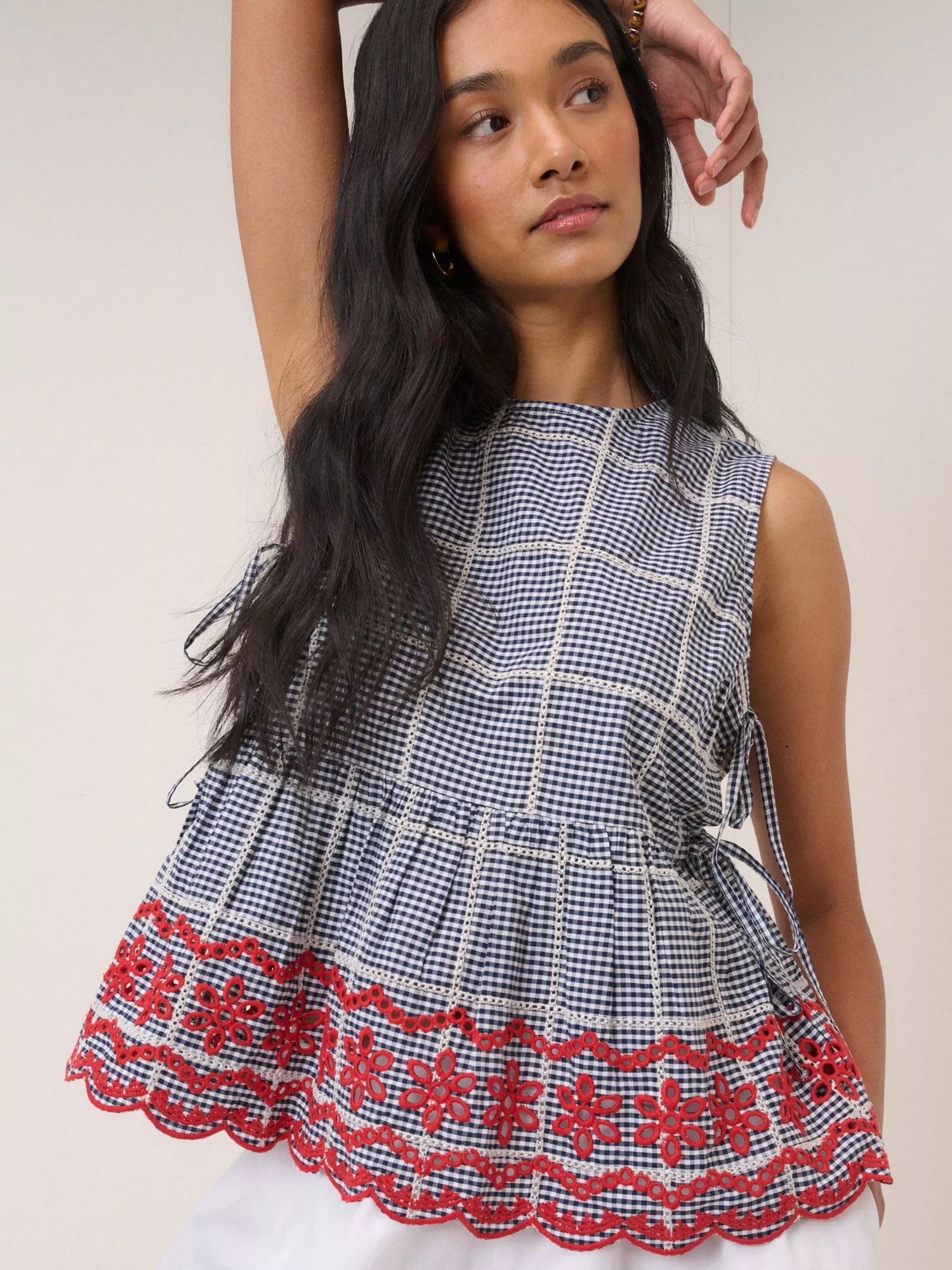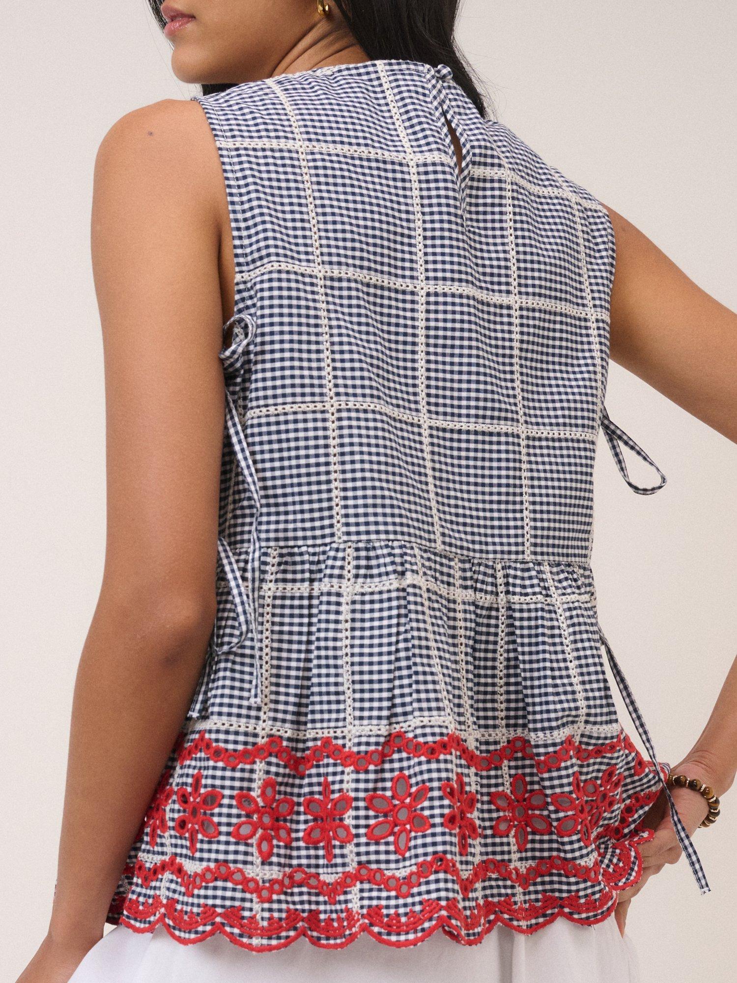 This gingham top features intricate lace detailing, with floral cutwork at the scalloped peplum hem. It’s cut to a relaxed, sleeveless fit. Don’t miss the side tie details.