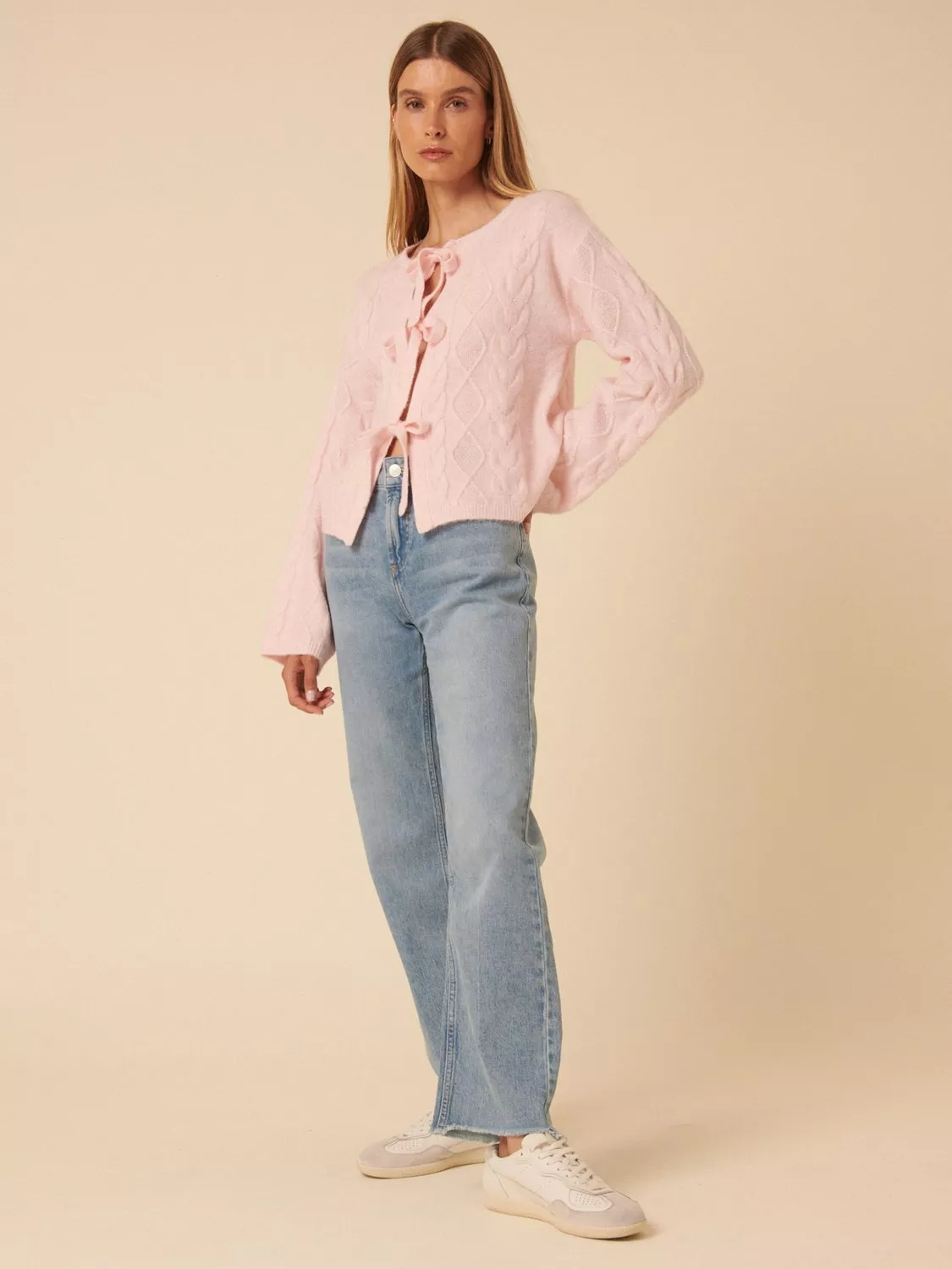 Your new favourite cardigan, this cable knit features an easy round neck and a pretty trio of ties. Its relaxed fit makes it perfect for layering.
