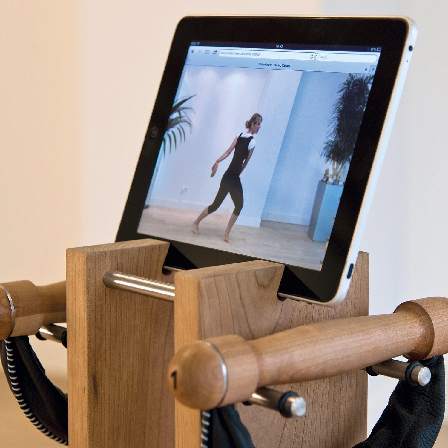 The top of the tower can store exercise instruction cards or dock a tablet or smartphone to help you with your workouts.