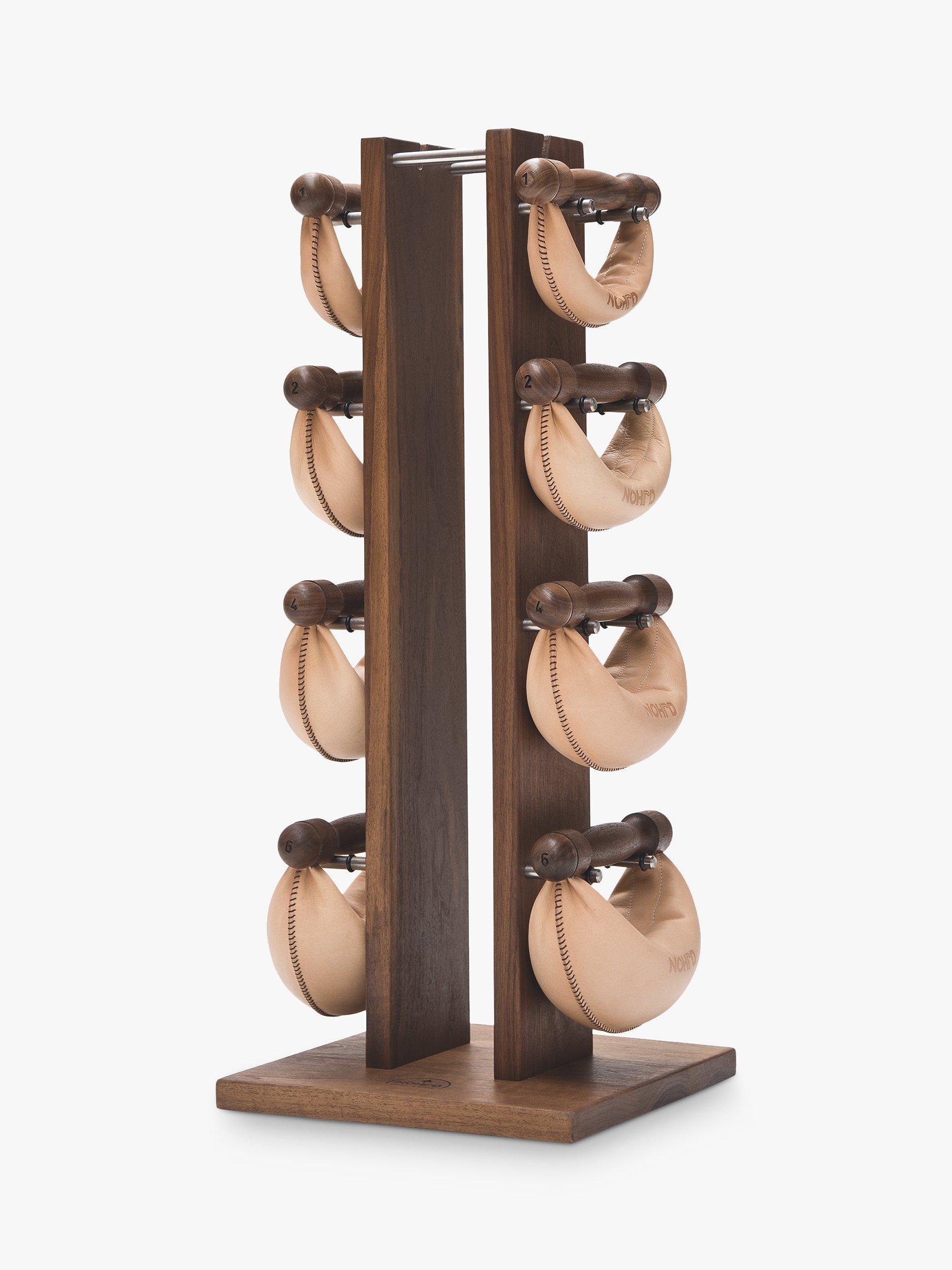 Workout with this stylish and practical alternative to the traditional kettlebell, the NOHrD Swing Tower Set. Included are four pairs of swing bells: 2, 4, 6, and 8 kg.