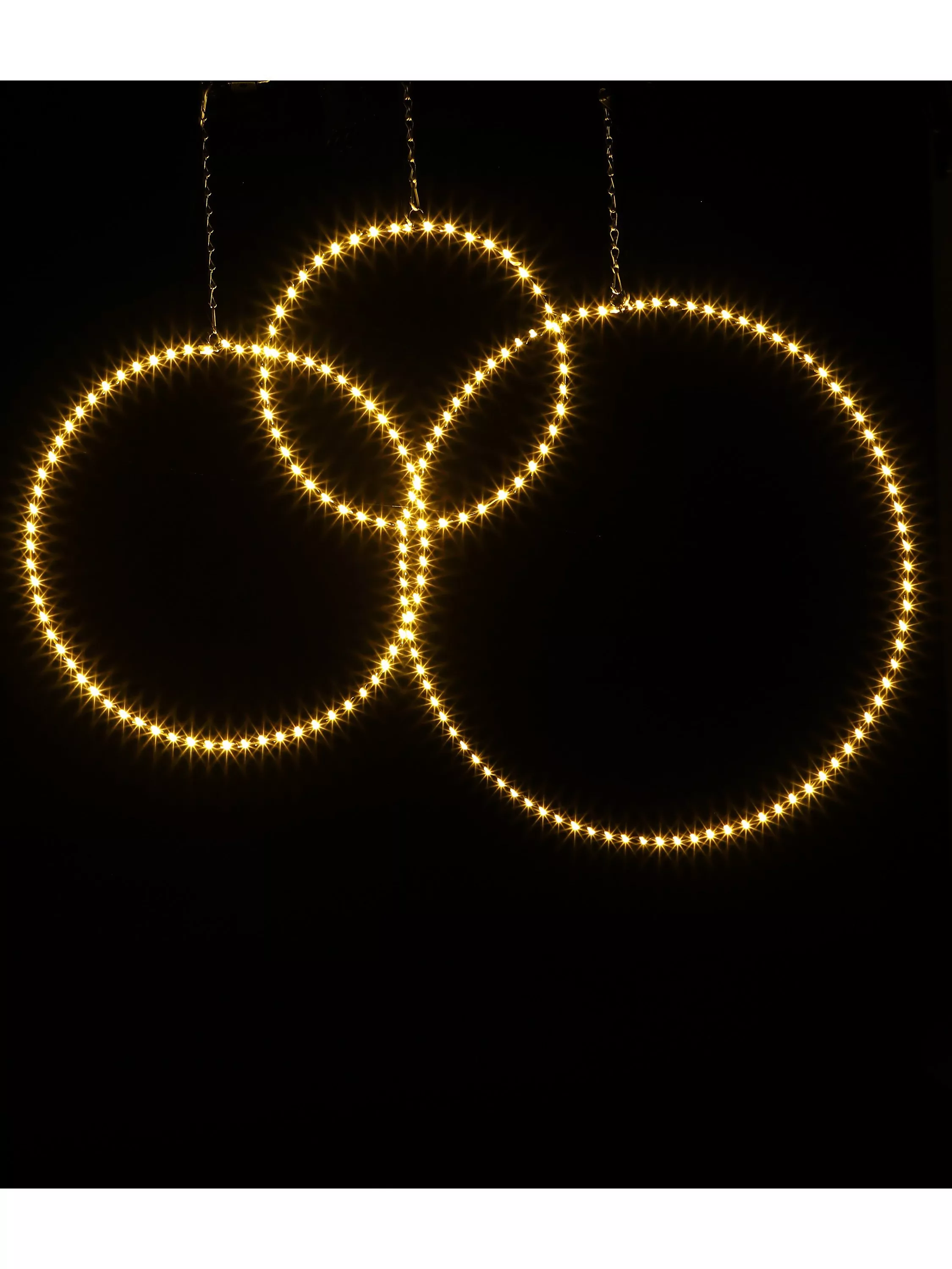 An enchanting circle of light that will truly make a statement in your outdoor space. A black metal frame loaded with forty five sparkling, warm white micro LED lights.
