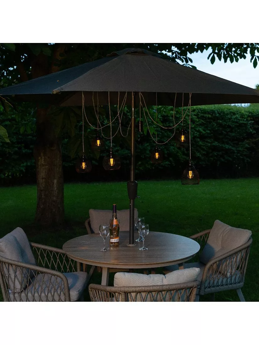 The braided cable and the black metal mesh shades create a stylish lighting centre piece for your garden or patio. Hang under parasols, pergolas or trees and admire the ambient glow of the six bulb style festoons. Designed with a six hour timer and 1.8m braided cable for each bulb.