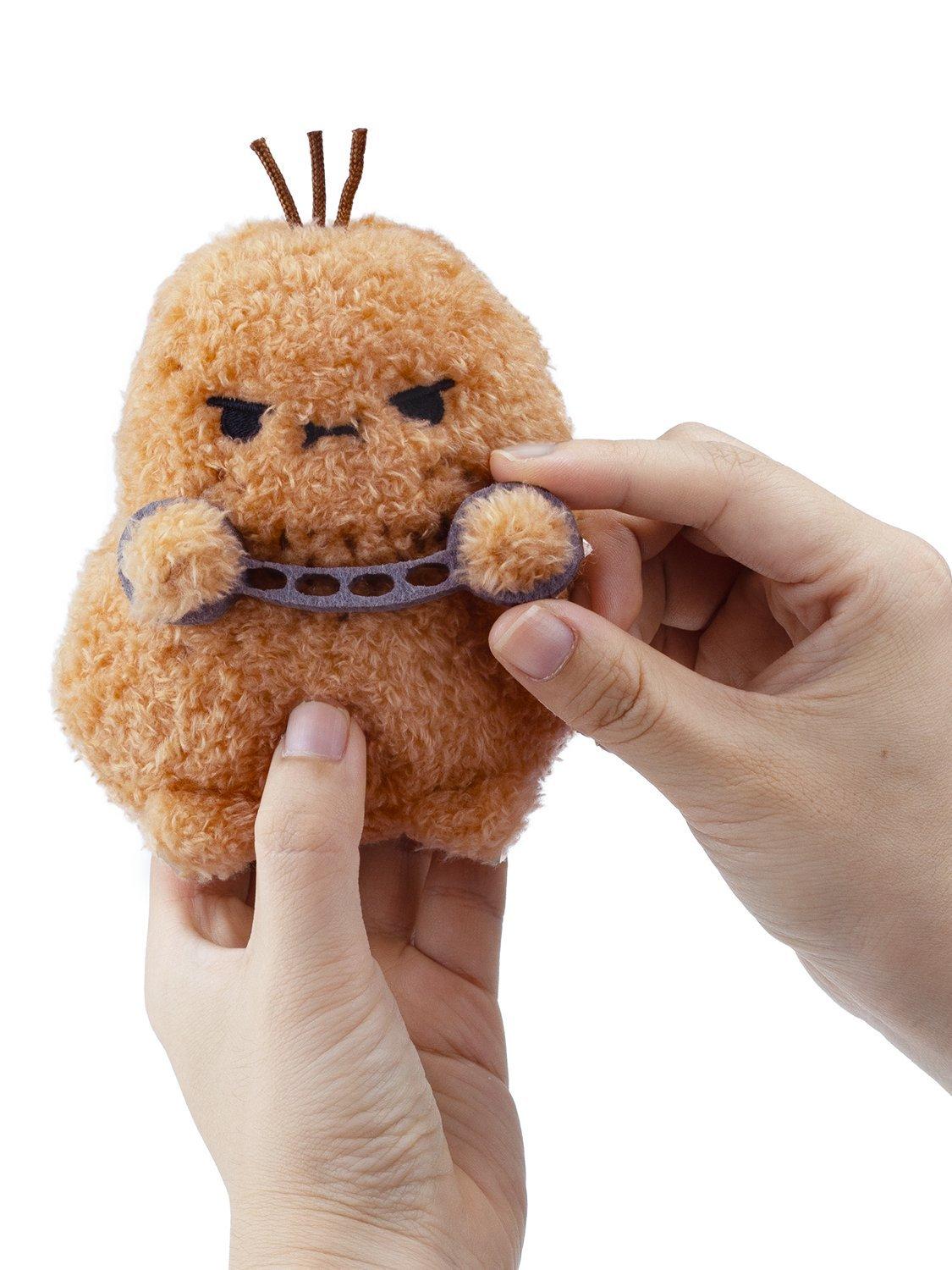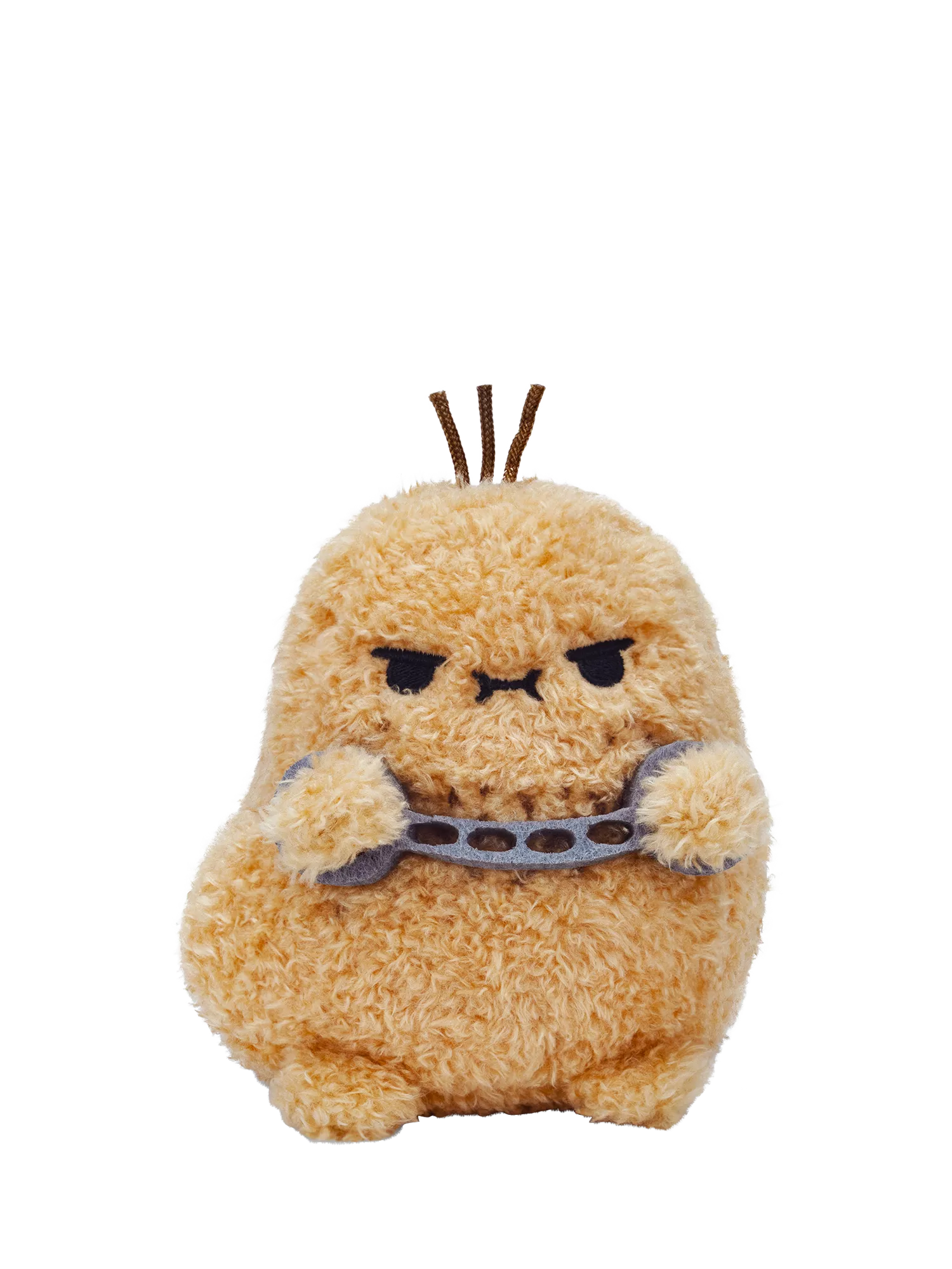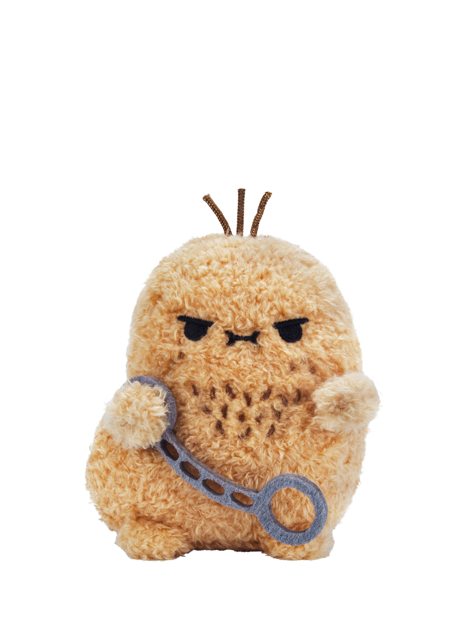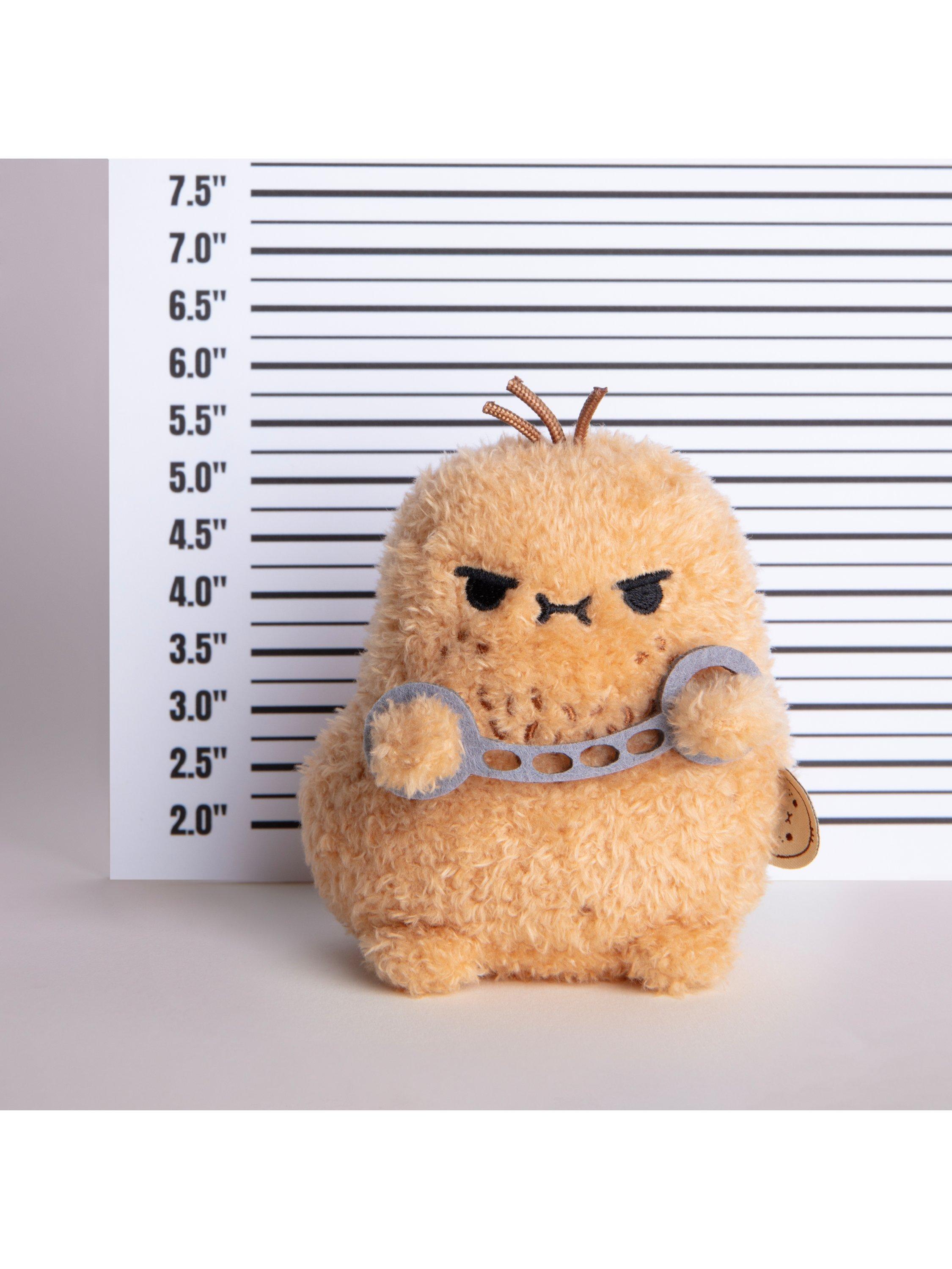 This cutie cannot be contained — Meet Cuffs Ricespud! Made from super soft brown fabric, and sporting a ""Mum"" tattoo, a hairy chest, tiny removable felt handcuffs and a grumpy face, this potato must have skipped breakfast. Stuffed to the brim for extra chubby cuddles, because even the naughtiest potatoes love a good hug!