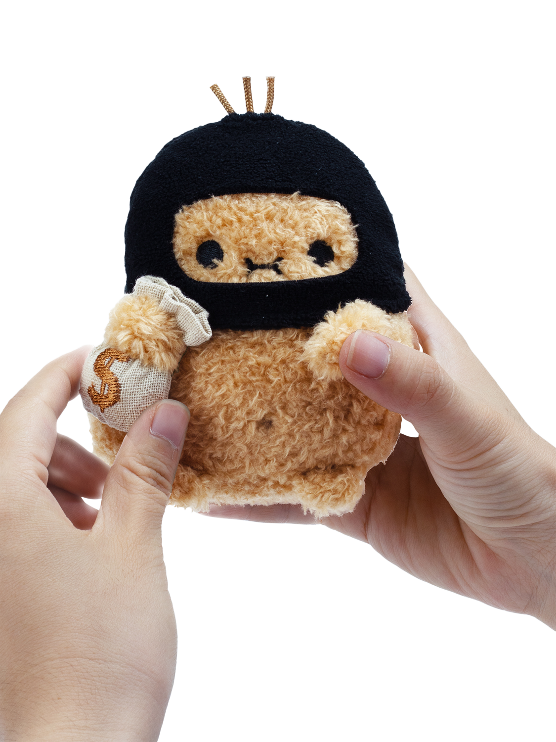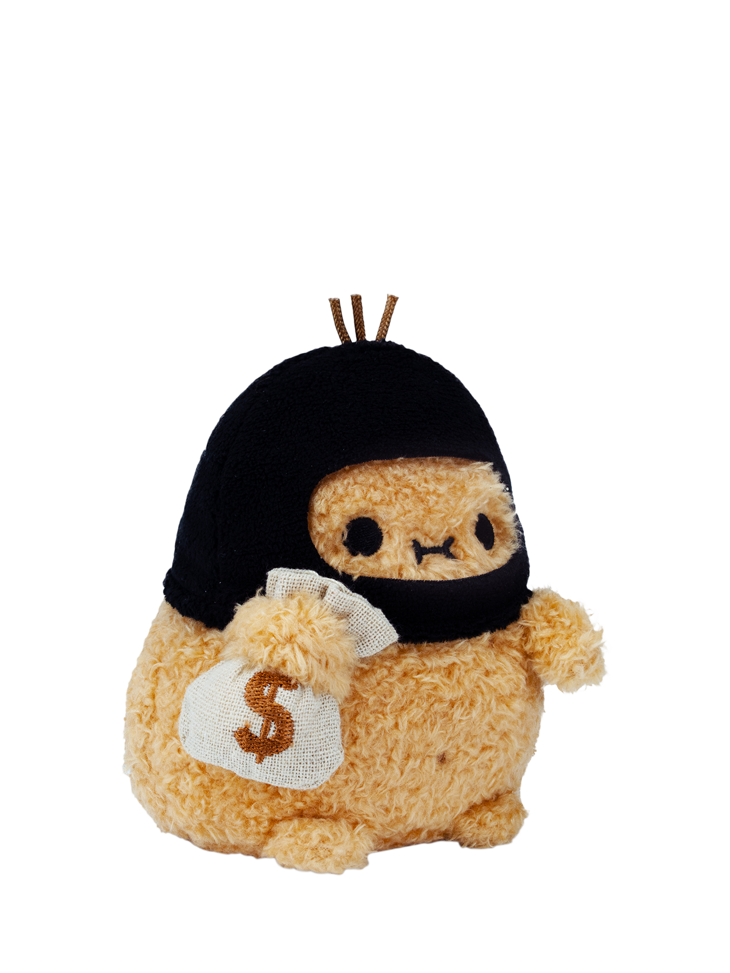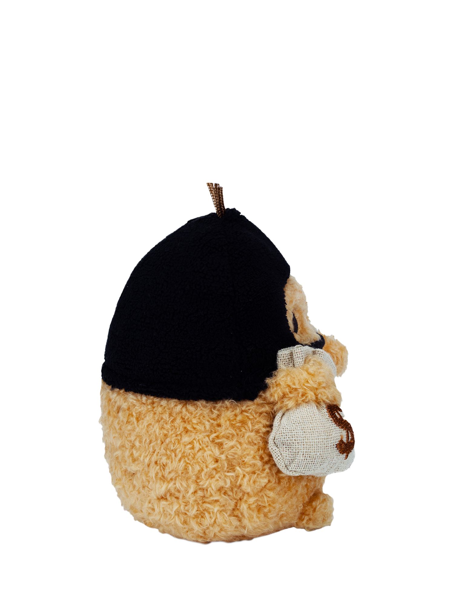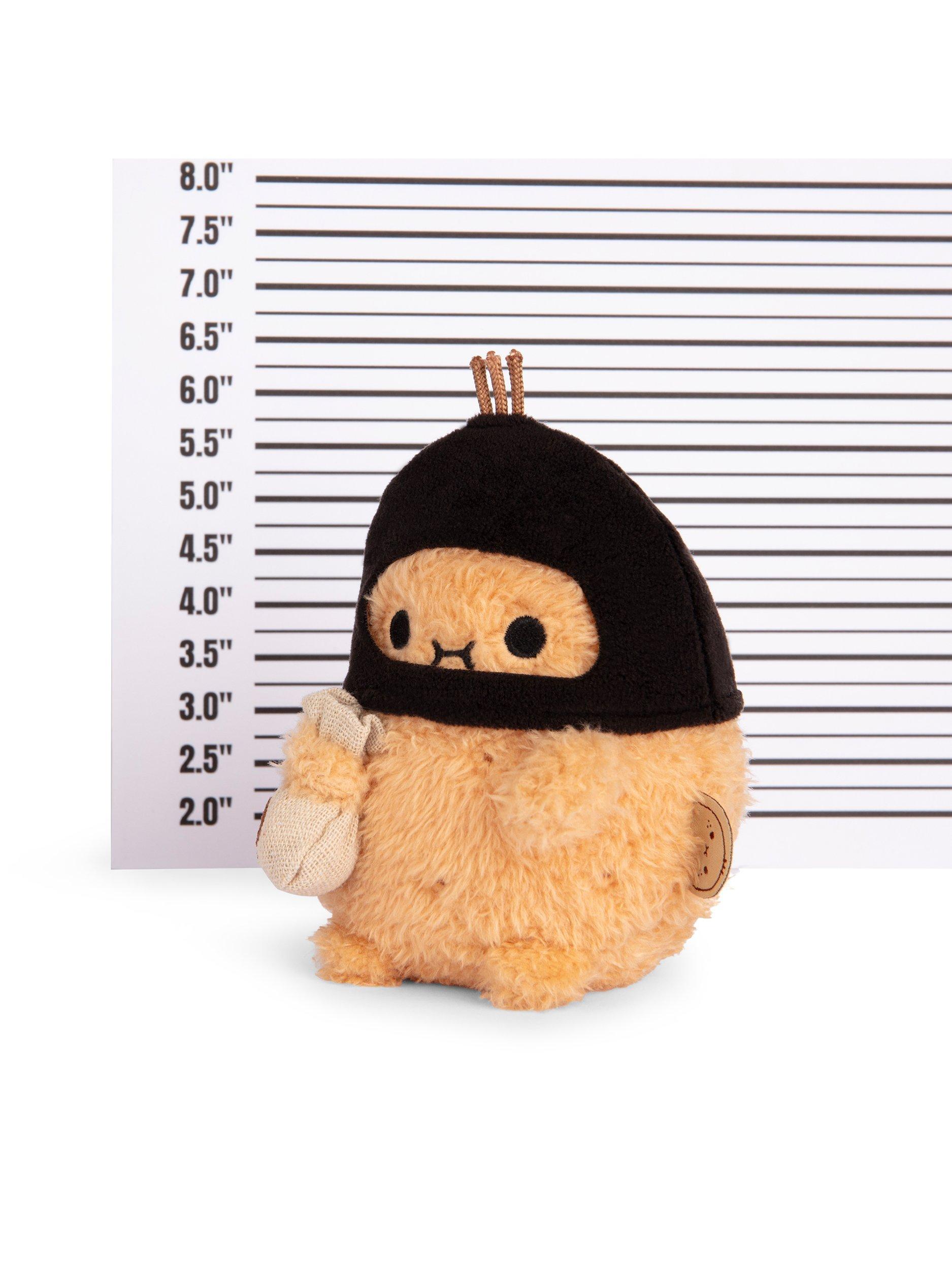 Hide your snacks - Robber Ricespud is on the loose! Made from super soft brown fabric, with a suspiciously cute face mask and a tiny money bag, what could this potato be scheming? Stuffed to the brim for extra chubby cuddles, because even the naughtiest potatoes love a good hug!