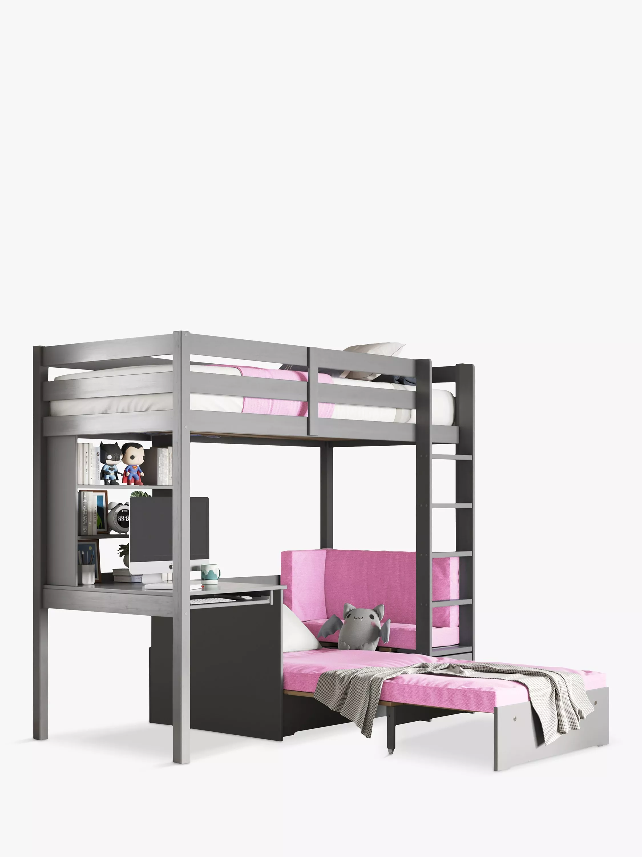Made from solid pine, this high sleeper comes with a corner sofa futon that extends to become a temporary bed. The Eino high sleeper has a large work desk with keyboard tray and shelving making it a great study space. For extra storage, there is also a long drawer below the ladder.