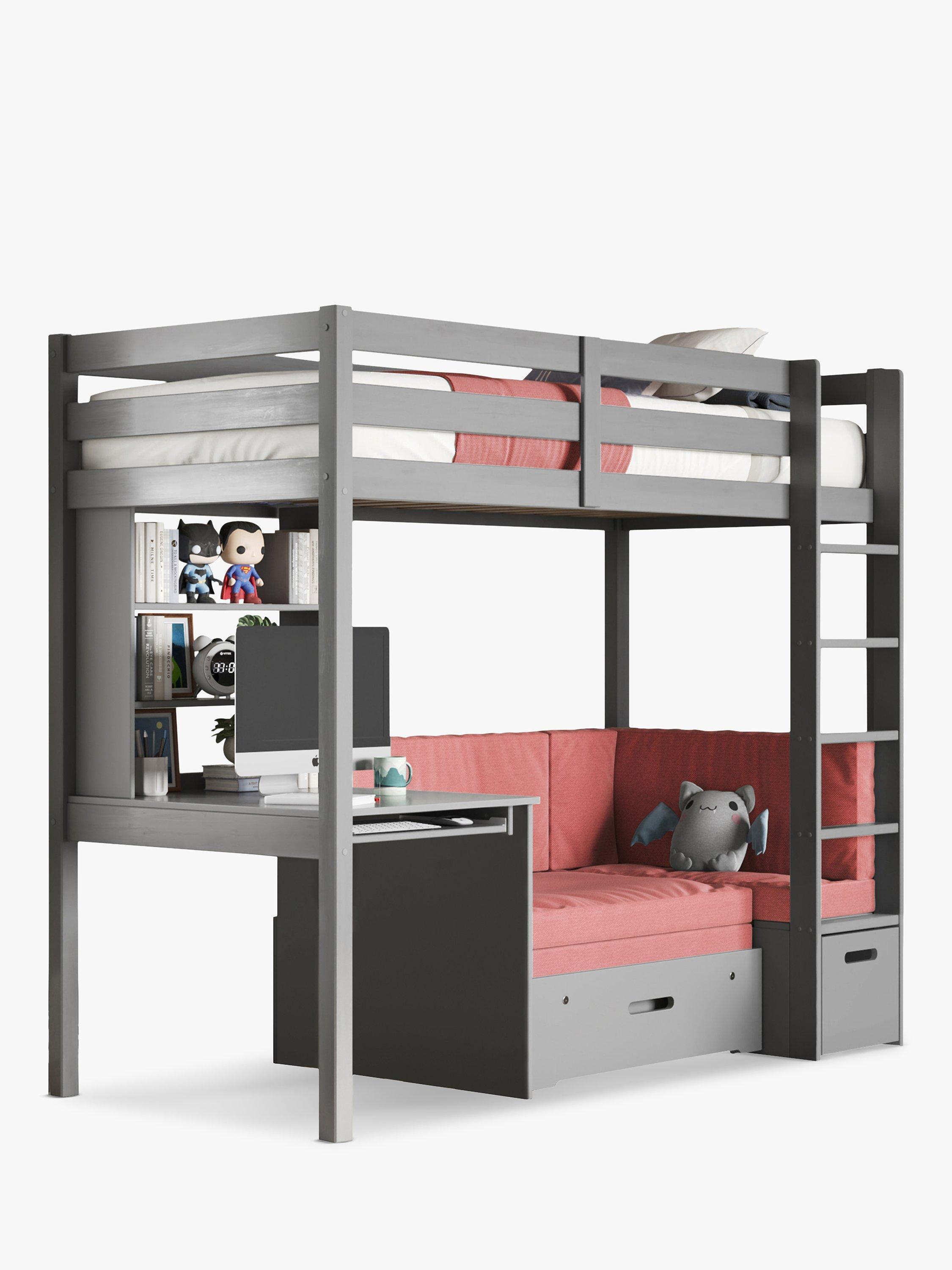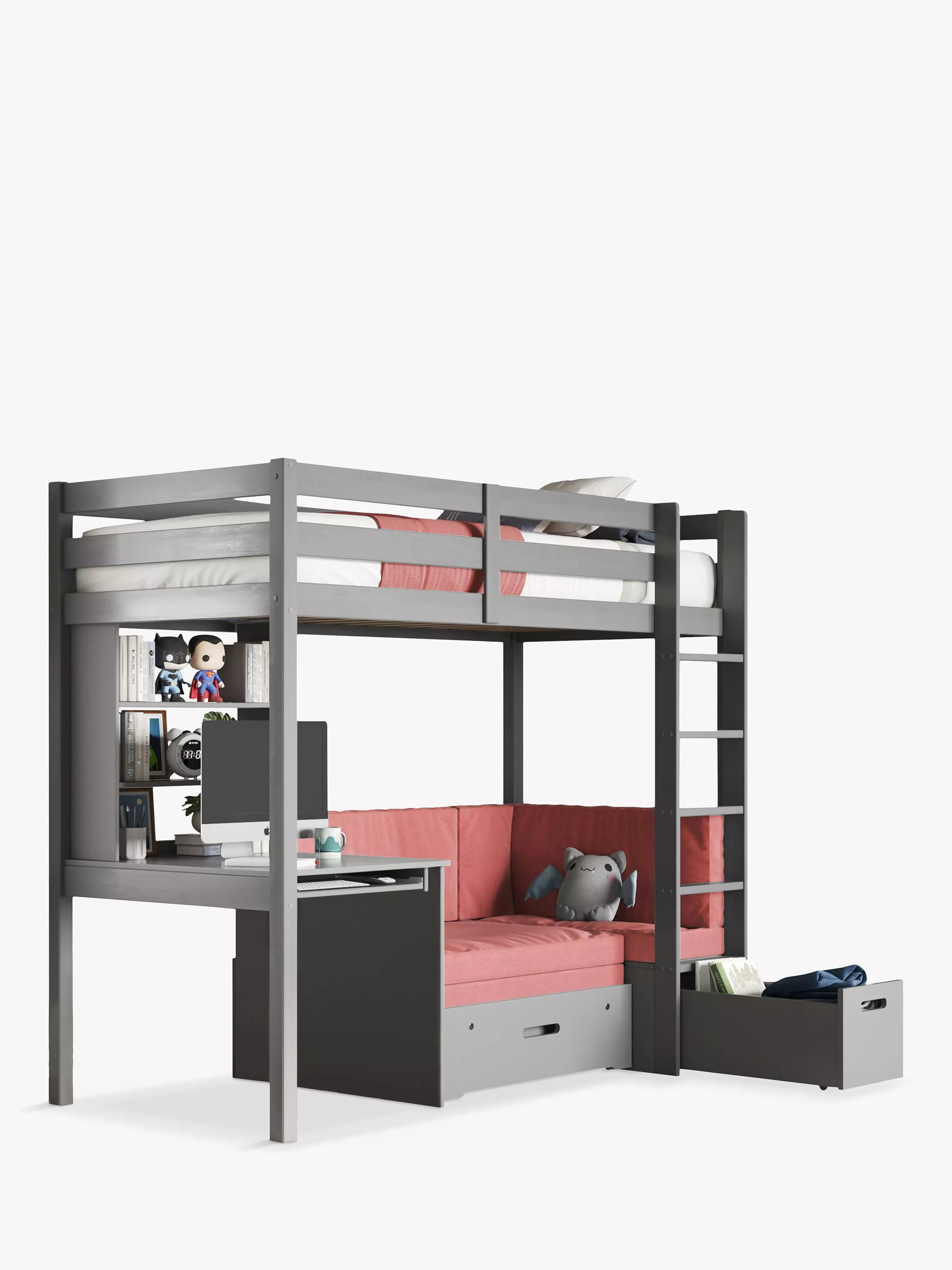 Made from solid pine, this high sleeper comes with a corner sofa futon that extends to become a temporary bed. The Eino high sleeper has a large work desk with keyboard tray and shelving making it a great study space. For extra storage, there is also a long drawer below the ladder.