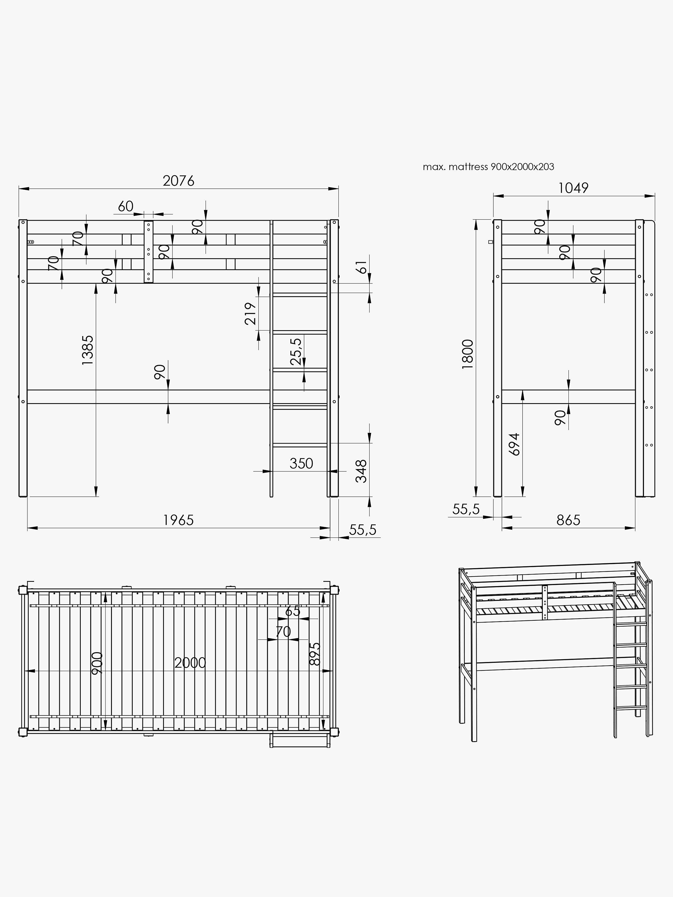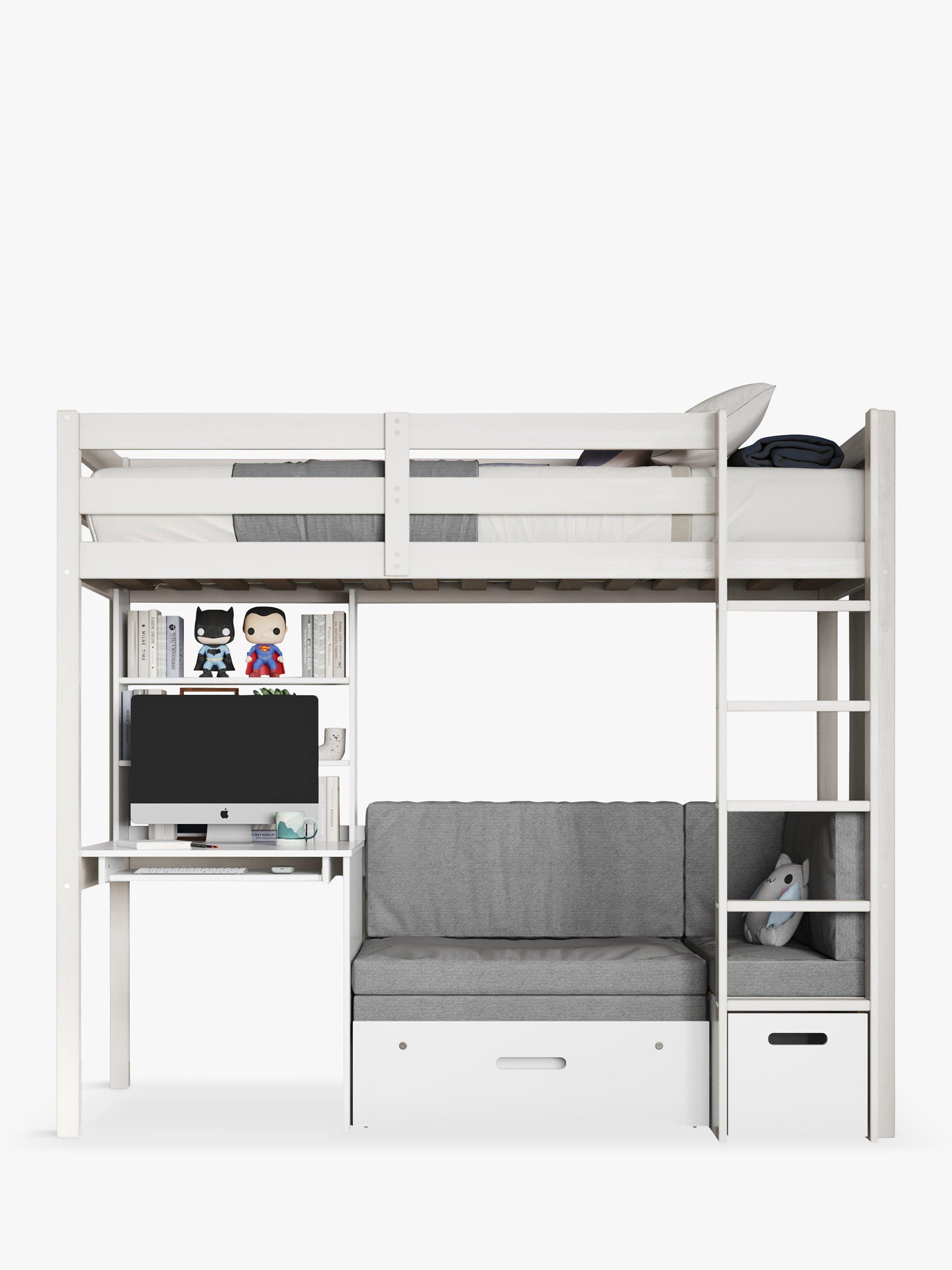 Made from solid pine, this high sleeper comes with a corner sofa futon that extends to become a temporary bed. The Eino high sleeper has a large work desk with keyboard tray and shelving making it a great study space. For extra storage, there is also a long drawer below the ladder.