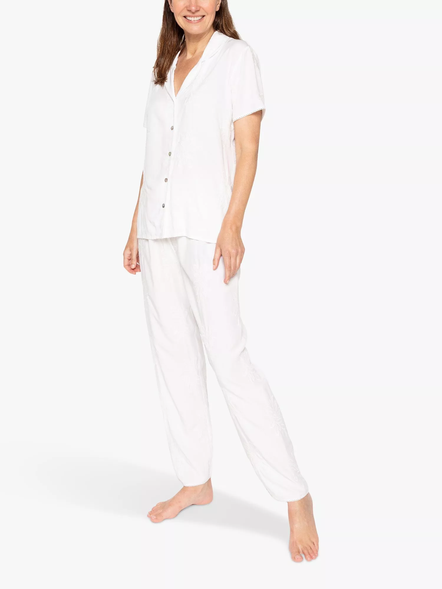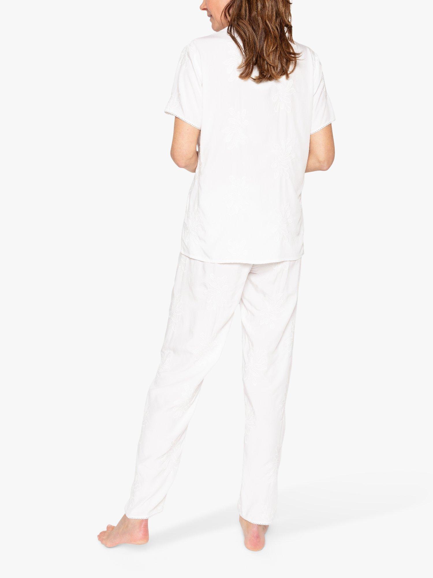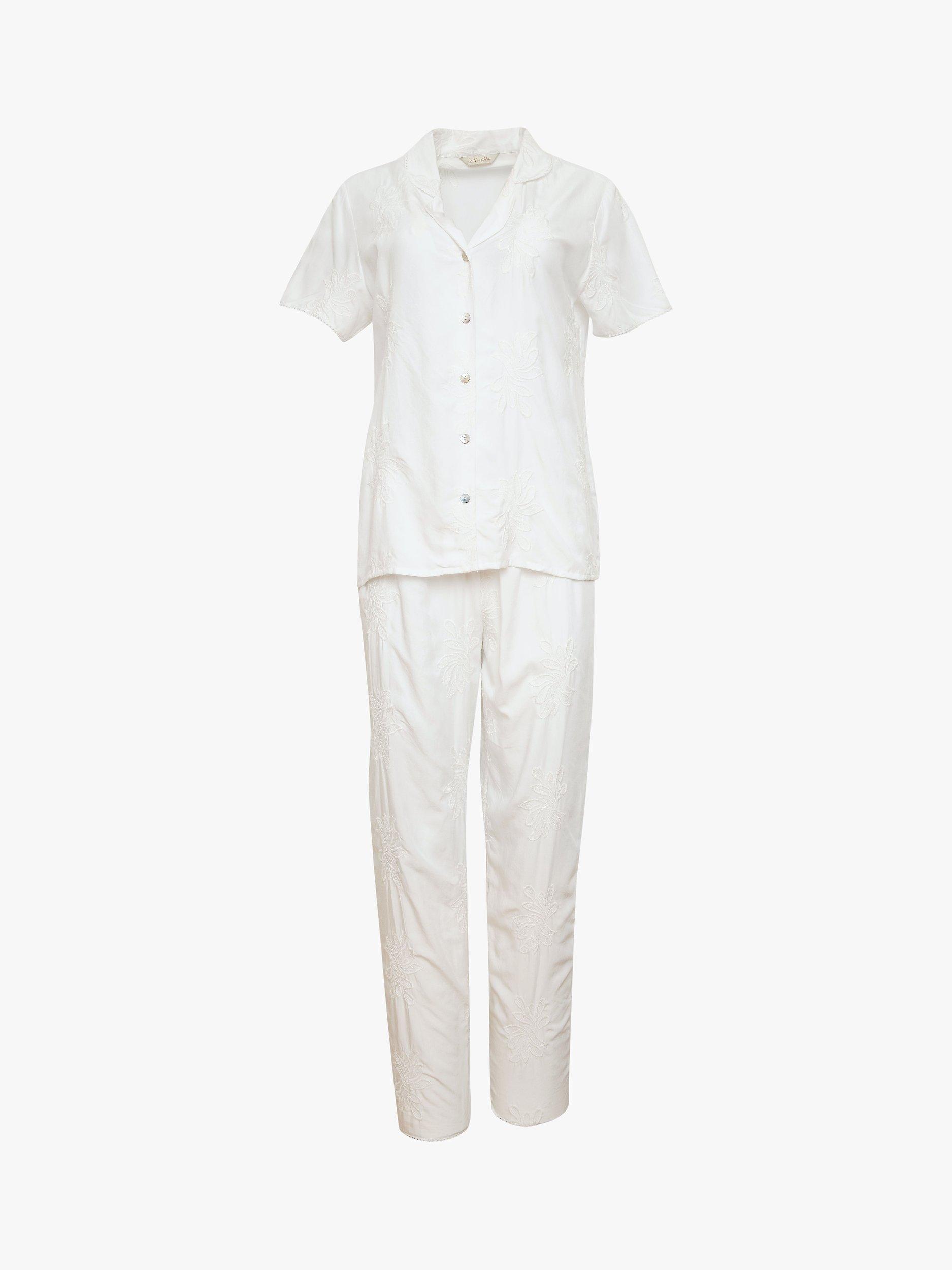Light pyjamas are a must have for the warmer weather and the Vivien set features a beautiful embroidery lending them an elegant feel. Made from super-soft and cool to wear cotton-modal blend, the set is trimmed with lace. The short-sleeved, revere collar top fastens at the front with natural shell buttons. Fully elasticated at the waist, with an adjustable front drawstring, the trousers have been made with minimal seams for a comfy night's sleep.