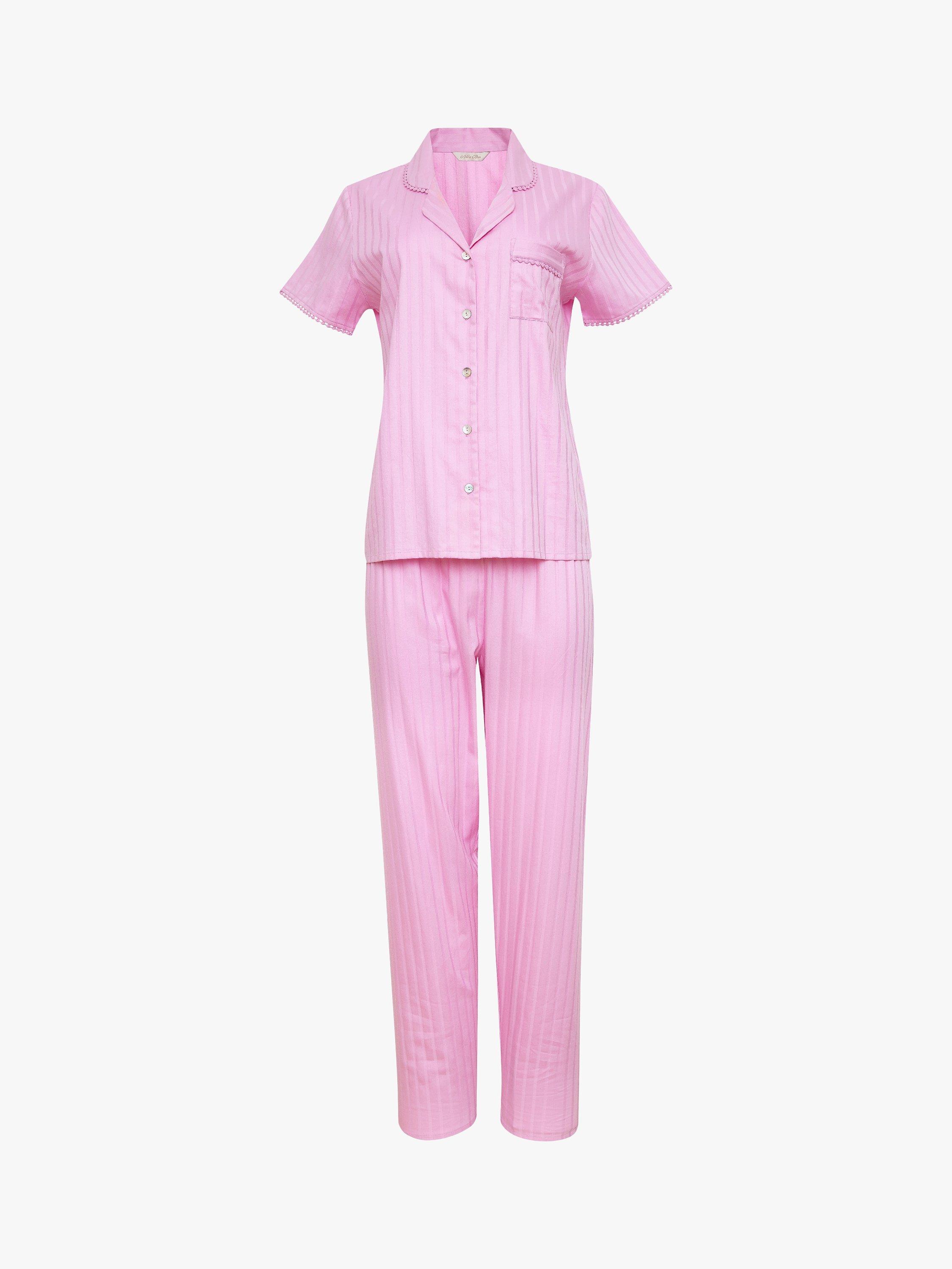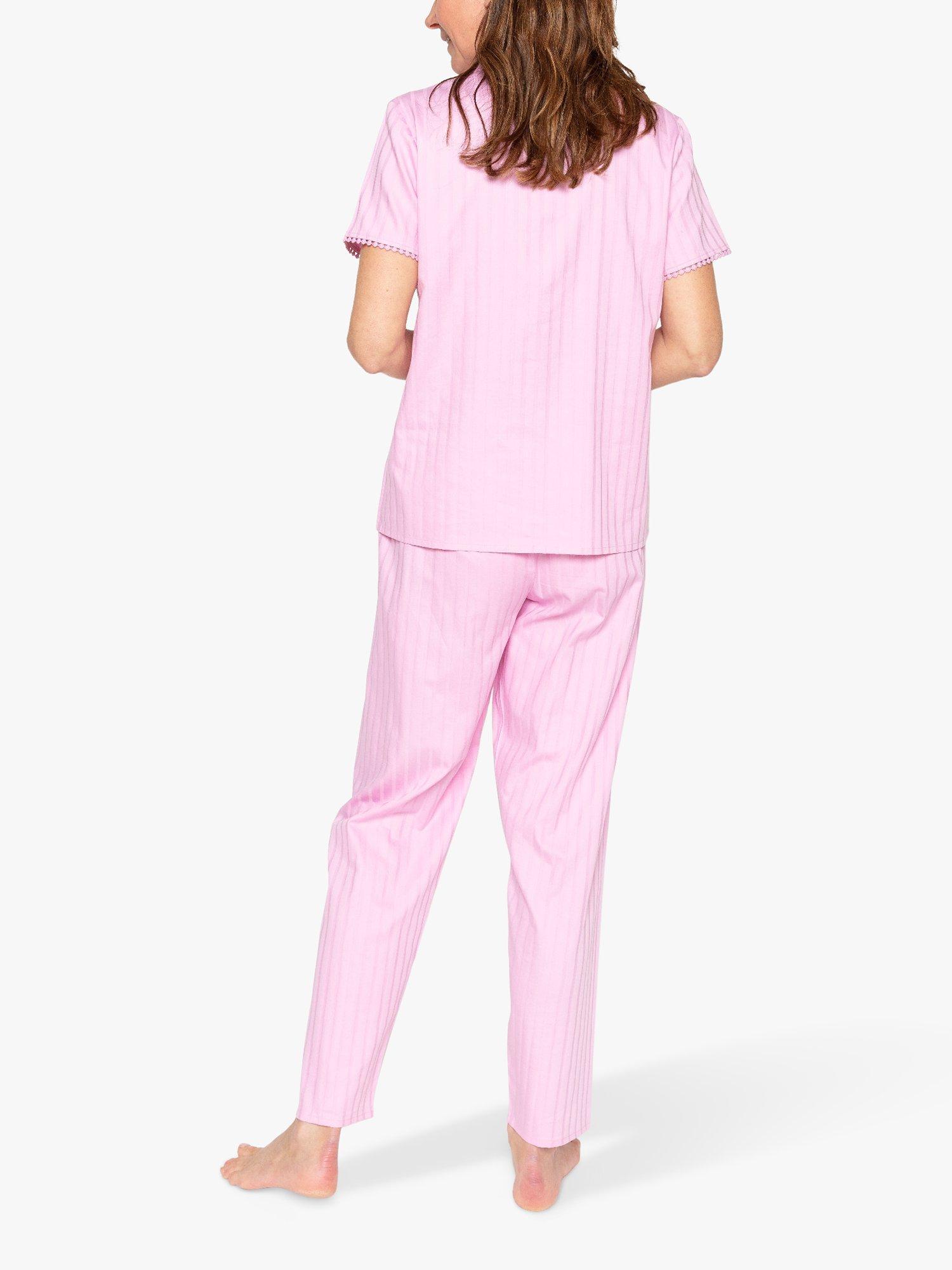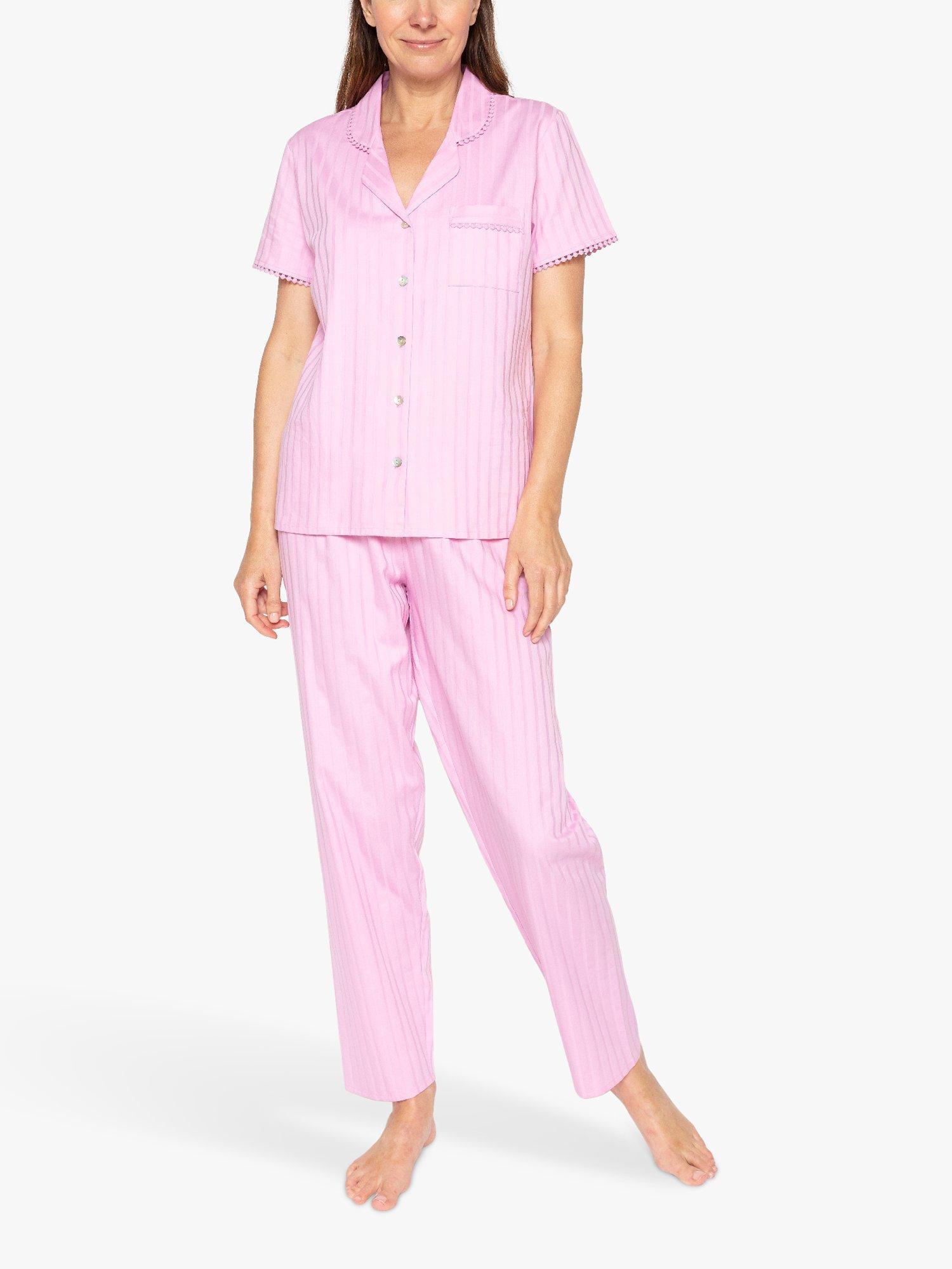 This Vivien sateen stripe pyjama set oozes style and sophistication. Made from 100% cotton, the set is trimmed with bobble lace. The short sleeve top has a revere collar and fastens at the front with natural shell buttons. Fully elasticated at the waist, with an adjustable front drawstring, the trousers have been made with minimal seams for the comfiest night's sleep.