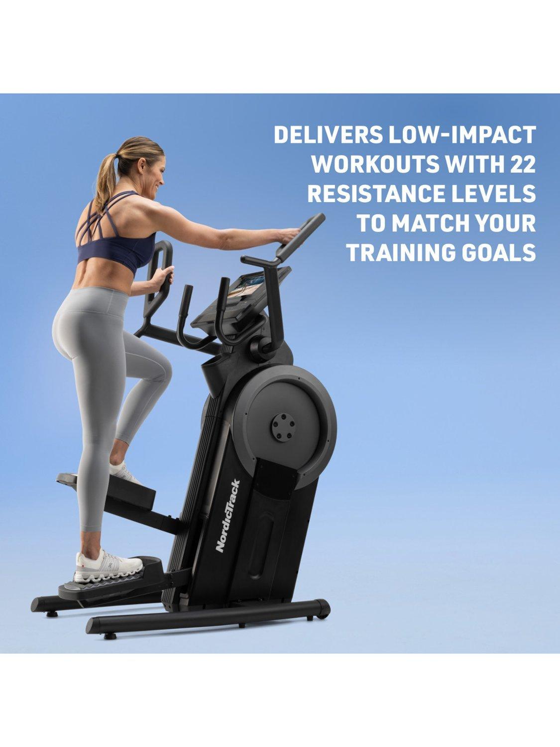 The NordicTrack Step Climber delivers a high-intensity, low-impact cardio workout by combining the vertical motion of a stair stepper with the smooth stride of an elliptical machine. Ideal for home gyms, this space-saving stair stepper is designed to activate your glutes, quads, and core with every step.