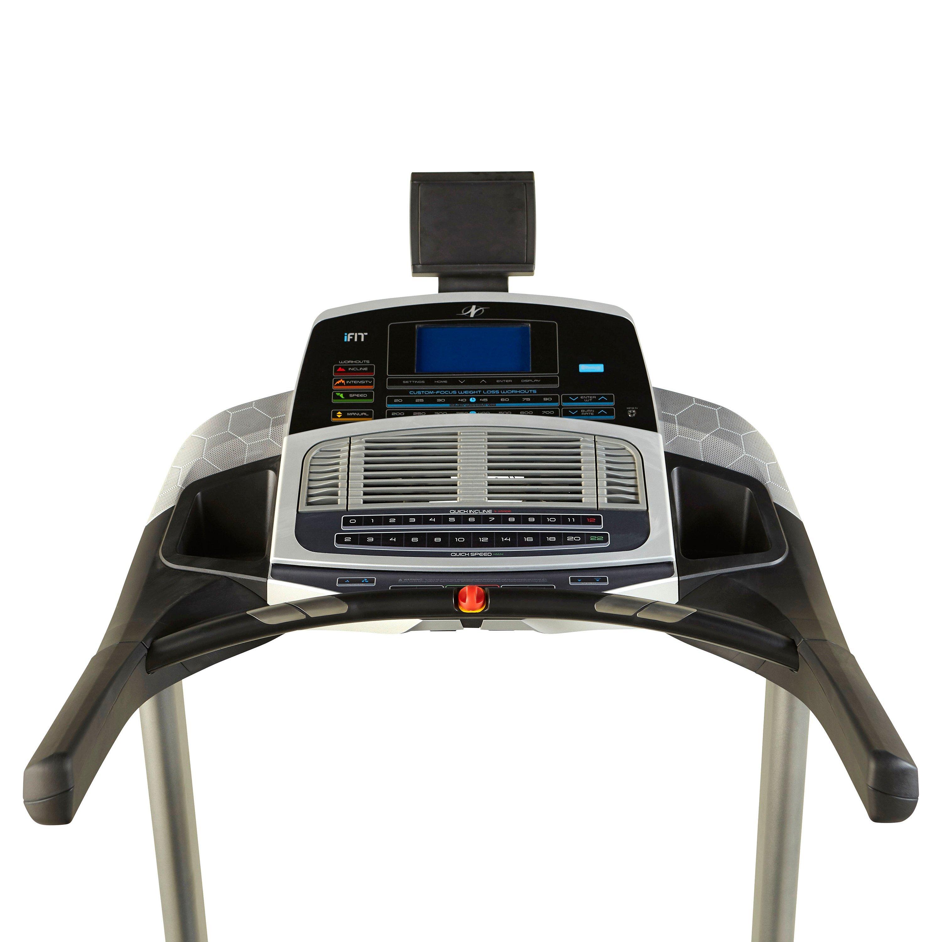 Use the integrated tablet holder (tablet not included) to connect the NordicTrack T10.0 to favourite shows, music and movies while you work out. iFit® technology's interactive training program offers further motivation to keep you going. The iFit® training program is available via an iFit® subscription (sold separately). When training on a custom Google Maps route, iFit will automatically adjust your incline to simulate the natural terrain.