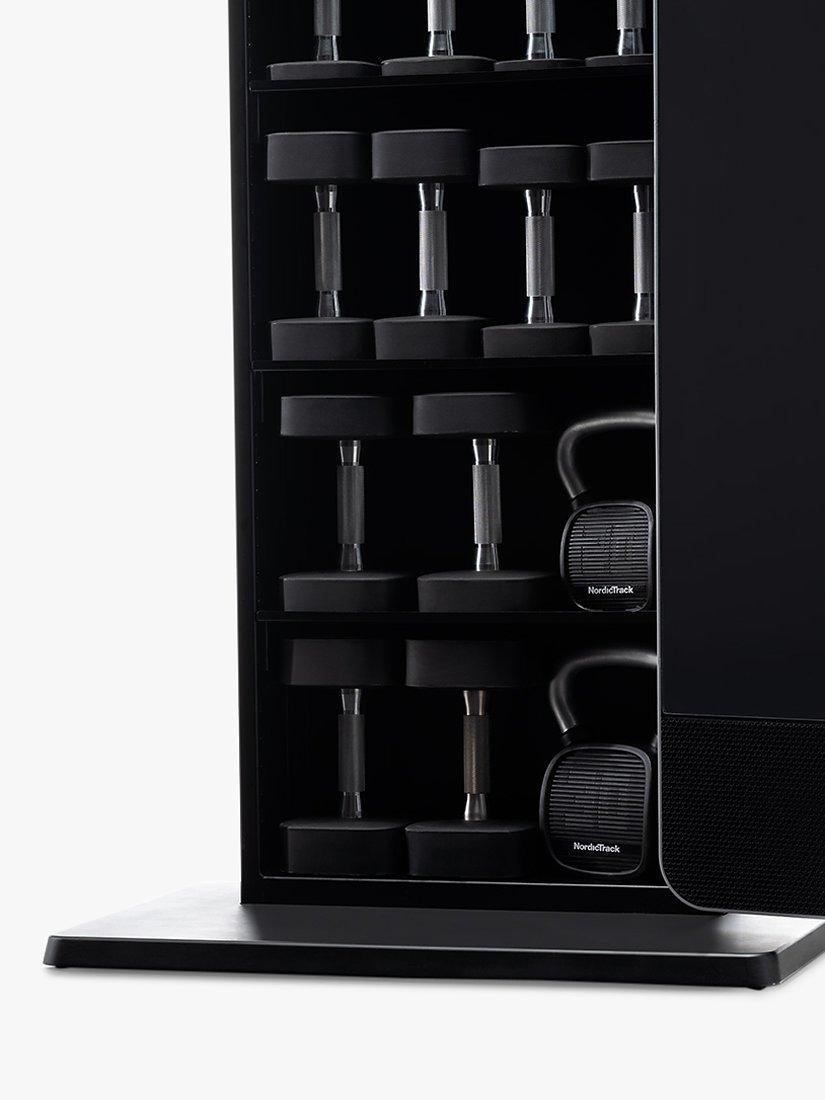Slide the door to the side, and discover the full range of accessories the Vault includes. With a modular shelving design, you can easily store the included dumbbell pairs, kettlebells, resistance loop bands, and more.