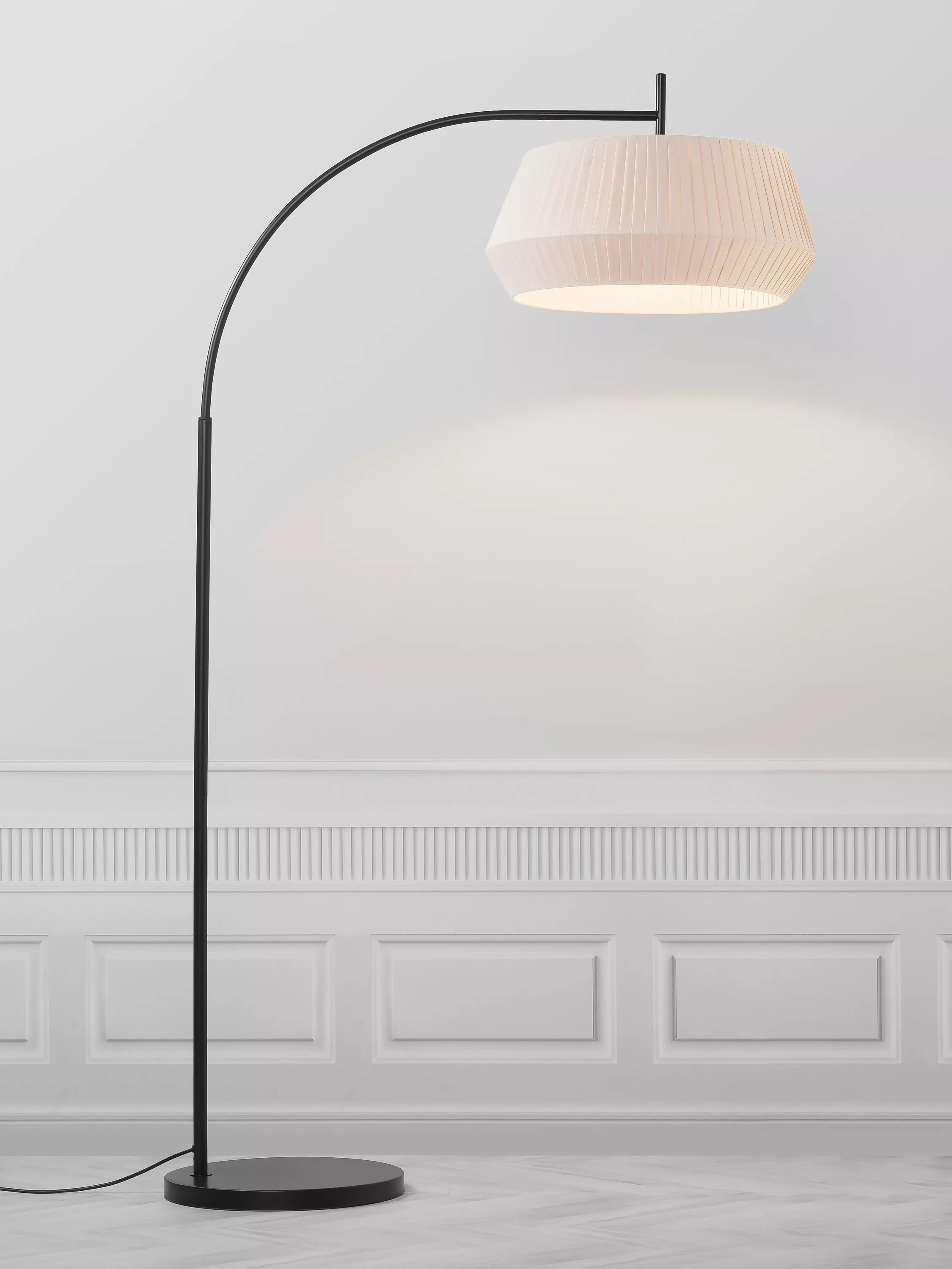 The round shade of the Nordlux Dicte floor lamp is made from soft, hand tied fabric that adds a cosy feel to your room. The large pleated cotton shade ensures a soft and diffused light that is elegantly suspended from the curved base of the lamp, perfect for suspending over an armchair or coffee table.