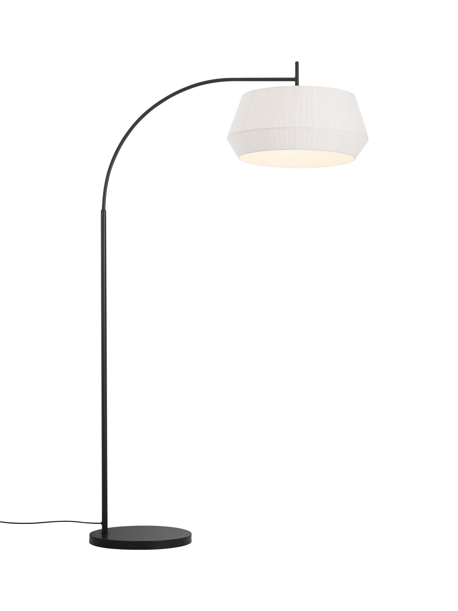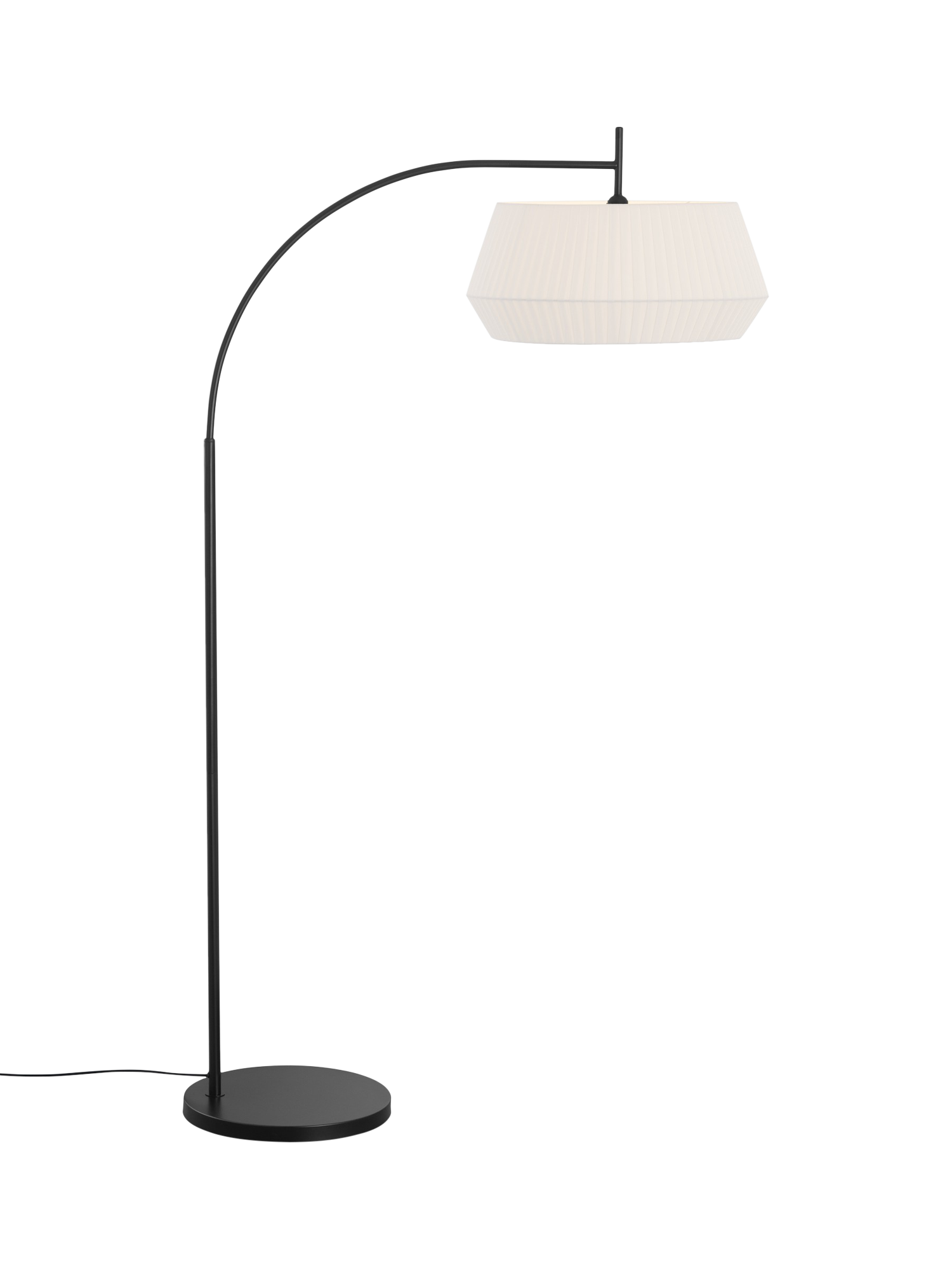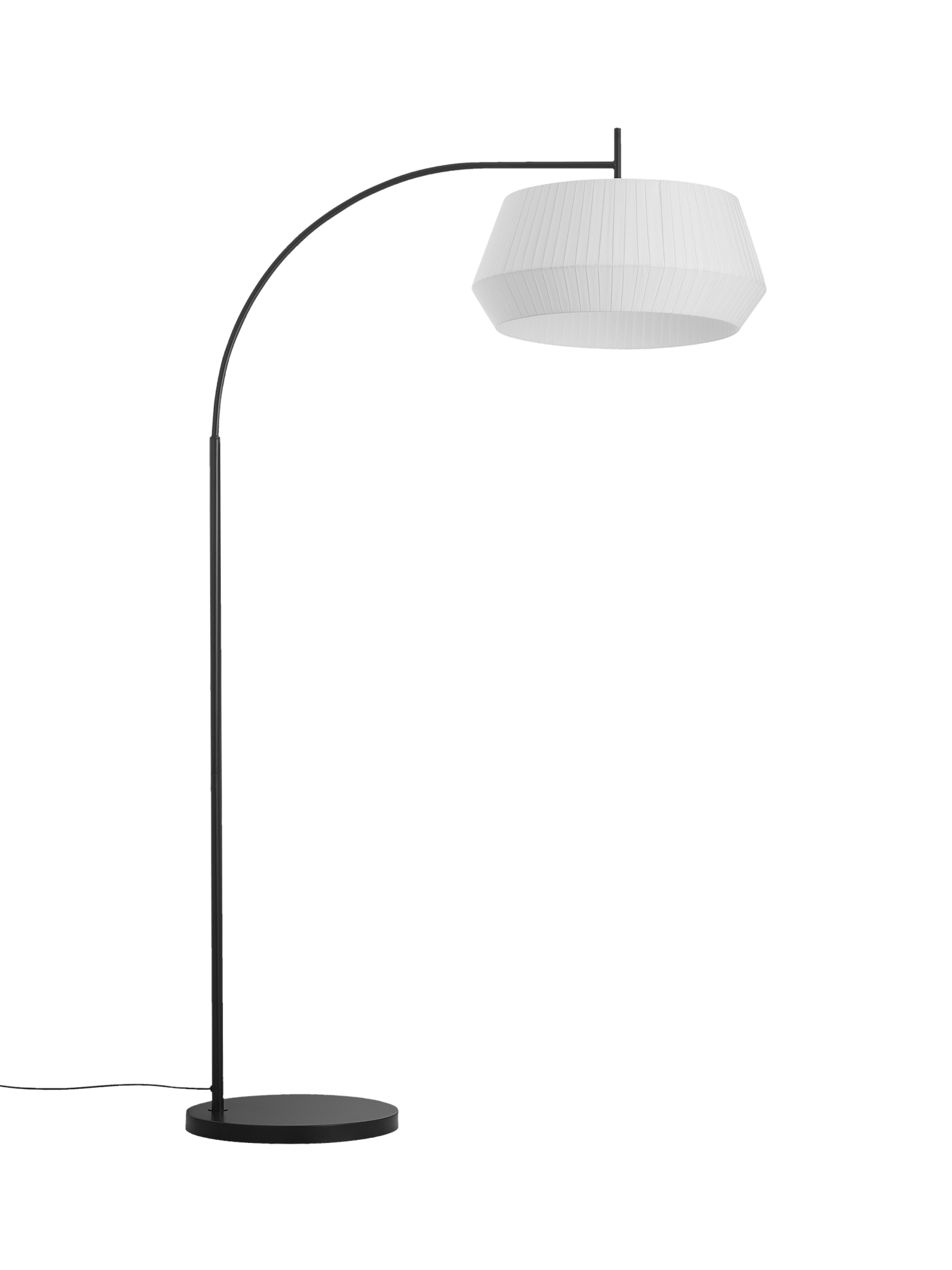 The round shade of the Dicte lighting series is made from soft, hand-tied fabric that adds a cosy and homey feel to every room. The large pleated cotton shade ensures a soft and diffused light that is elegantly suspended from the curved base of the lamp, ideal for over an armchair or coffee table.