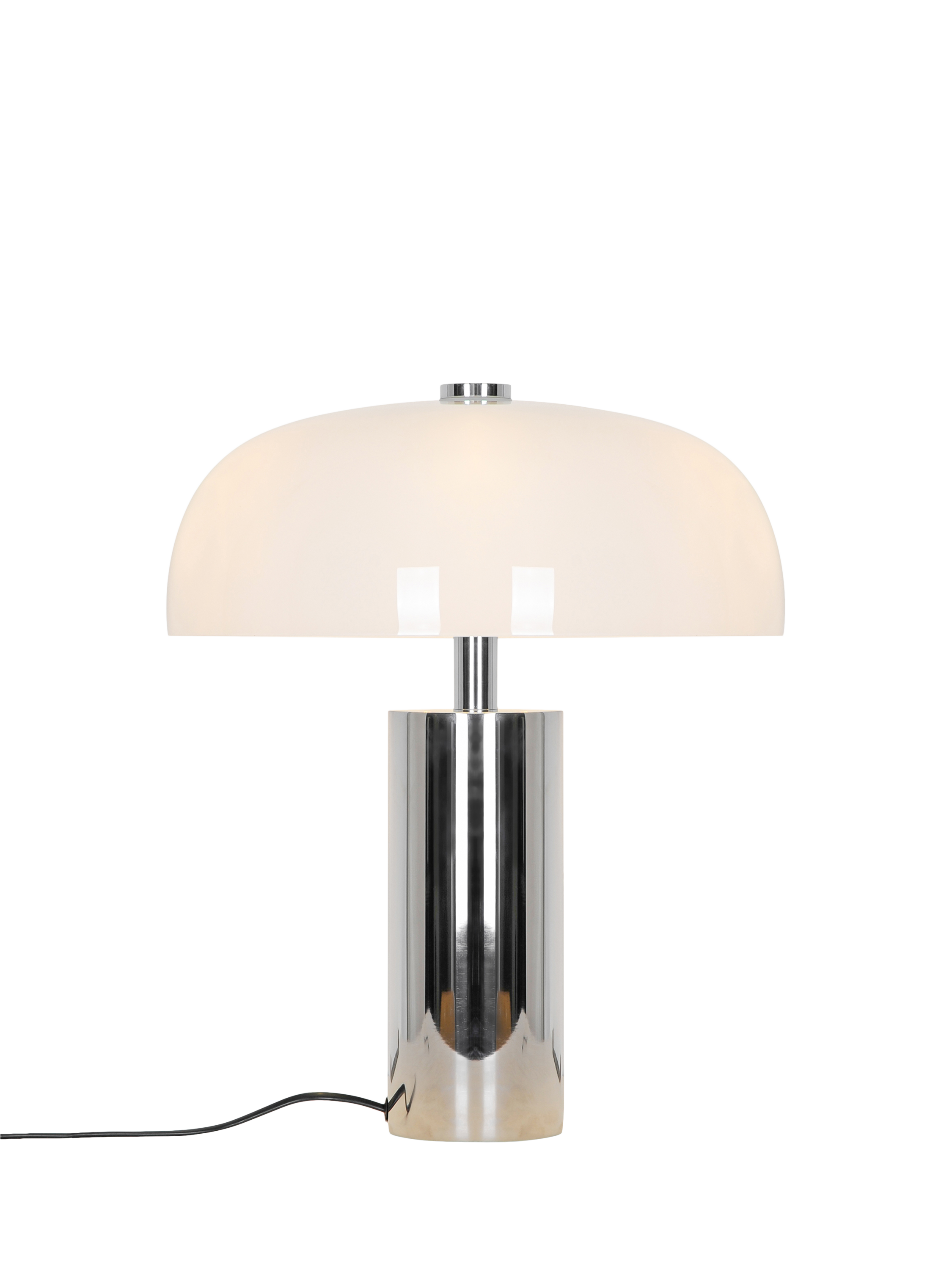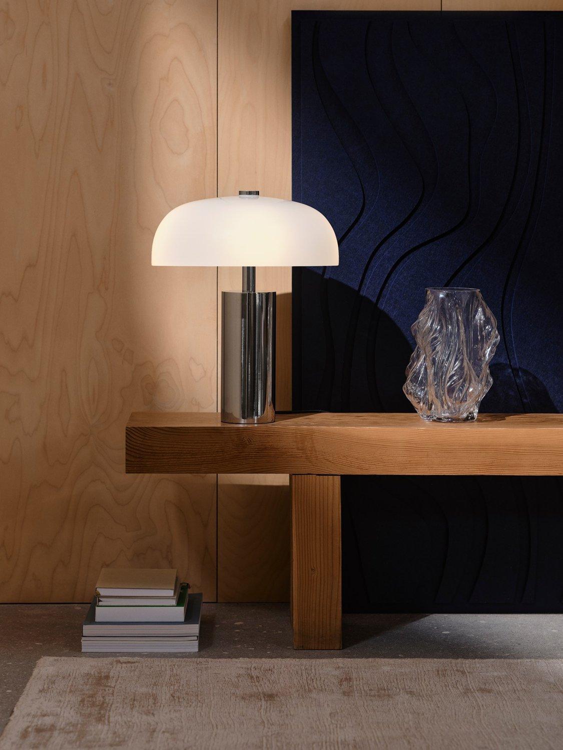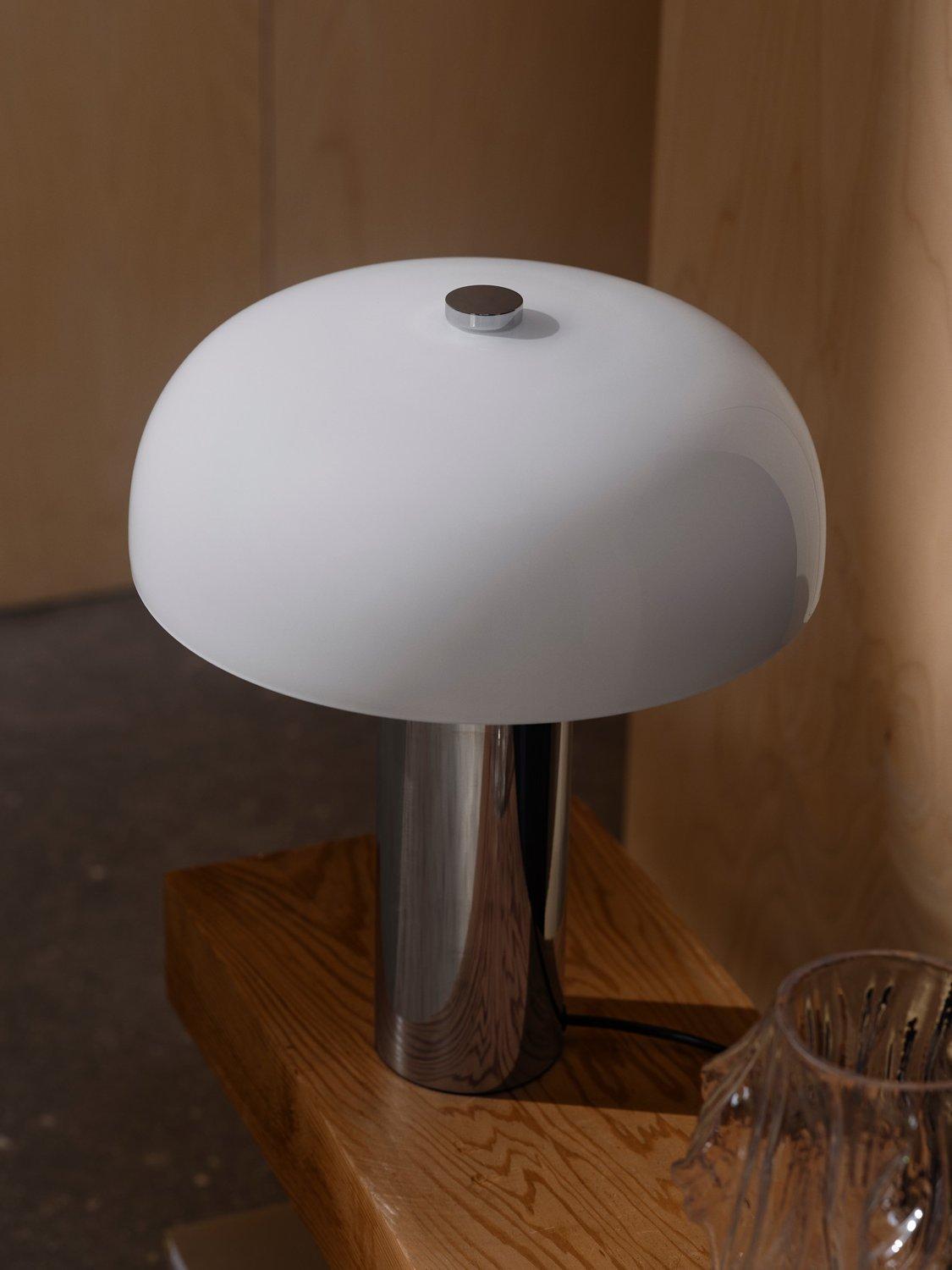 Gabrielle combines shiny chrome with shiny opal glass in an elegant mix of materials. The large opal shade gives the lamp a sculptural expression while providing a soft, diffused light that complements the glossy chrome base.