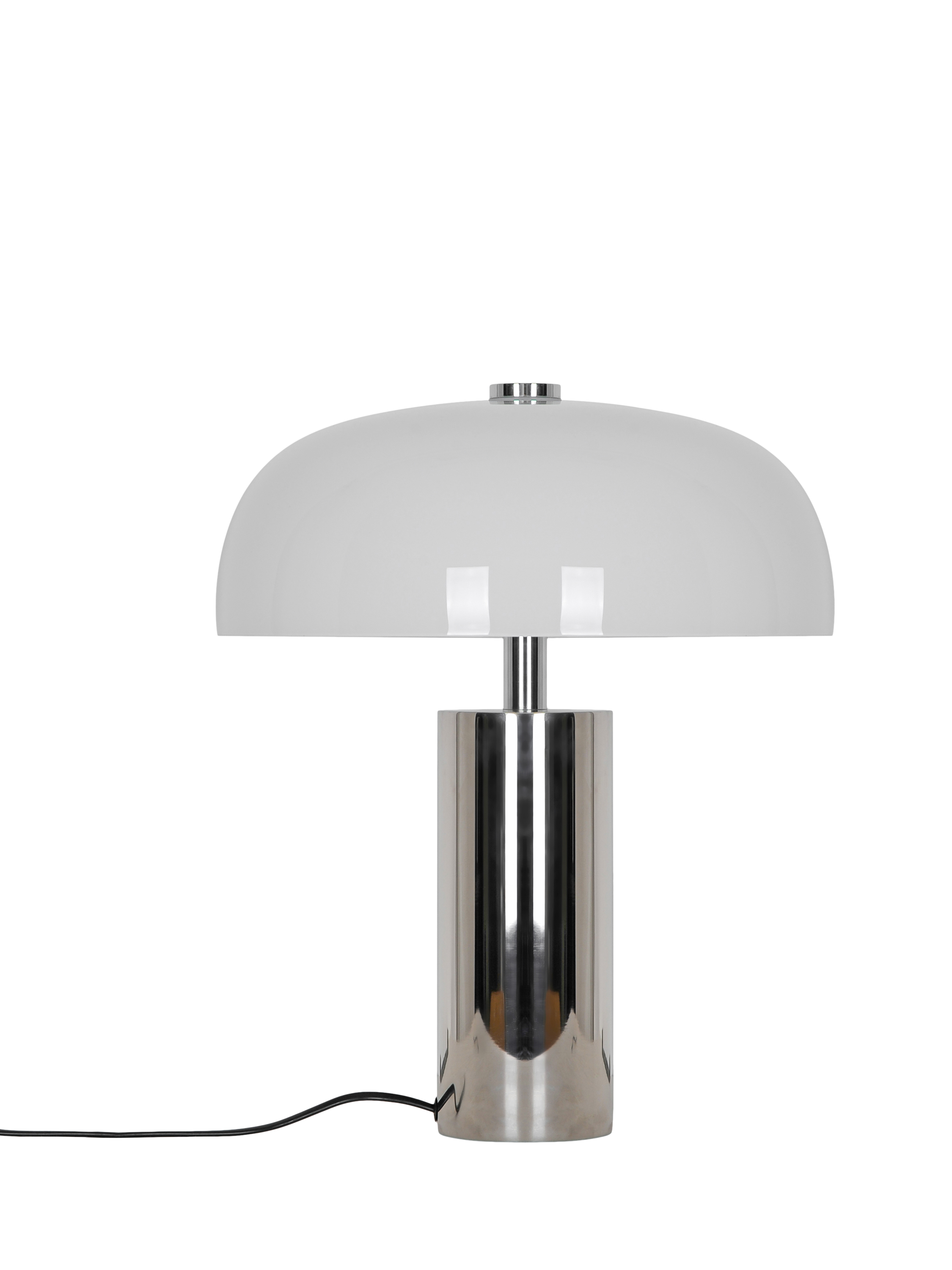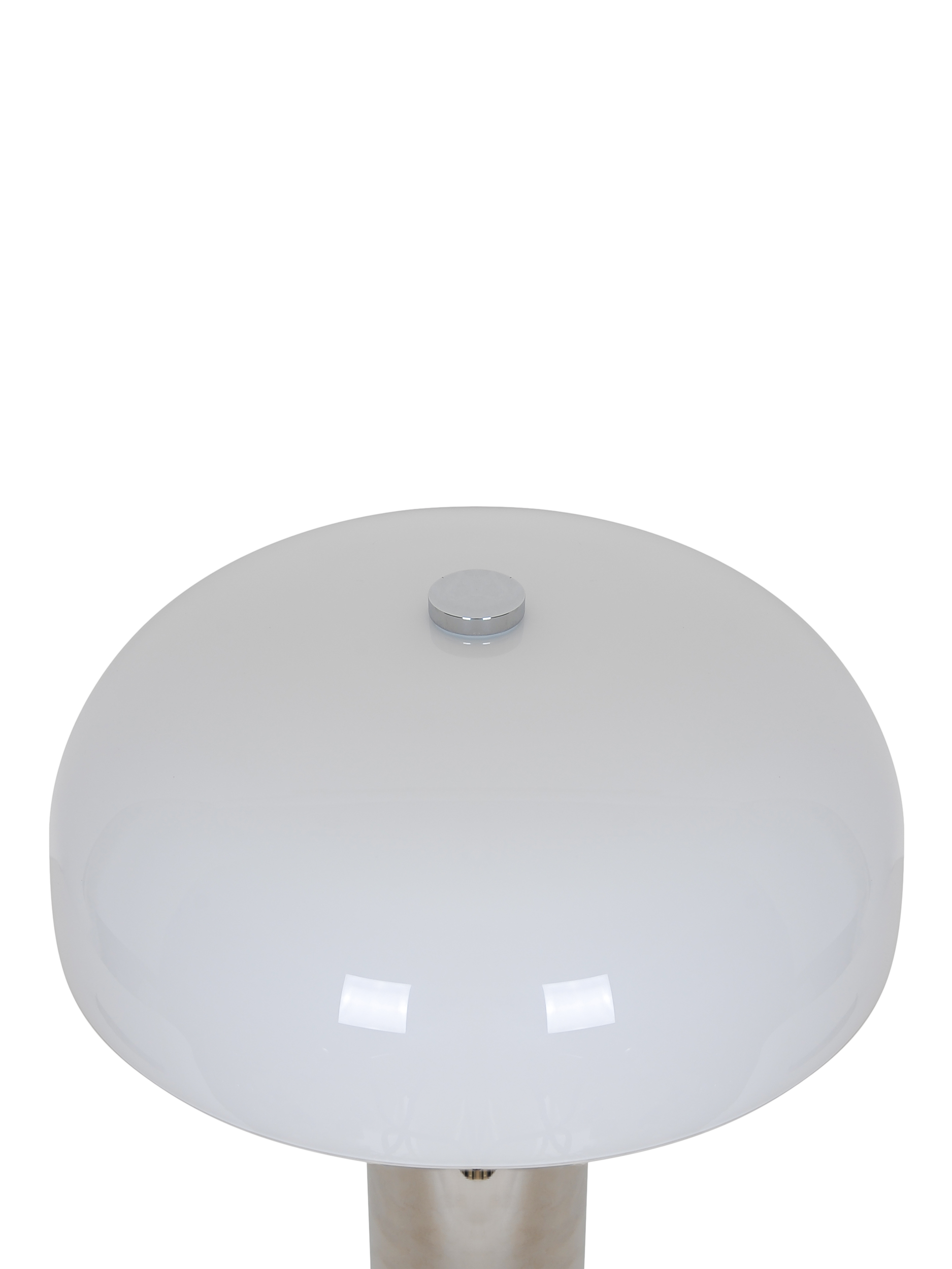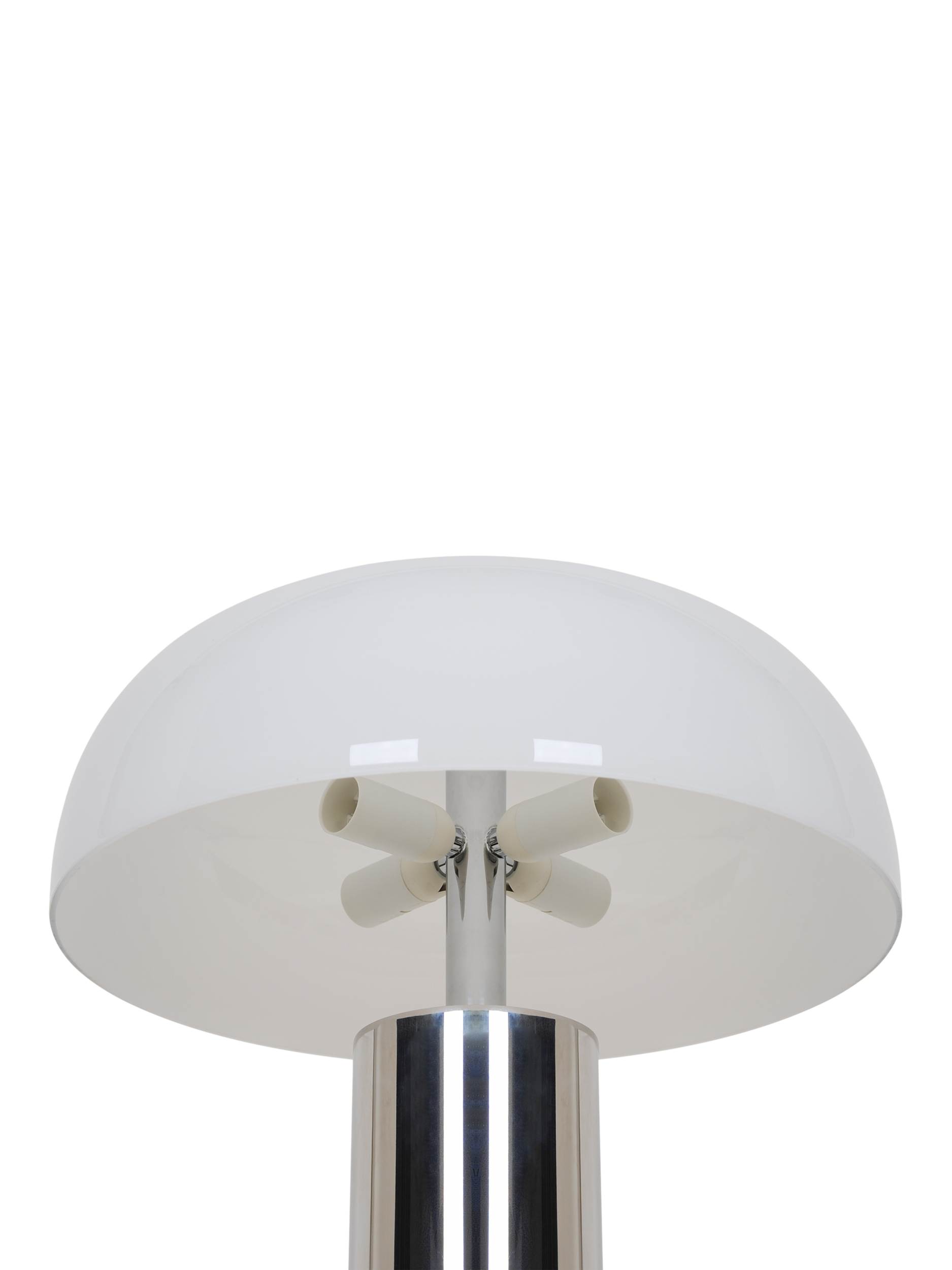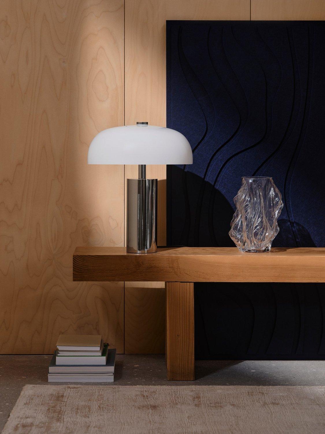 Gabrielle combines shiny chrome with shiny opal glass in an elegant mix of materials. The large opal shade gives the lamp a sculptural expression while providing a soft, diffused light that complements the glossy chrome base.