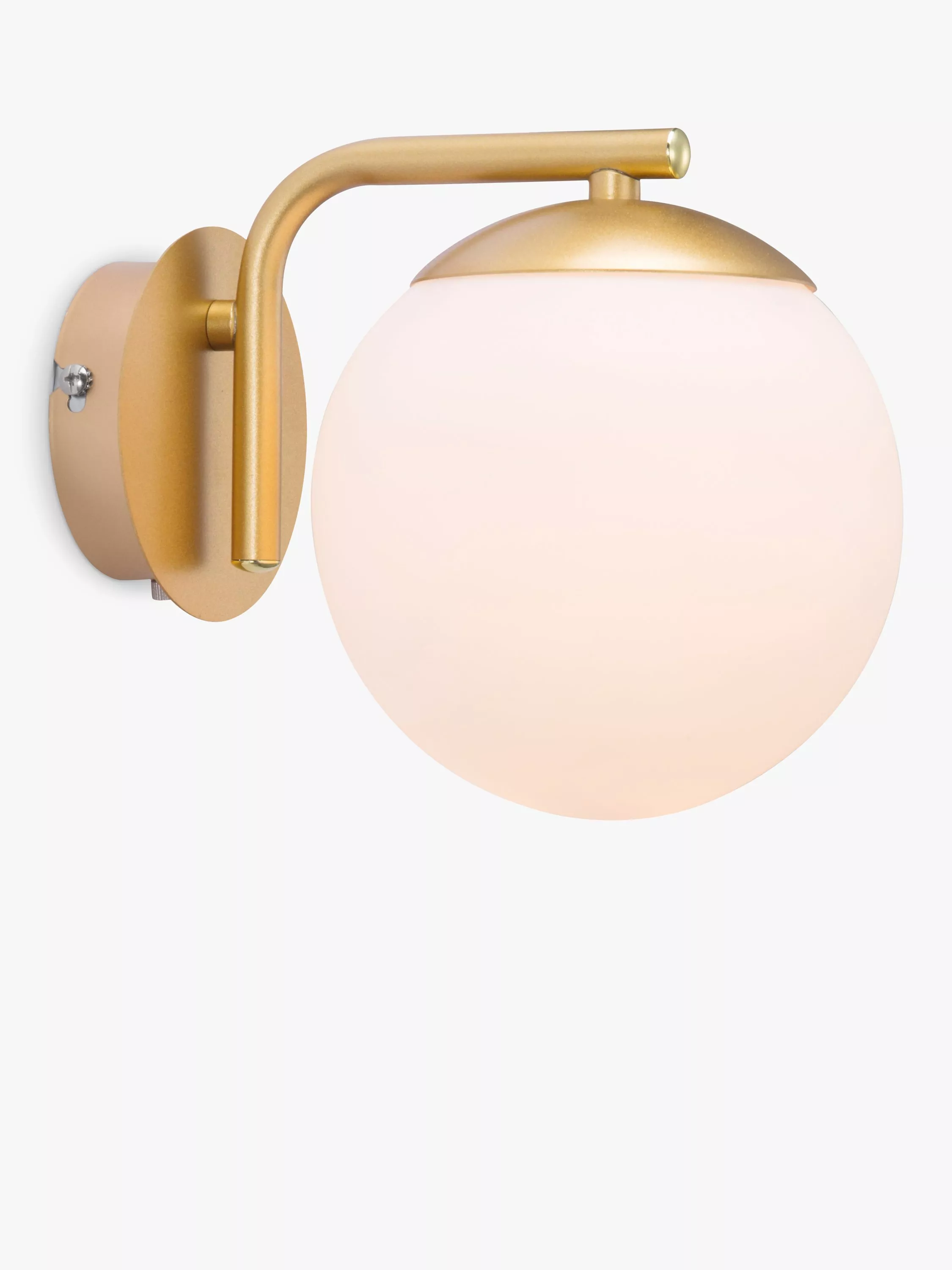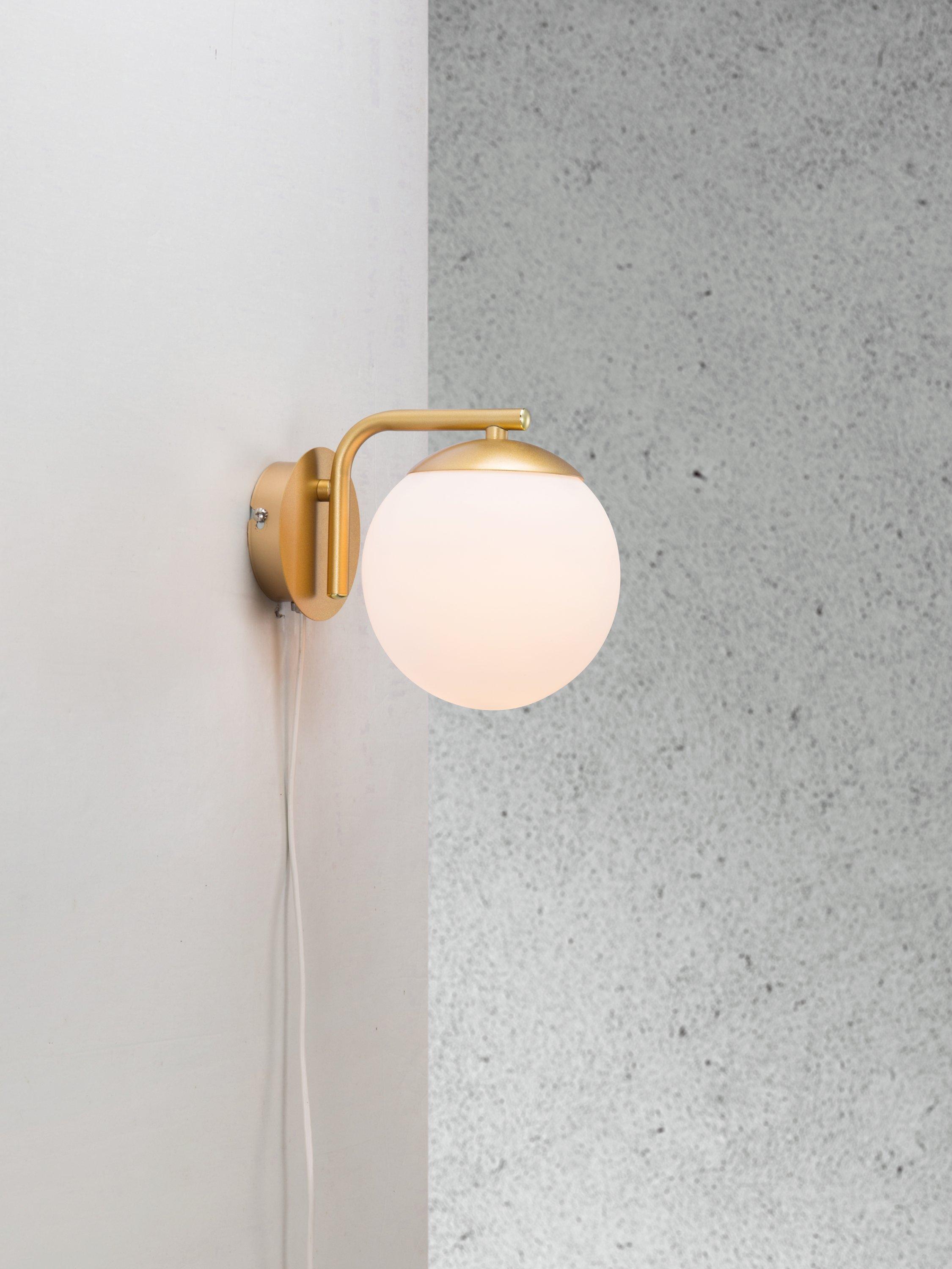 The brass-finished metal of this elegant wall light gives it a subtle, Deco-inspired look. It features an opal white glass shade that will enhance a warm and diffused glow of light. Install it on either side of your bed frame for a decorative and functional lighting solution.