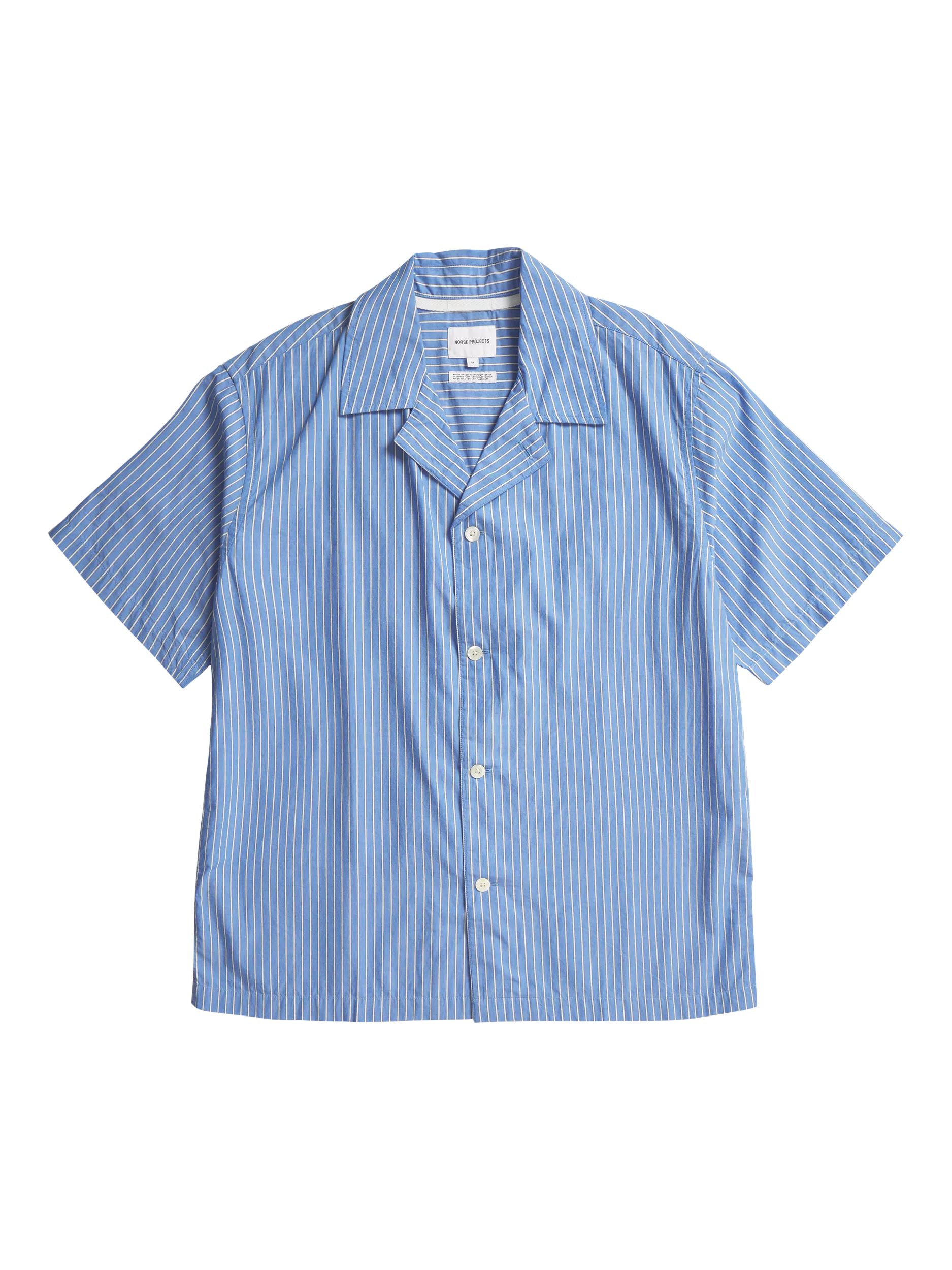 A short-sleeve shirt with an open collar and a relaxed, oversized fit, crafted from lightweight cotton poplin that has been washed for a soft, casual feel. Designed with a yarn-dyed stripe, it features two chest pockets and is finished with Mother of Pearl buttons.