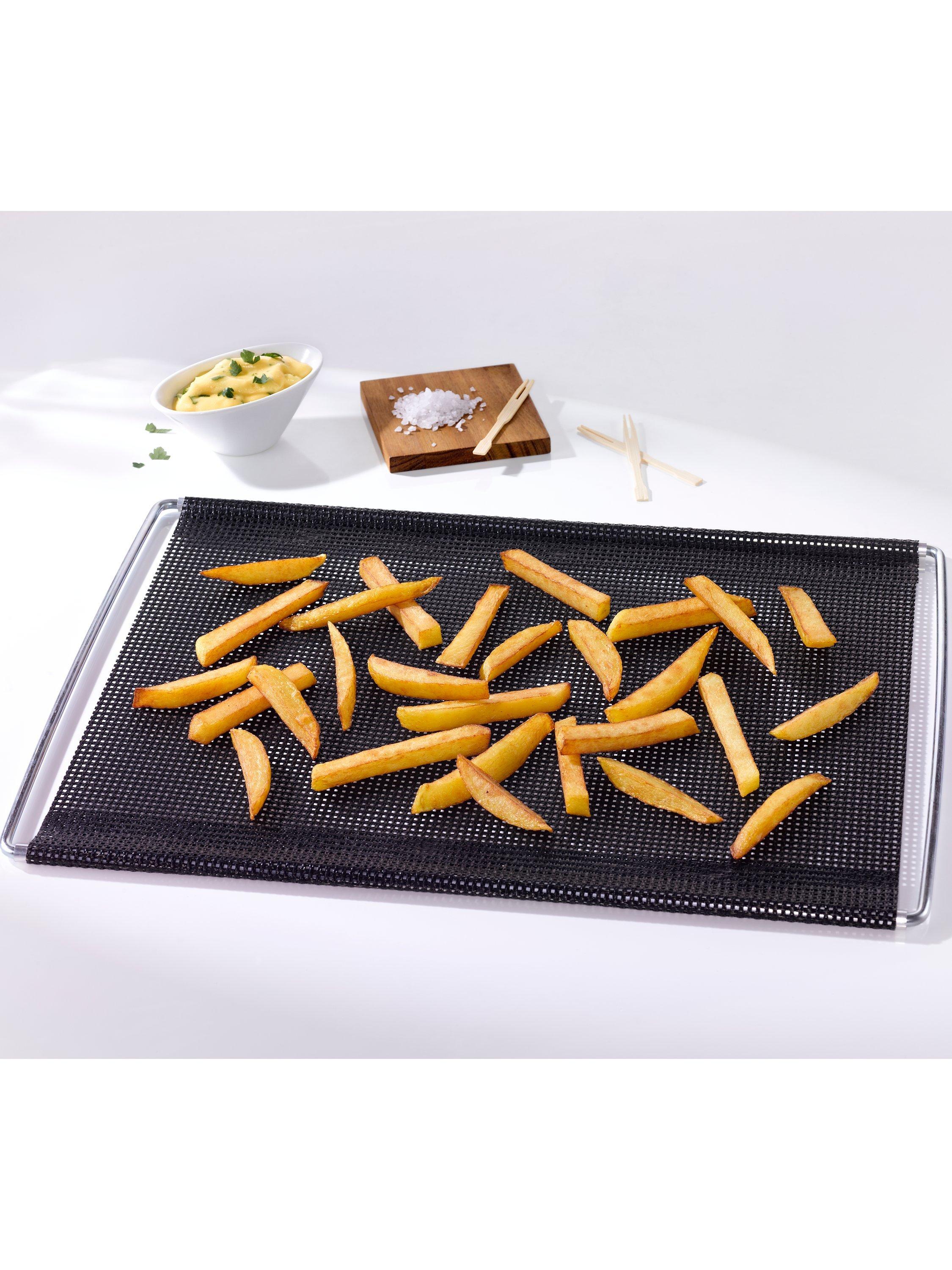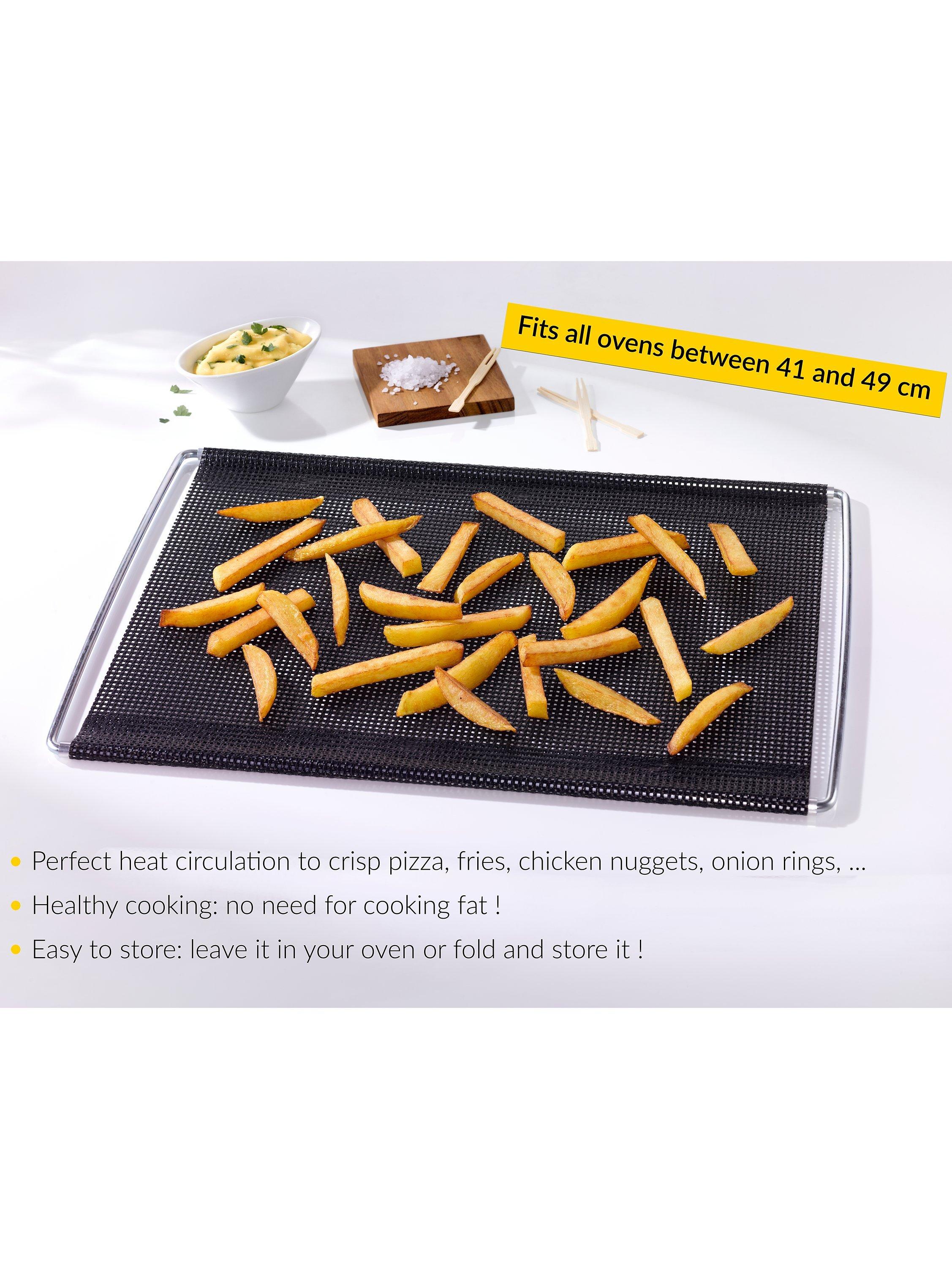 The NoStik® Extendable Crisper is the perfect surface for crisping all types of foods in your oven such as pizza, French fries, cheese sticks, hors d'oeuvres and so much more. The mesh opening ensure an optimum hot air circulation resulting in food crisped to perfectness. The NoStik® Extendable Crisper Mat fits all ovens while the handles are extendable in order to fit oven width between 41 and 49 centimetres.