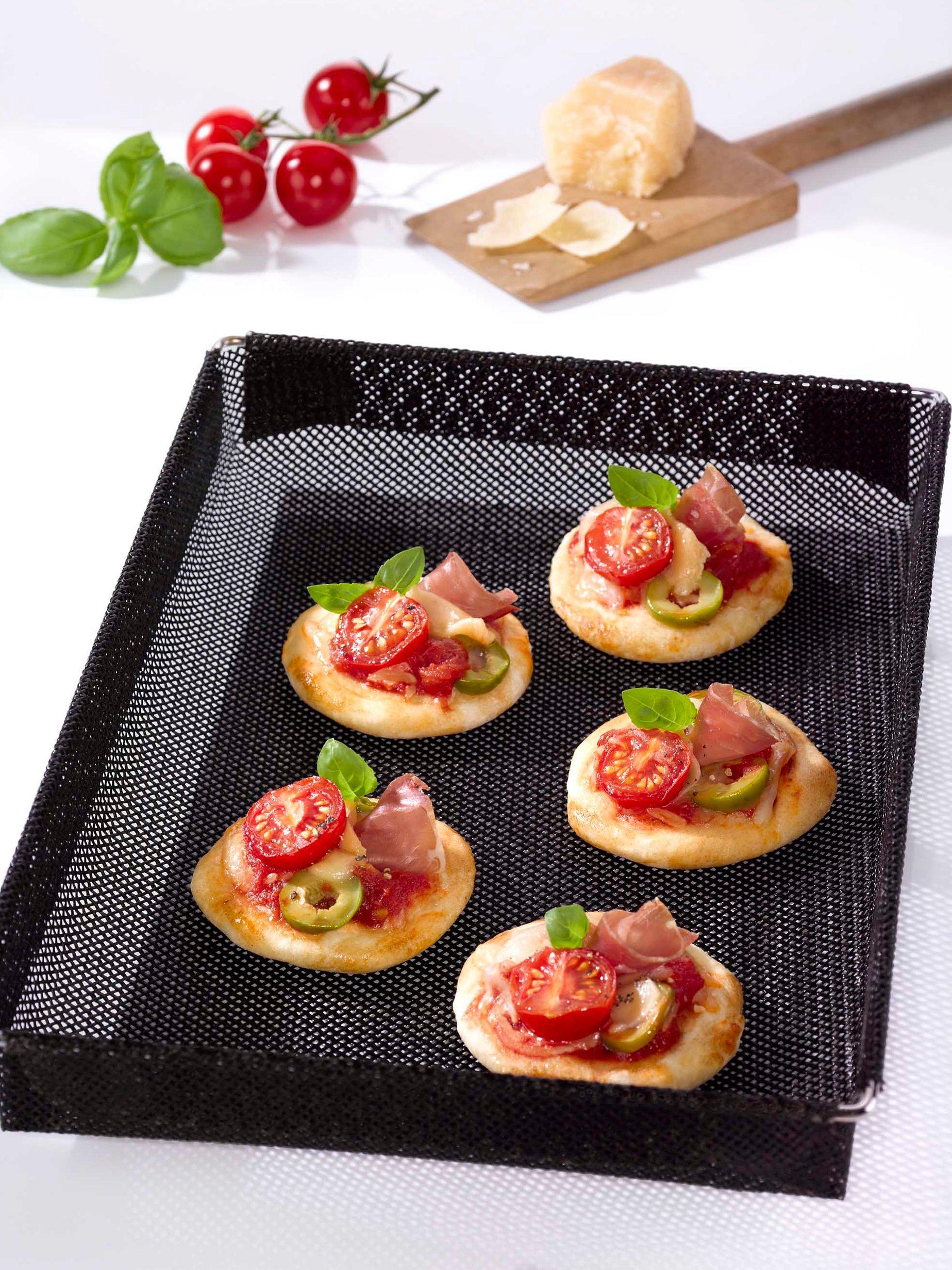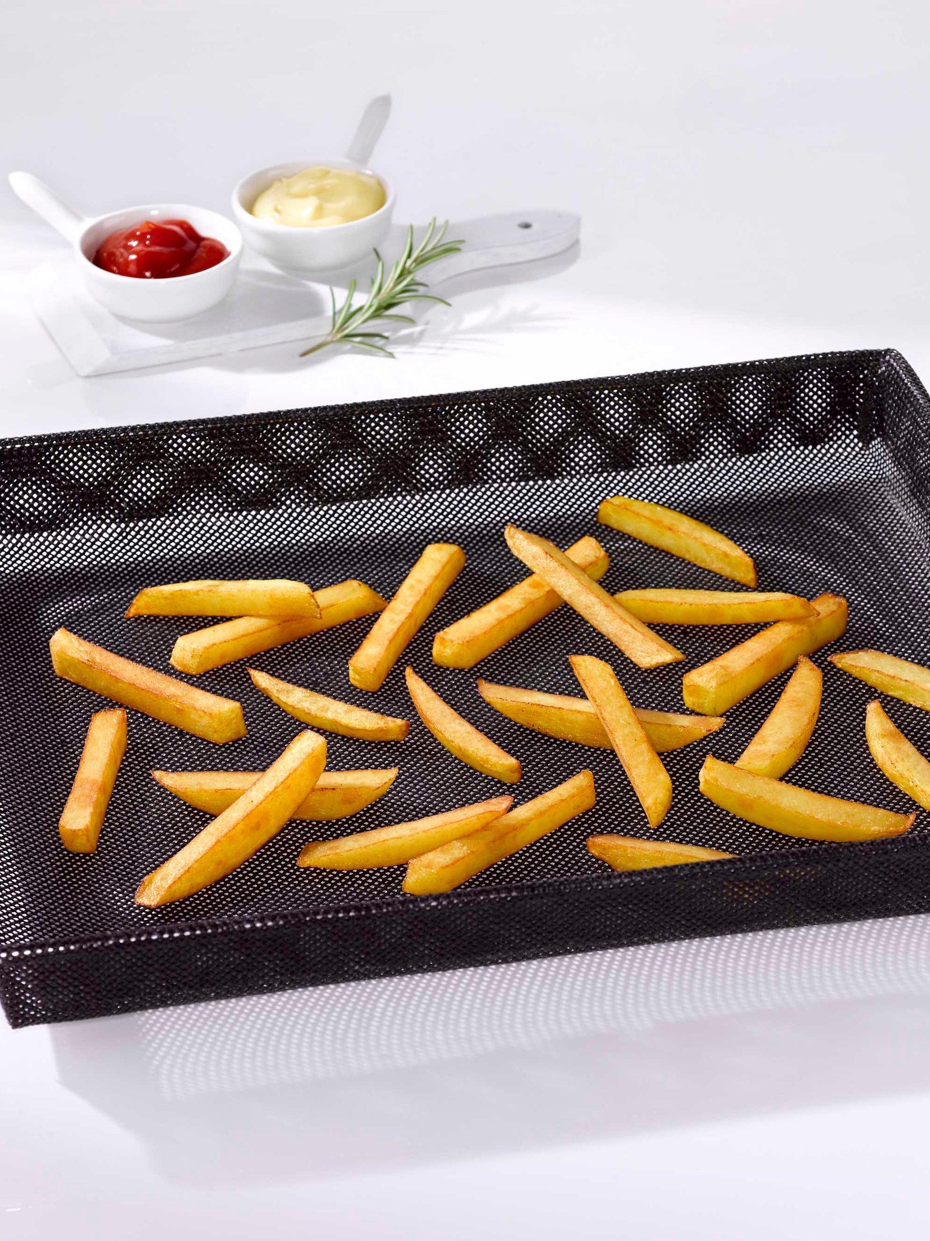 The Nostik® Crisper Basket is ideal for the preparation of oven chips, nuggets, pizzas, onion rings and more, without having to use butter or cooking fat. The grill openings allow optimum hot air circulation and thanks to the non-stick coating, the food will never stick to the crisper basket.