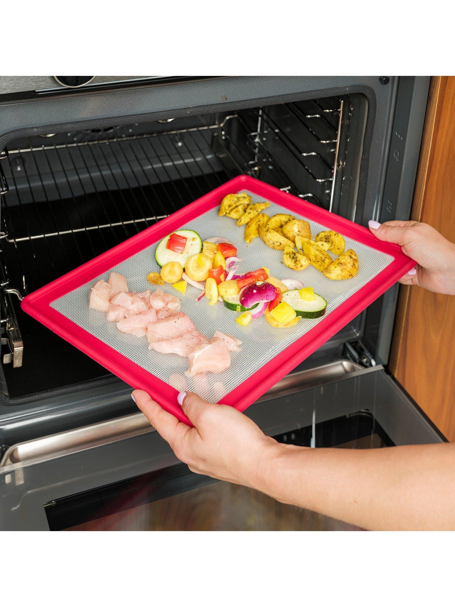 Silicone mat for oven baking, made with reinforced edges to guarantee stability. The raised edges prevent liquids from overflowing. This 3-in-1 design is ideal for food preparation, baking, and serving. Easy to store and clean, it's dishwasher-safe.